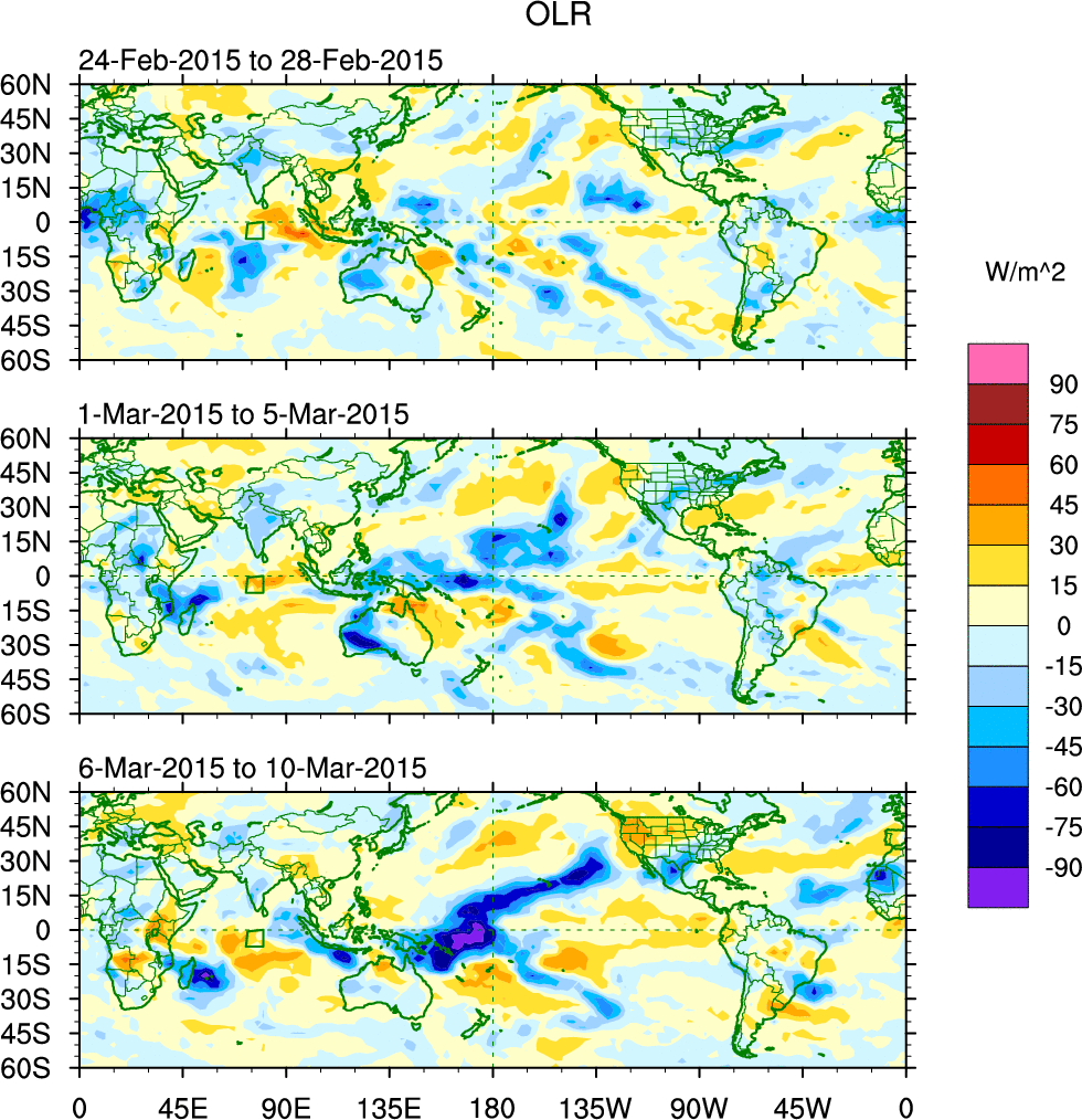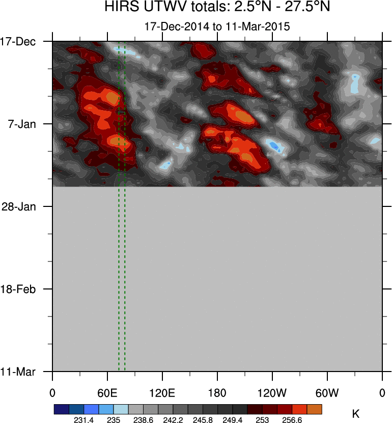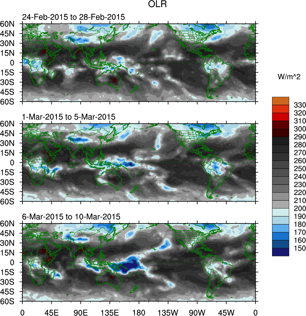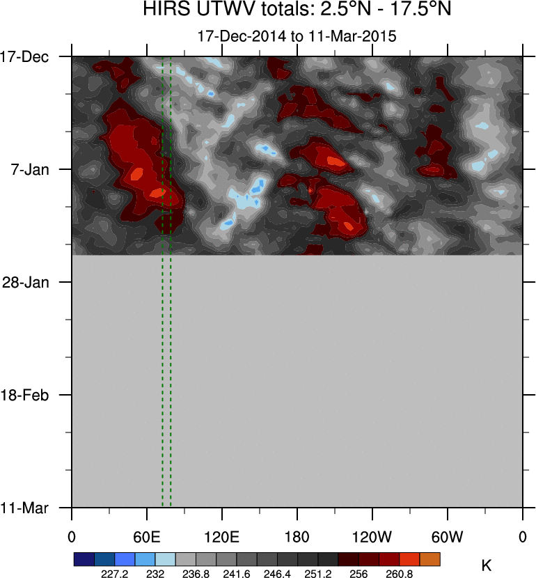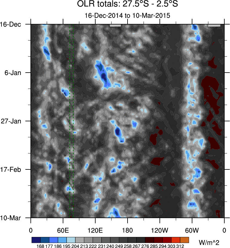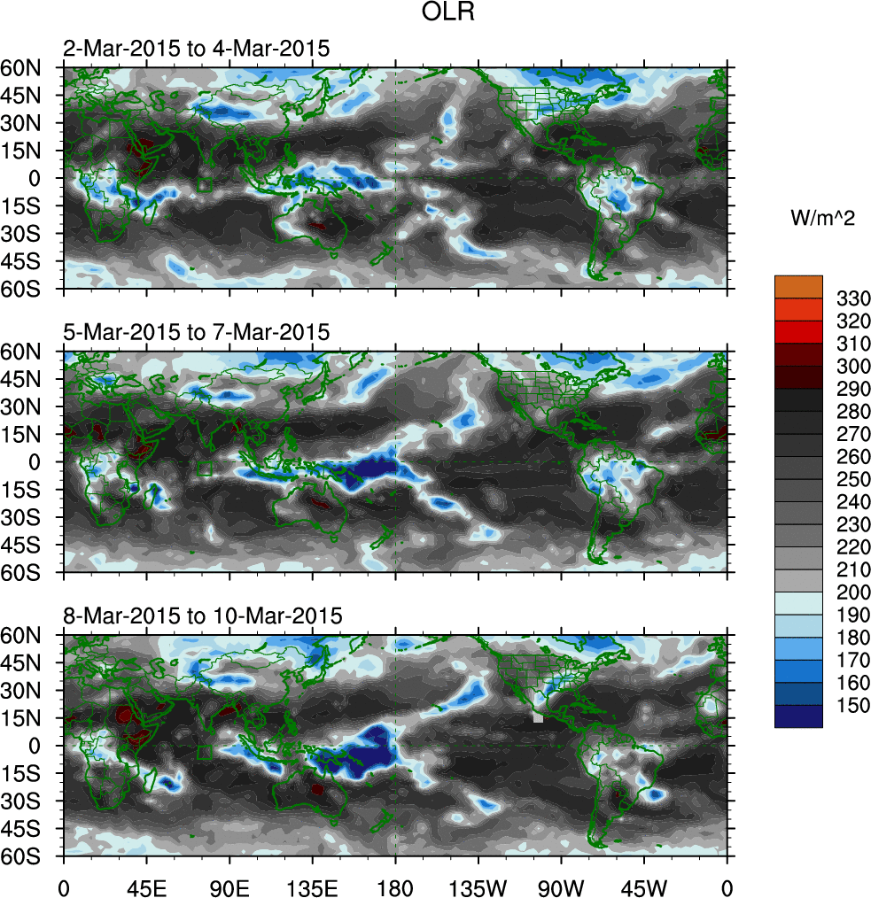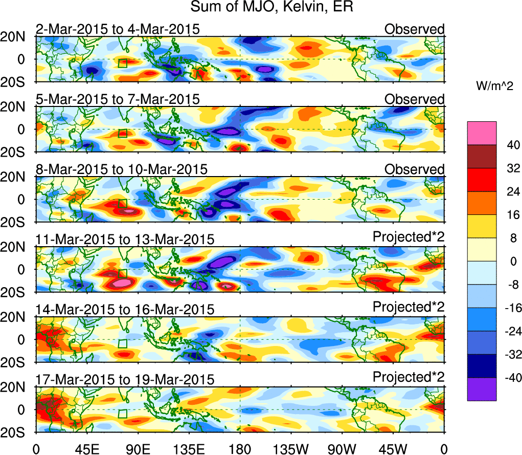 To identify tropical waves in near real-time, the OLR and UTWV data are filtered following Wheeler & Weickmann (2001 MWR). The daily anomalies are calculated using the first 3 harmonics of the seasonal cycle for 1979–2009. Missing values are then filled using linear interpolation in space and time. The most recent 365 days of anomalies are padded with 659 days of zeroes, and the result is filtered for each wave type.