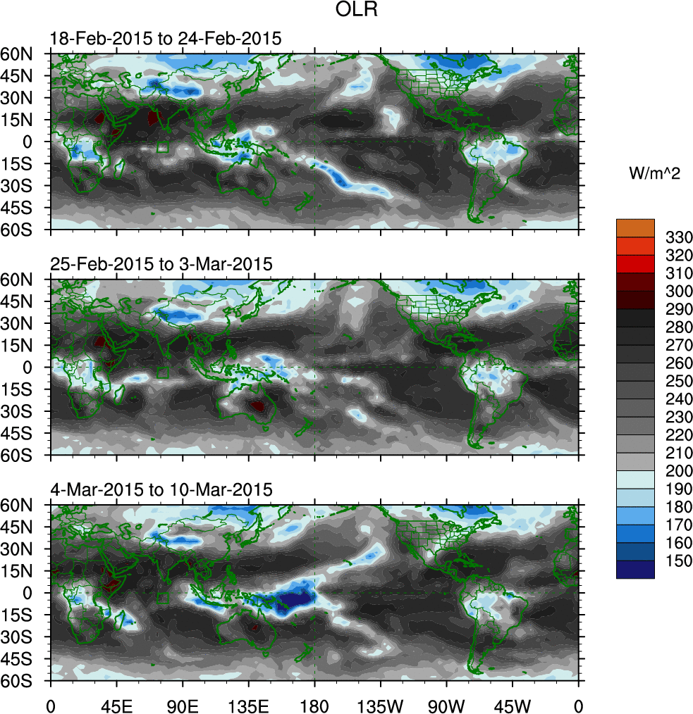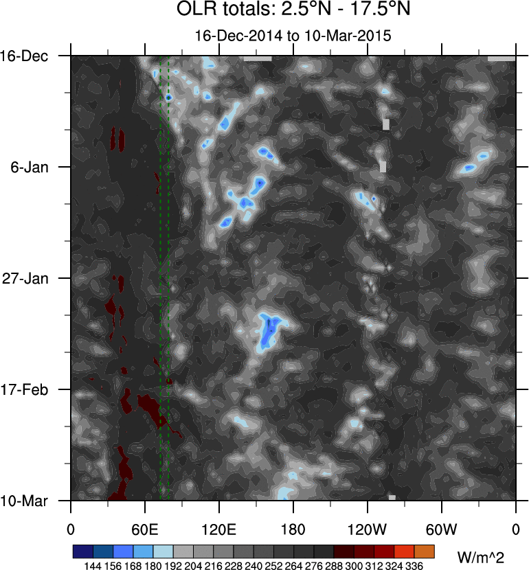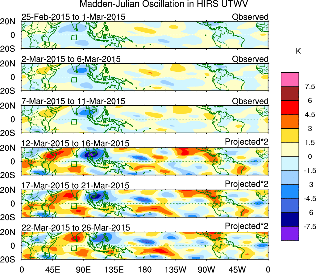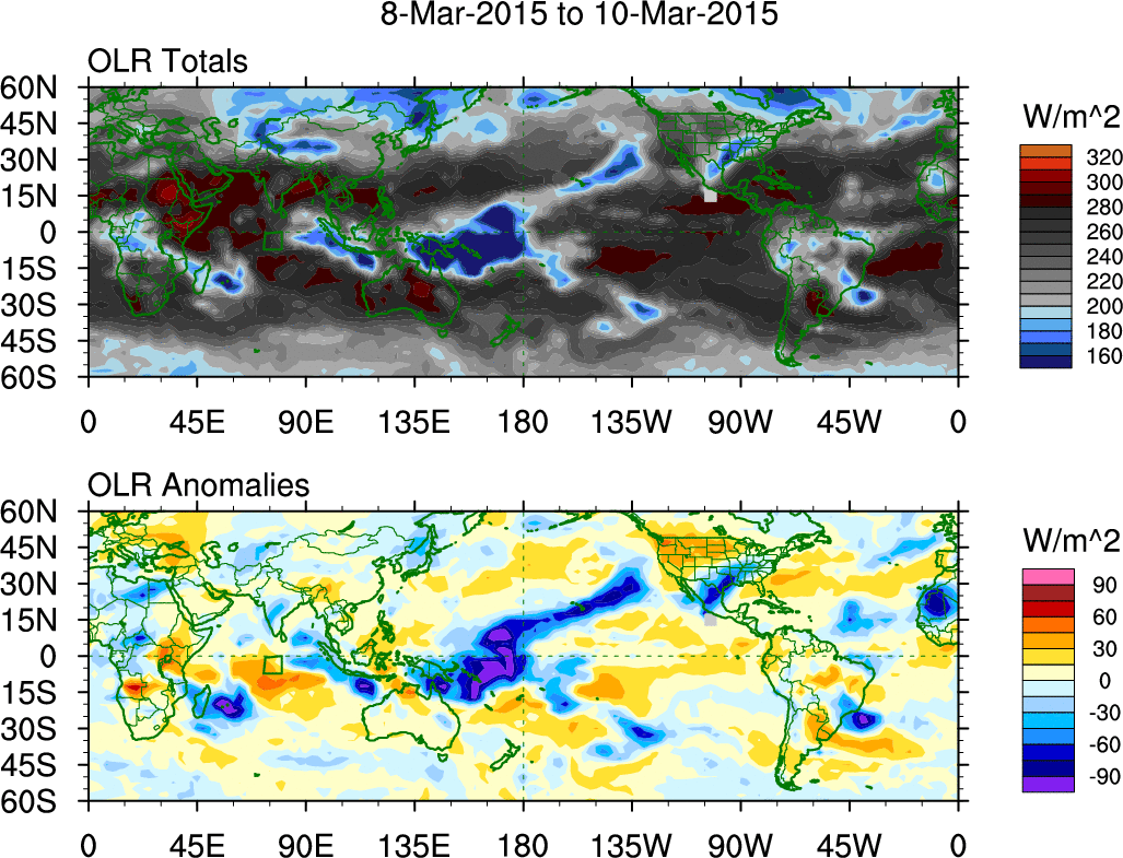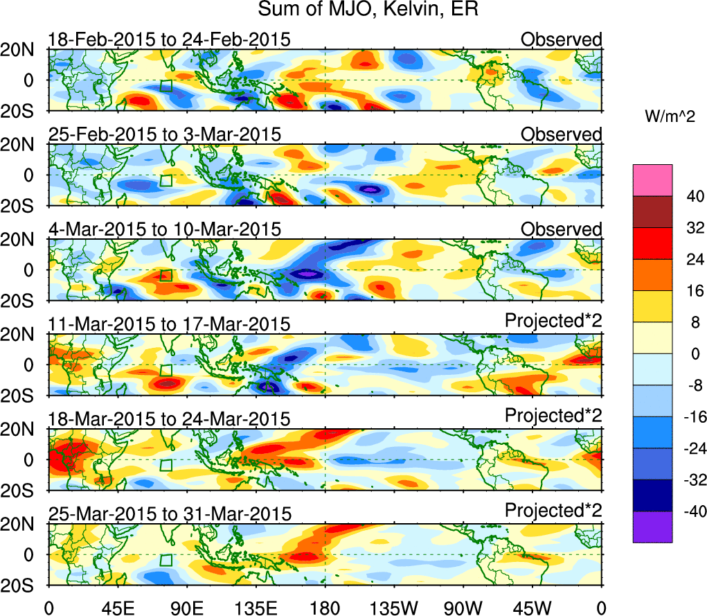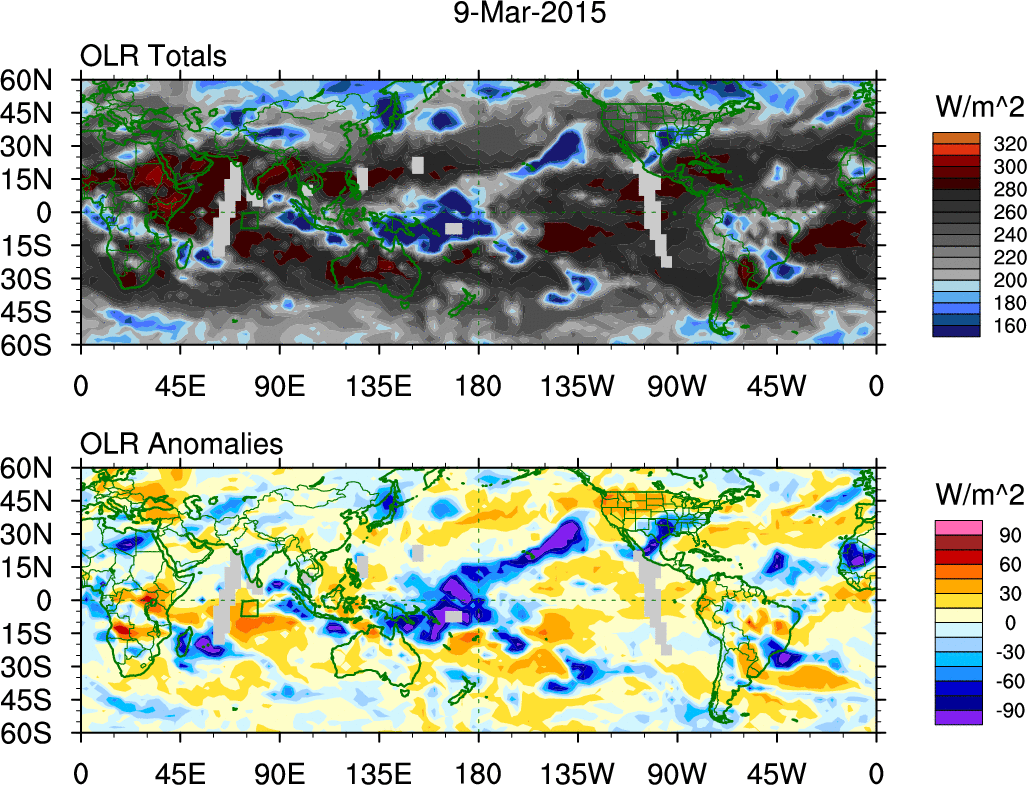 To identify tropical waves in near real-time, the OLR and UTWV data are filtered following Wheeler & Weickmann (2001 MWR). The daily anomalies are calculated using the first 3 harmonics of the seasonal cycle for 1979–2009. Missing values are then filled using linear interpolation in space and time. The most recent 365 days of anomalies are padded with 659 days of zeroes, and the result is filtered for each wave type.