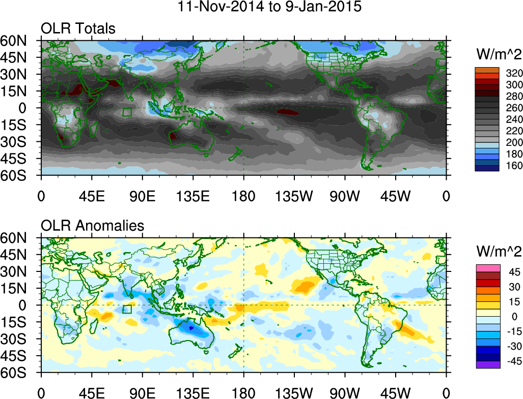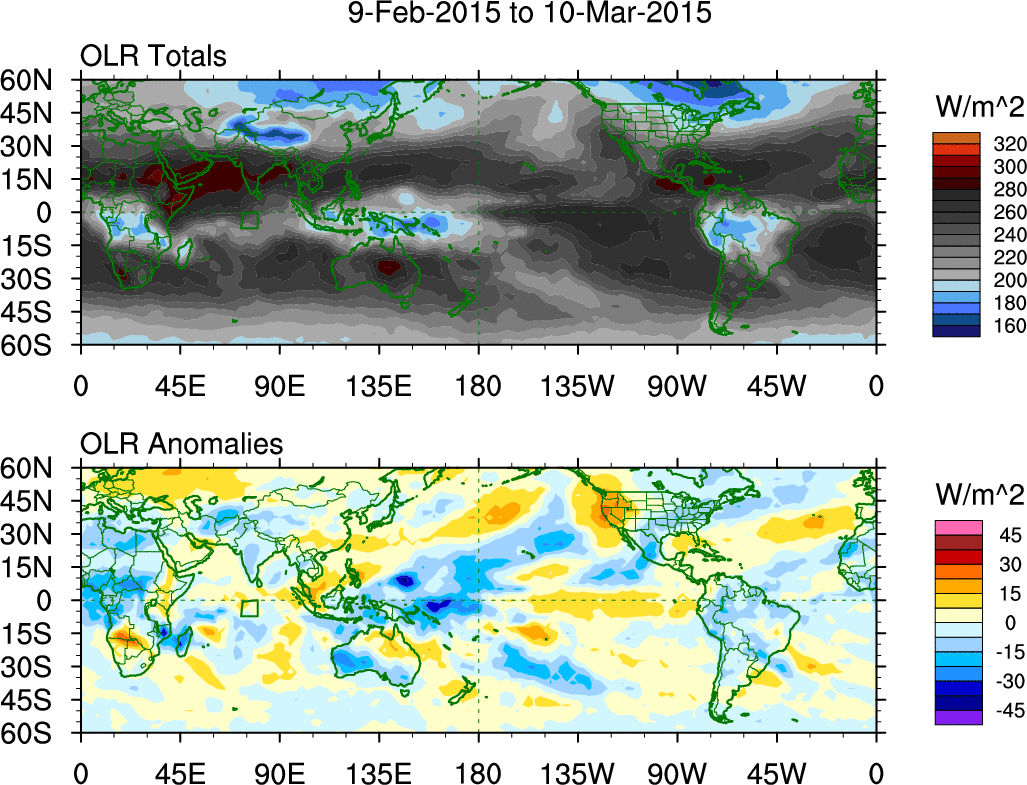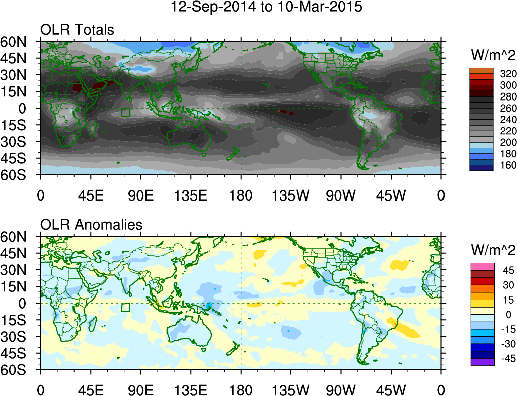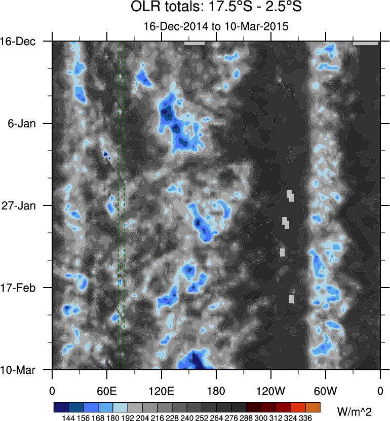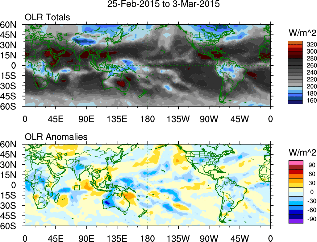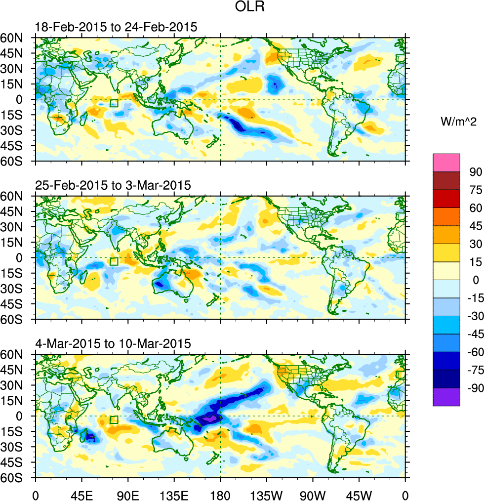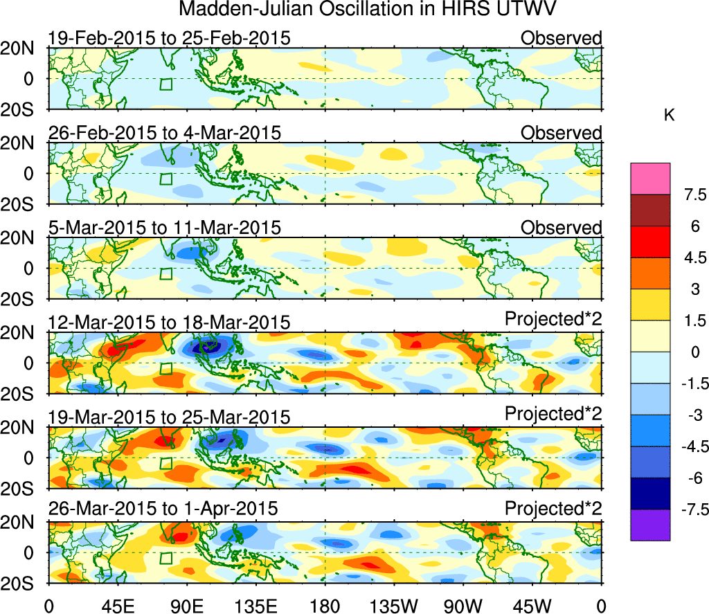 To identify tropical waves in near real-time, the OLR and UTWV data are filtered following Wheeler & Weickmann (2001 MWR). The daily anomalies are calculated using the first 3 harmonics of the seasonal cycle for 1979–2009. Missing values are then filled using linear interpolation in space and time. The most recent 365 days of anomalies are padded with 659 days of zeroes, and the result is filtered for each wave type.