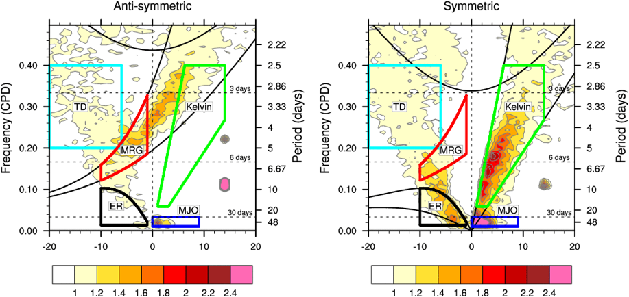The figure above shows the wavenumber—frequency spectrum for OLR, divided by an estimate of the red background following Wheeler & Kiladis (1999, JAS). The panel on the left shows signals that are anti-symmetric about the equator, while the panel on the right shows those that are symmetric. Spectral peaks tend to lie along the dispersion curves for shallow water equatorial waves (black lines).