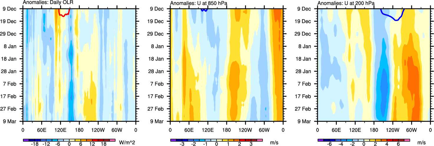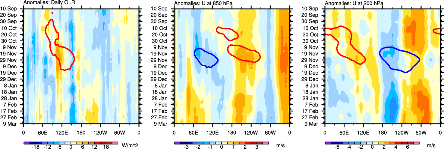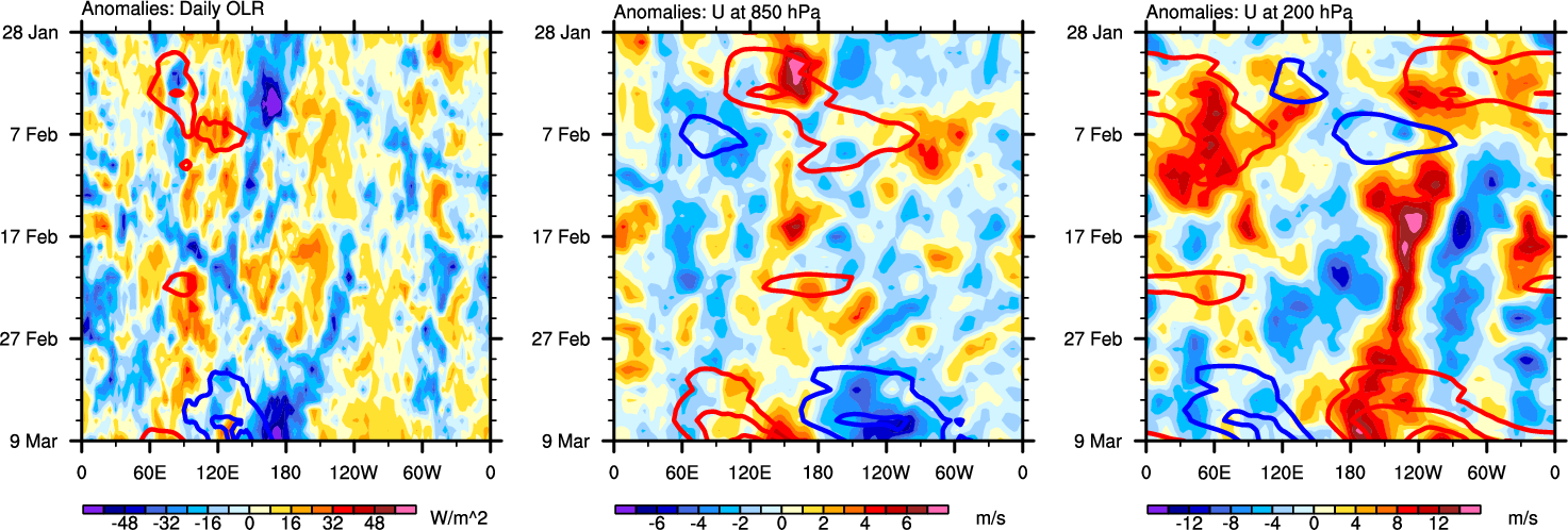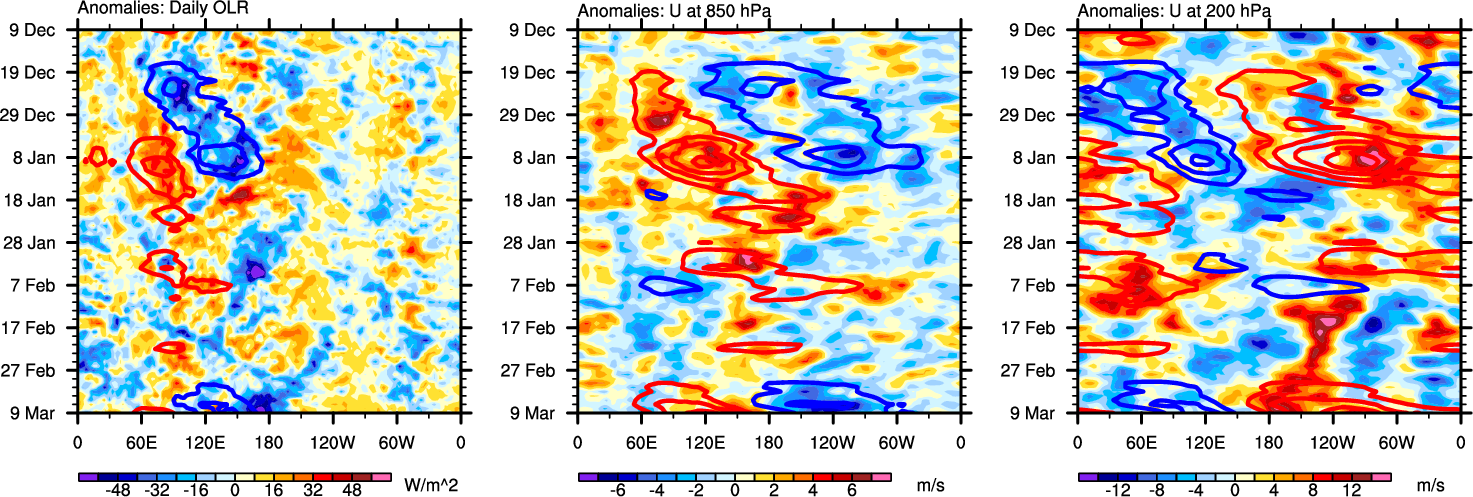 The Hovmöllers show longitude-time plots for OLR, U-850, and U-200. The shading indicates the observed anomalies, while the contours are the projection of those anomalies onto the RMM EOFs.