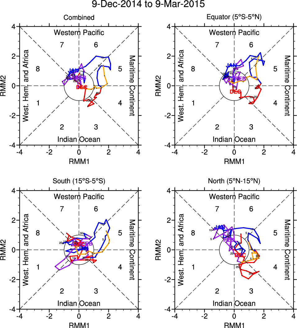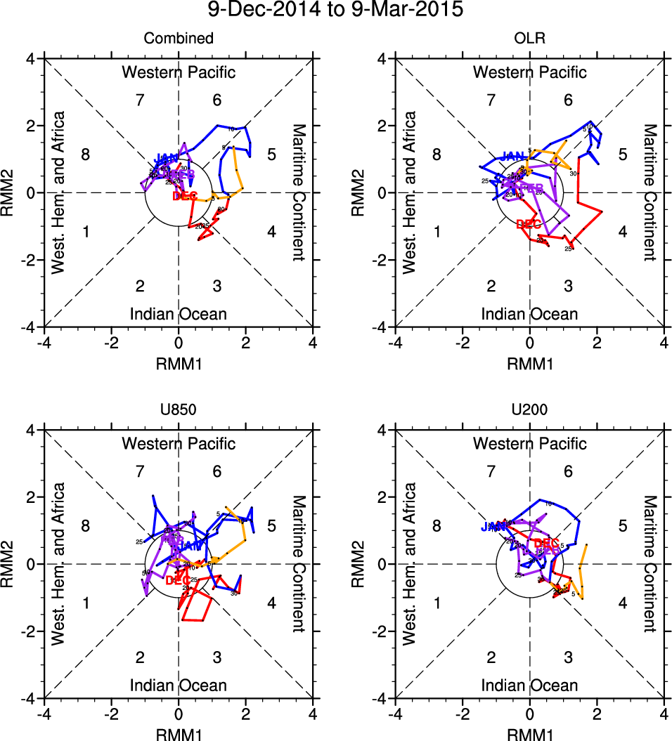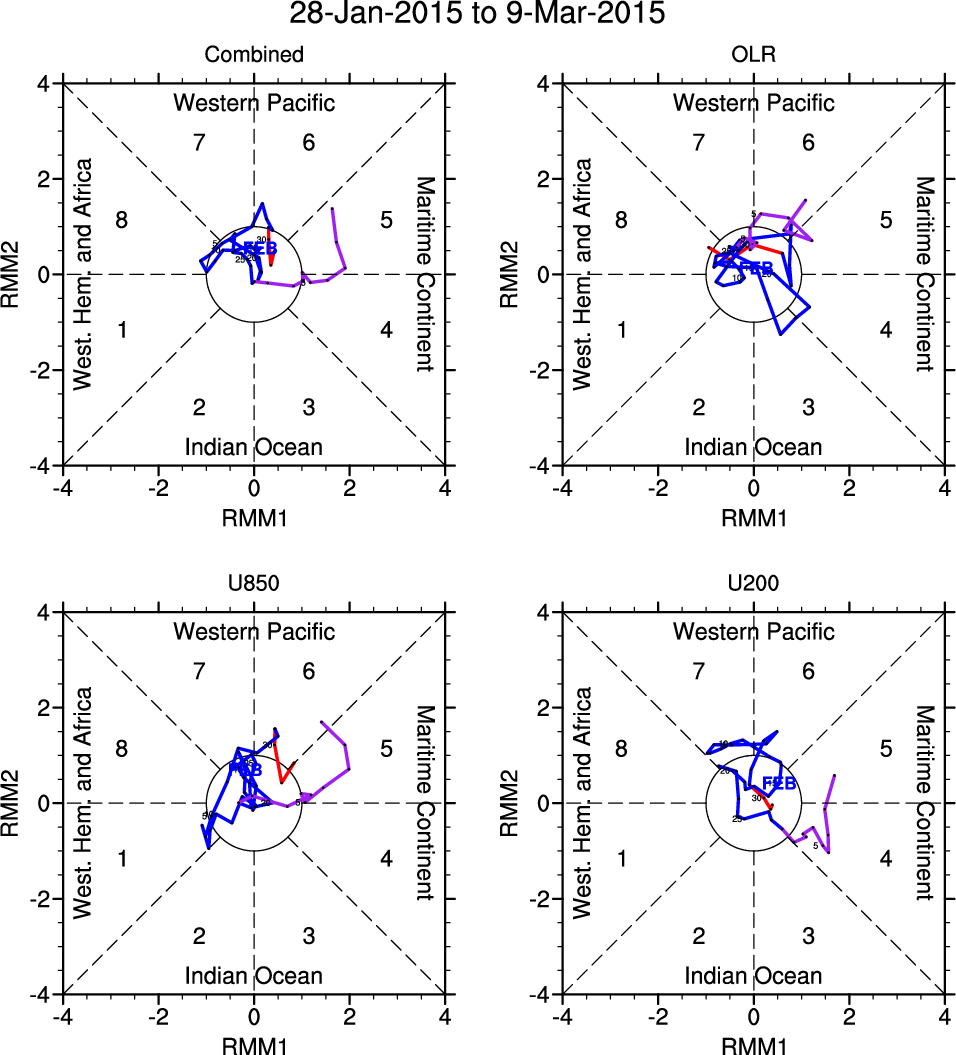 Wheeler and Hendon (2004) constructed the RMM index for monitoring the MJO. This index consists of the first two principal components (PCs) of OLR, 850-hPa zonal wind, and 200-hPa zonal wind averaged 15S-15N.