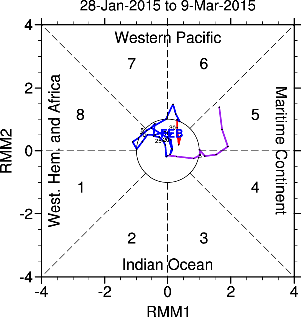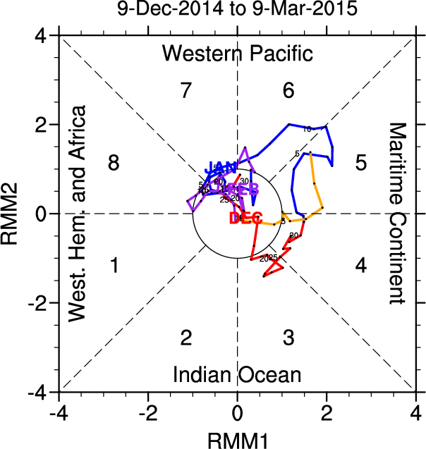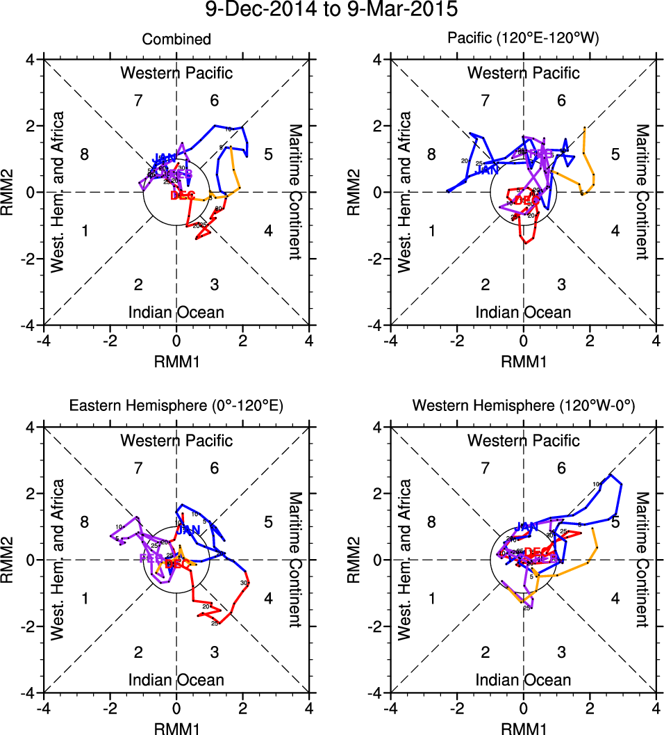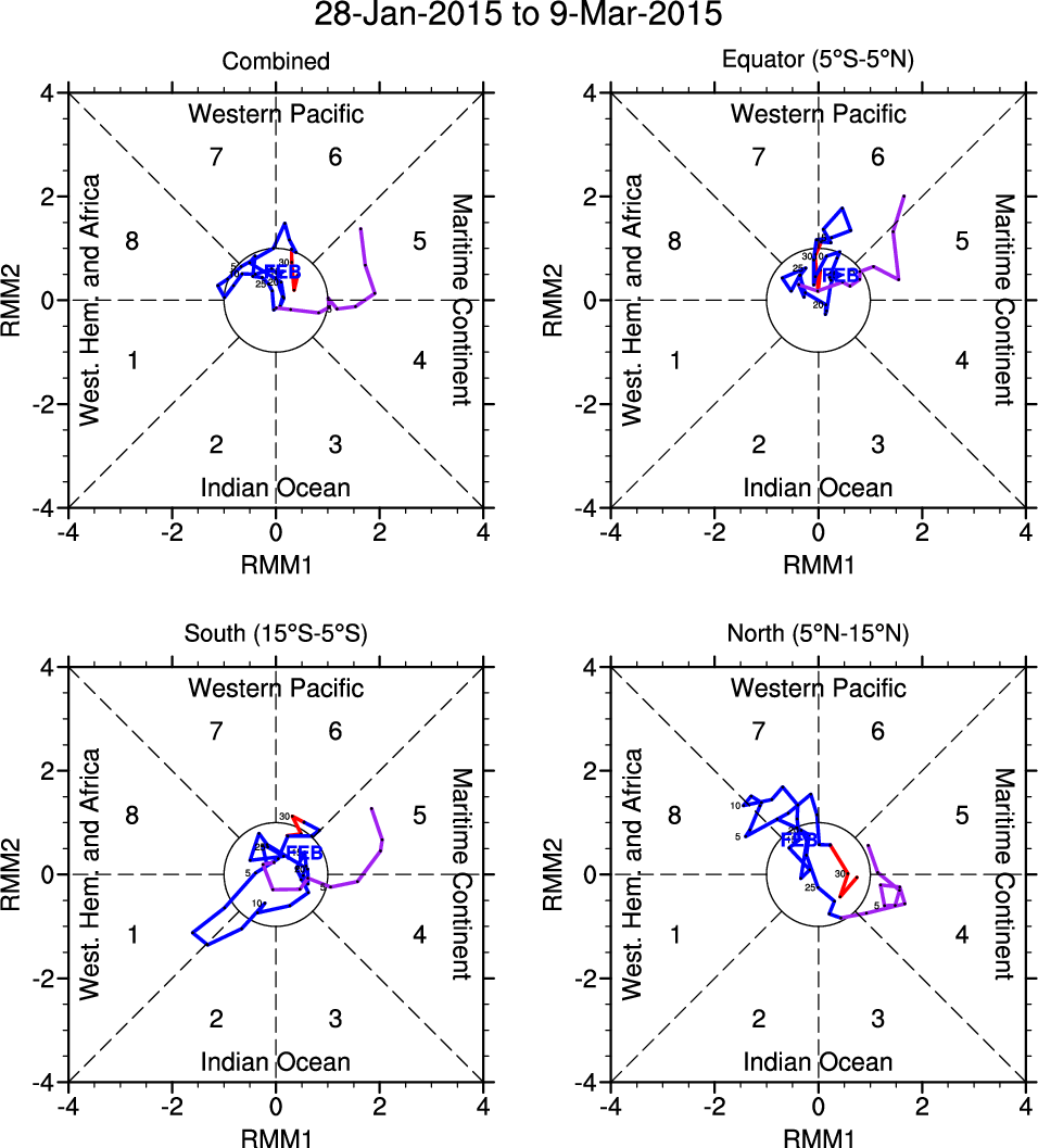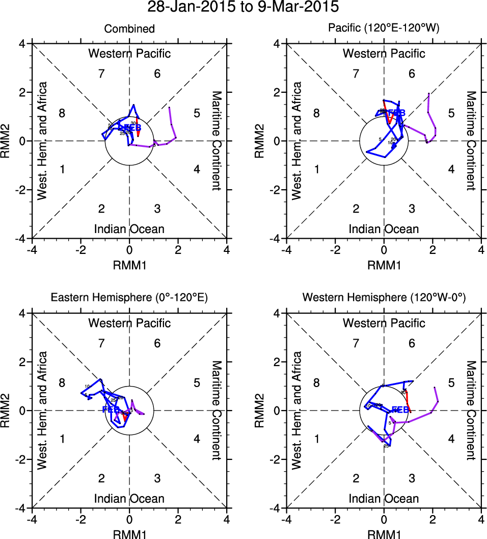 Wheeler and Hendon (2004) constructed the RMM index for monitoring the MJO. This index consists of the first two principal components (PCs) of OLR, 850-hPa zonal wind, and 200-hPa zonal wind averaged 15S-15N.