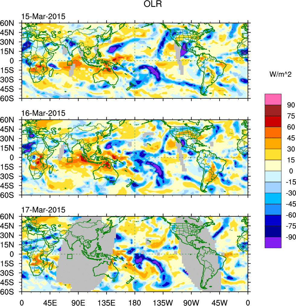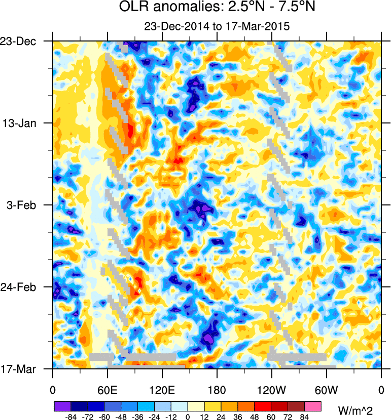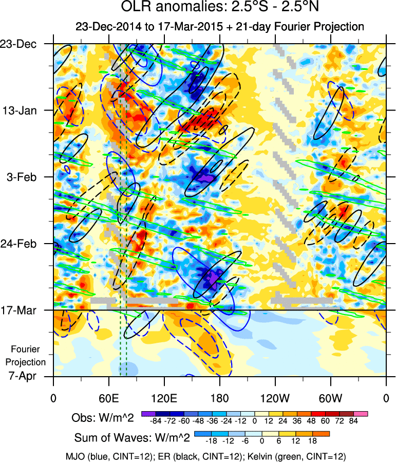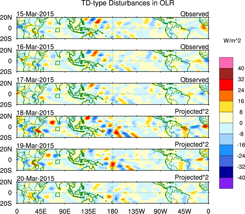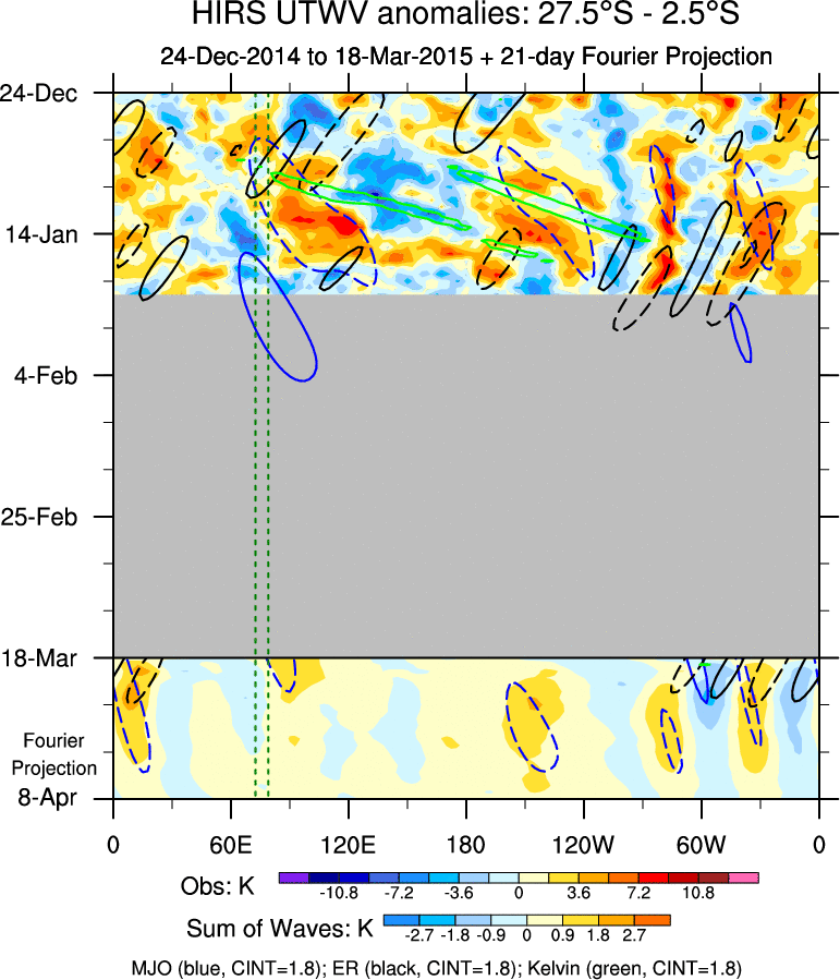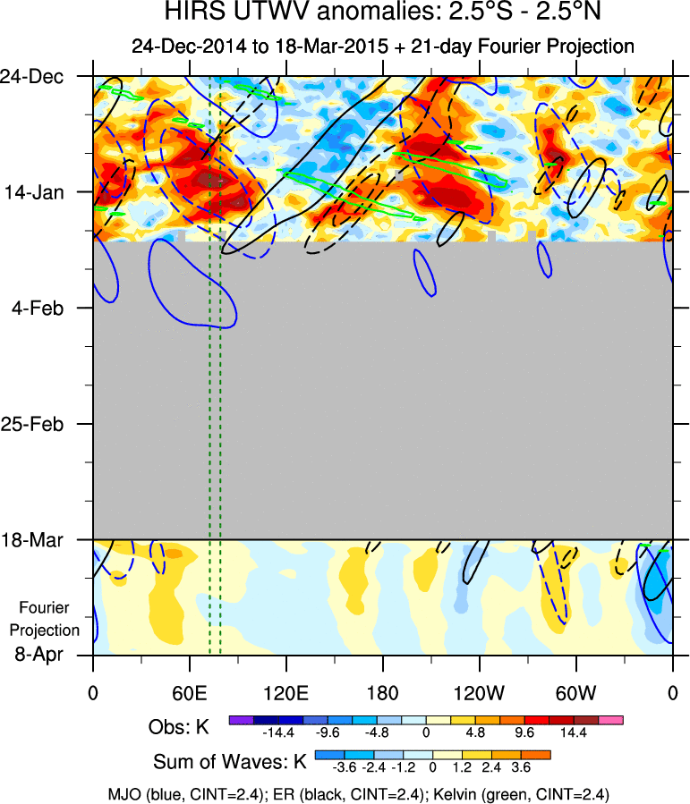 To identify tropical waves in near real-time, the OLR and UTWV data are filtered following Wheeler & Weickmann (2001 MWR). The daily anomalies are calculated using the first 3 harmonics of the seasonal cycle for 1979–2009. Missing values are then filled using linear interpolation in space and time. The most recent 365 days of anomalies are padded with 659 days of zeroes, and the result is filtered for each wave type.