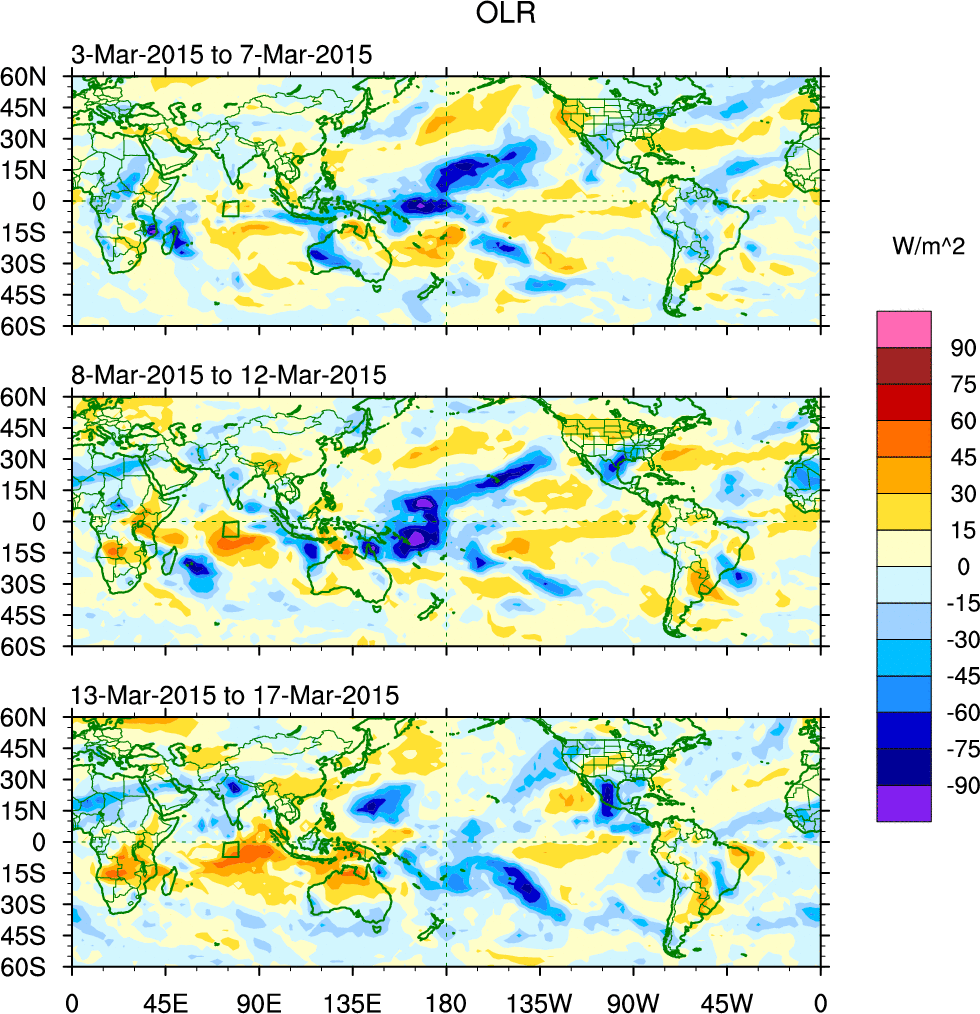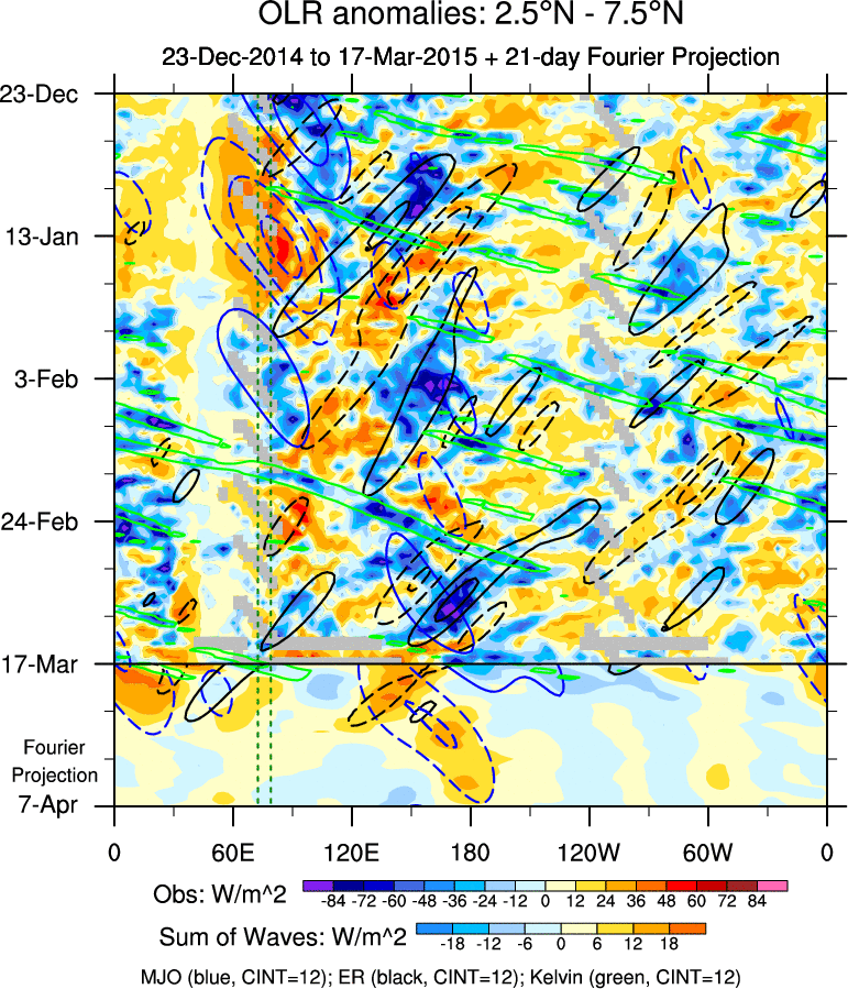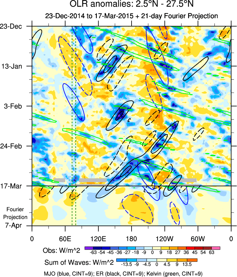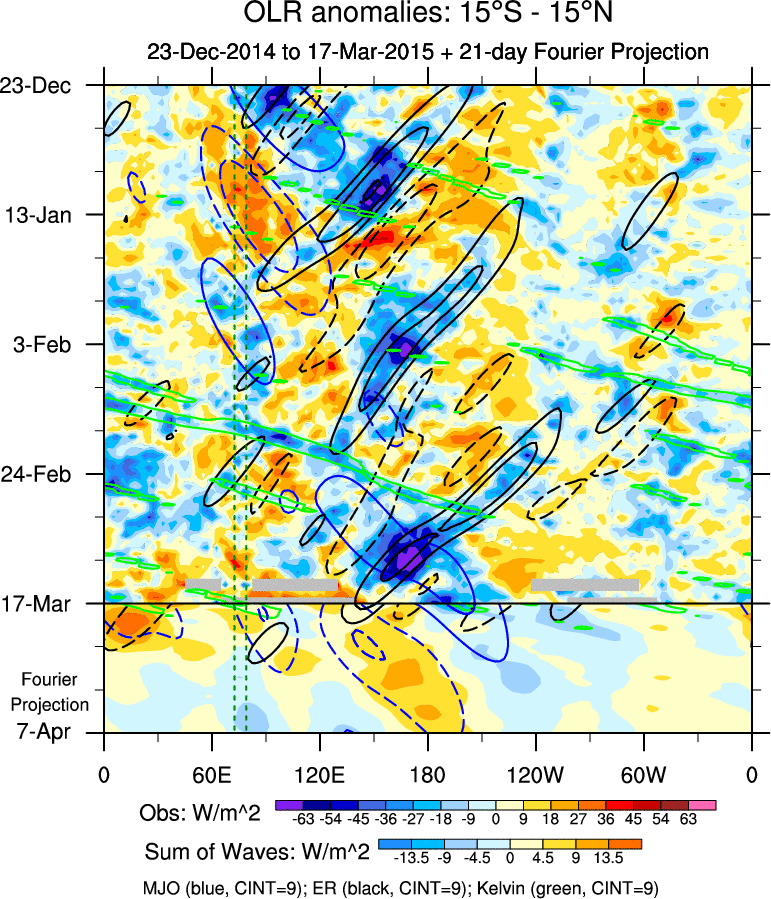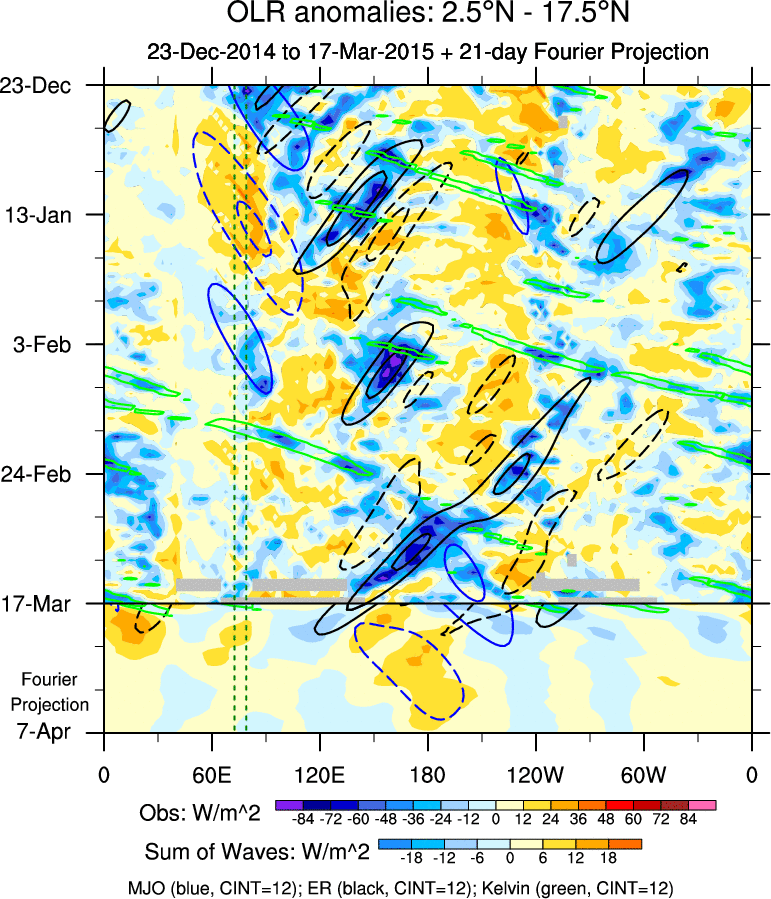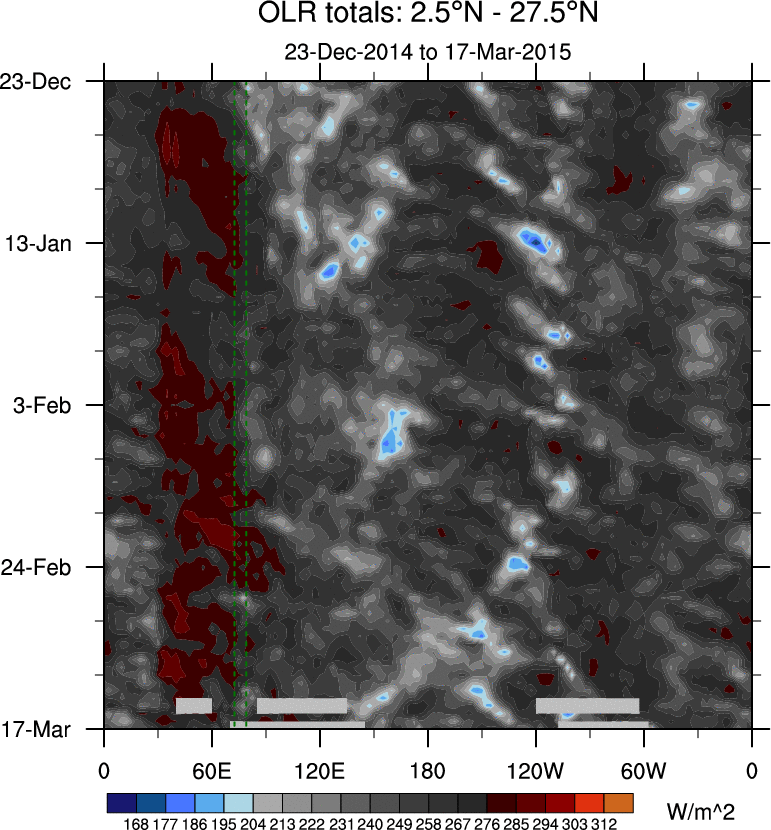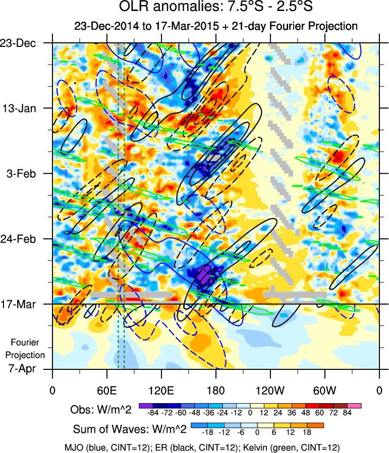 To identify tropical waves in near real-time, the OLR and UTWV data are filtered following Wheeler & Weickmann (2001 MWR). The daily anomalies are calculated using the first 3 harmonics of the seasonal cycle for 1979–2009. Missing values are then filled using linear interpolation in space and time. The most recent 365 days of anomalies are padded with 659 days of zeroes, and the result is filtered for each wave type.
