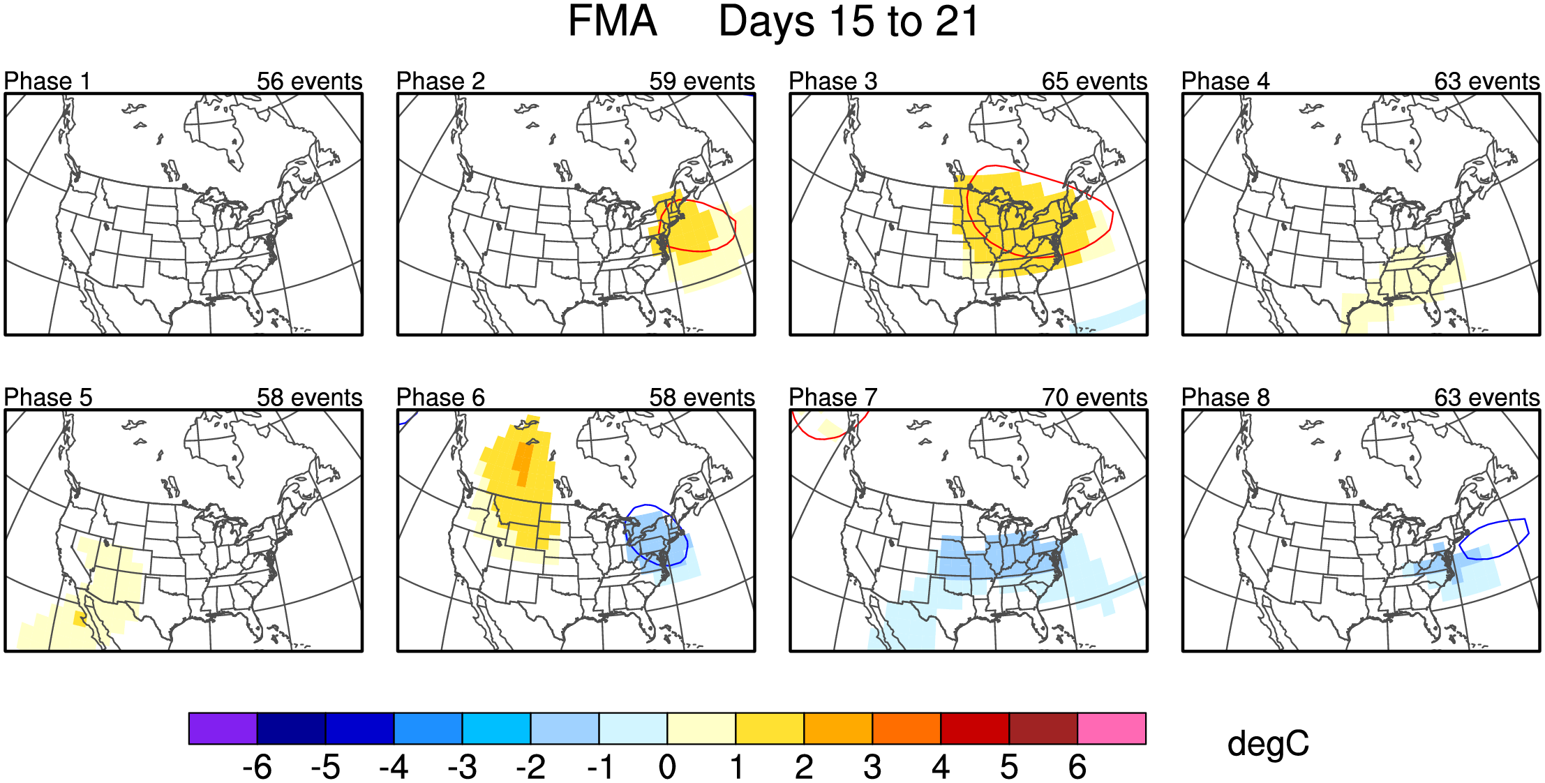Maps of 500-hPa geopotential height anomalies (contoured every 30 m) and significant 850-hPa temperature anomalies, as shown in Schreck et al. (2013).