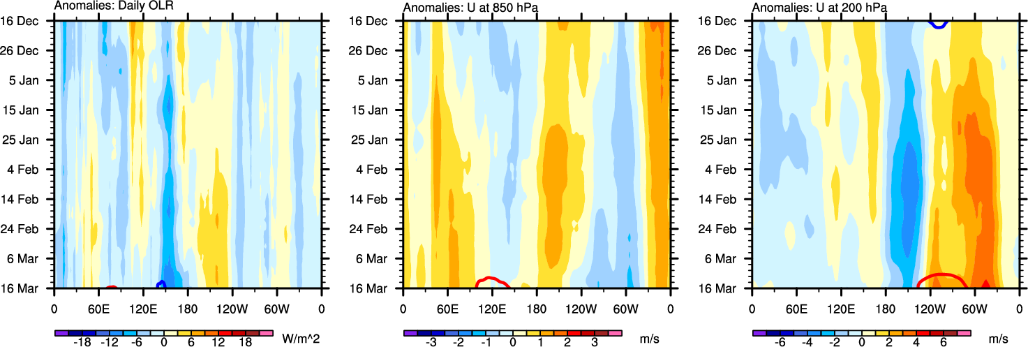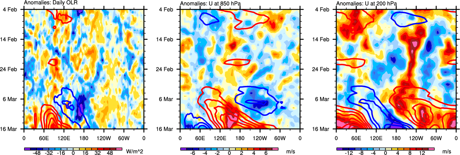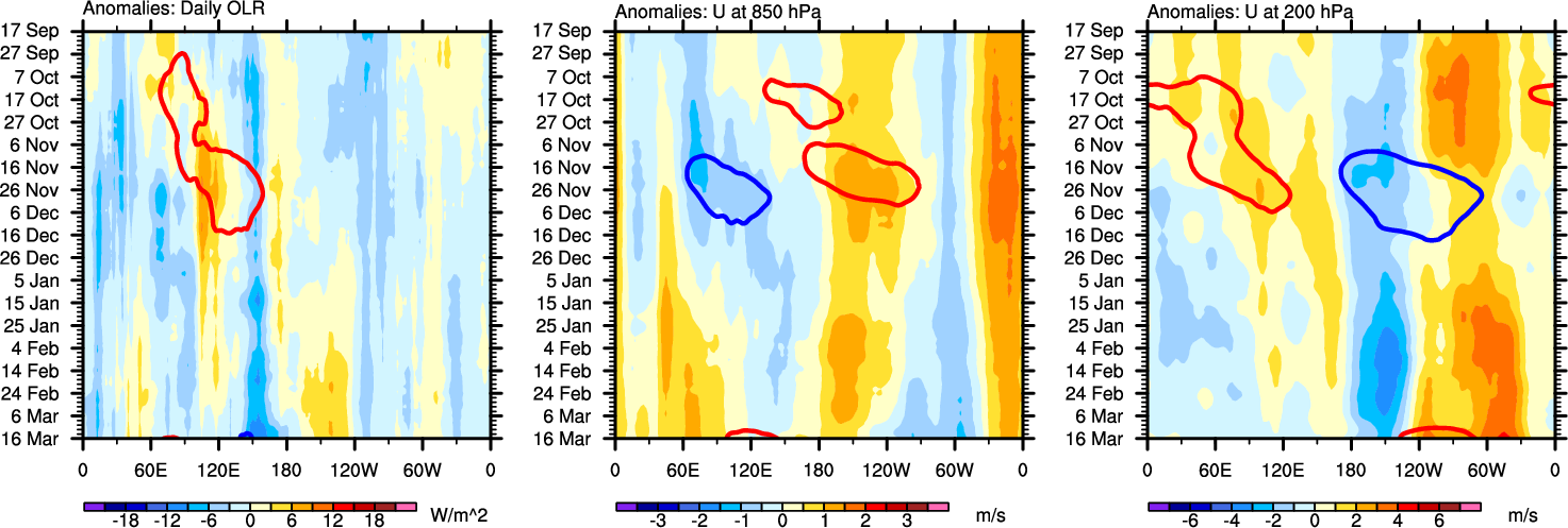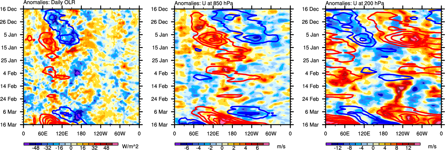 The Hovmöllers show longitude-time plots for OLR, U-850, and U-200. The shading indicates the observed anomalies, while the contours are the projection of those anomalies onto the RMM EOFs.