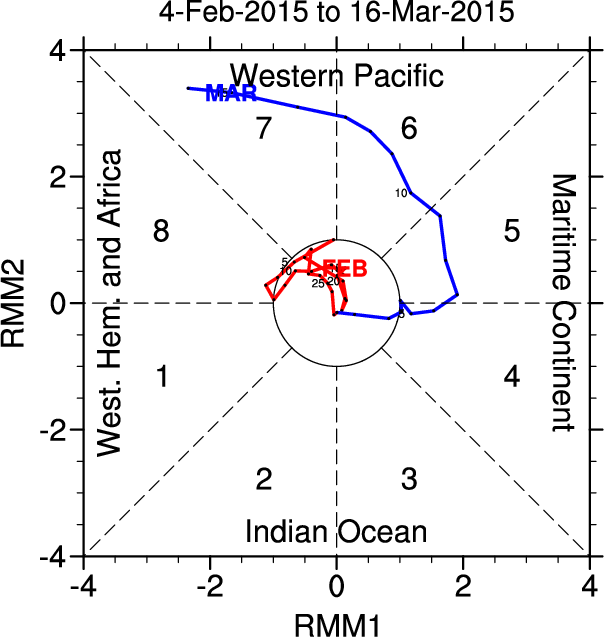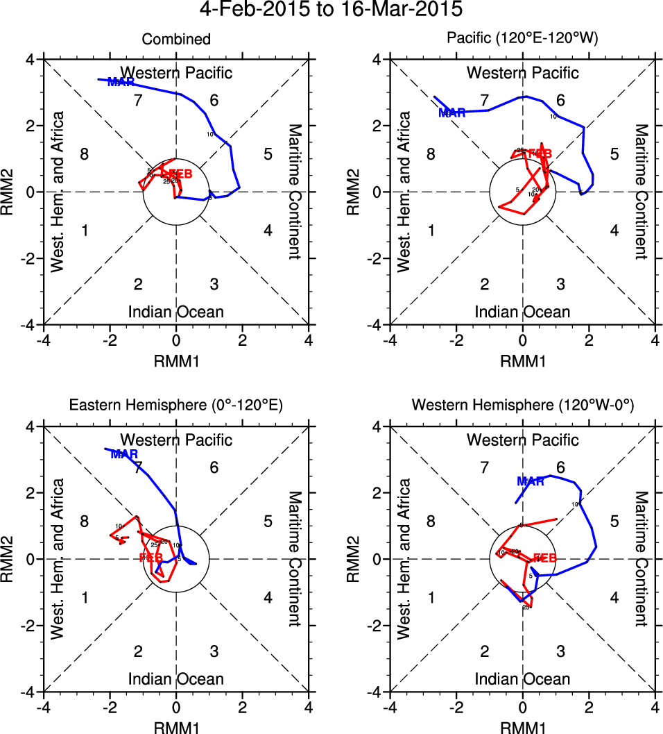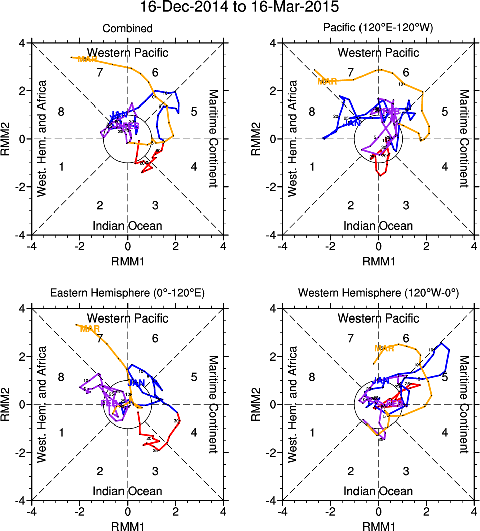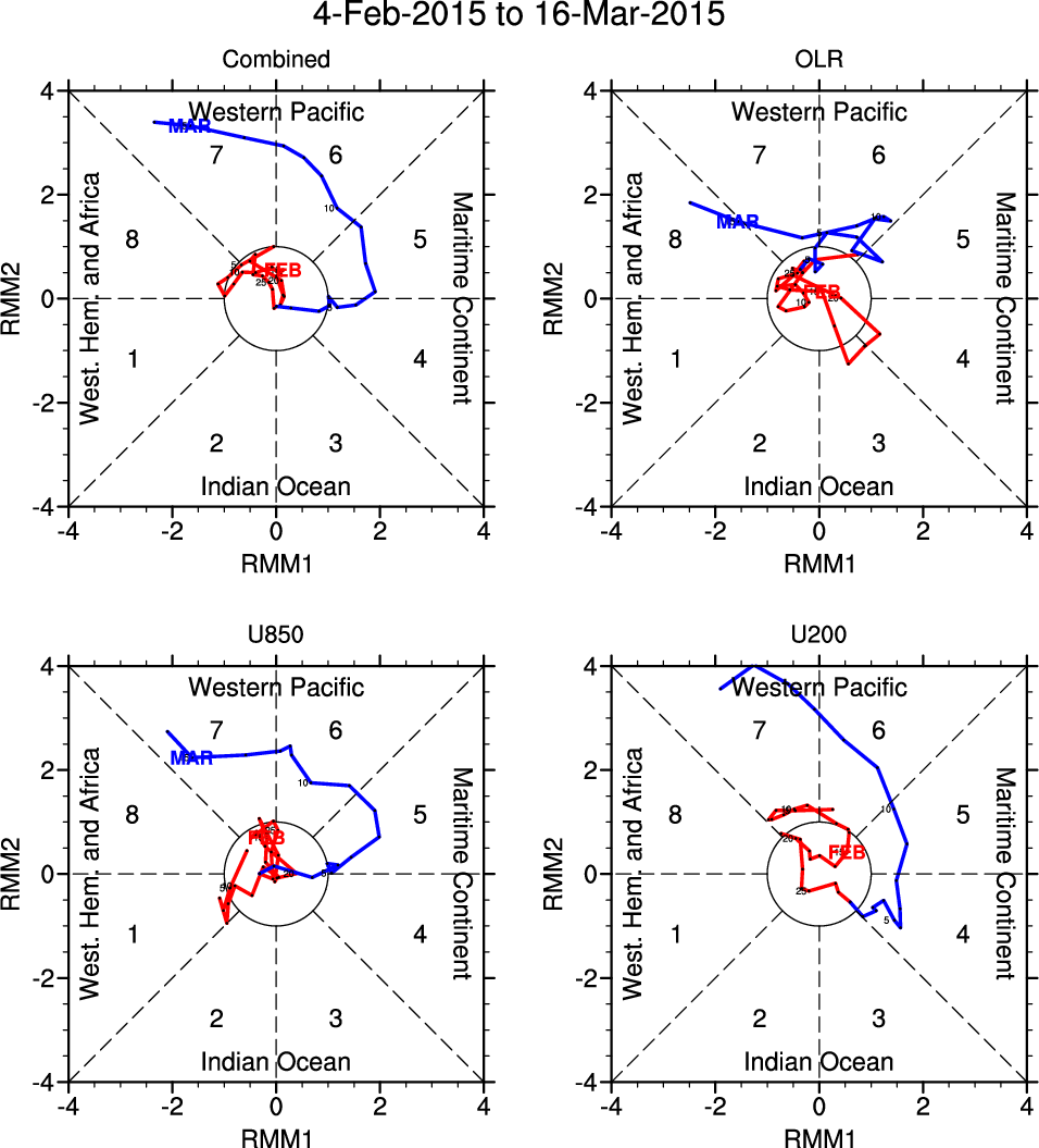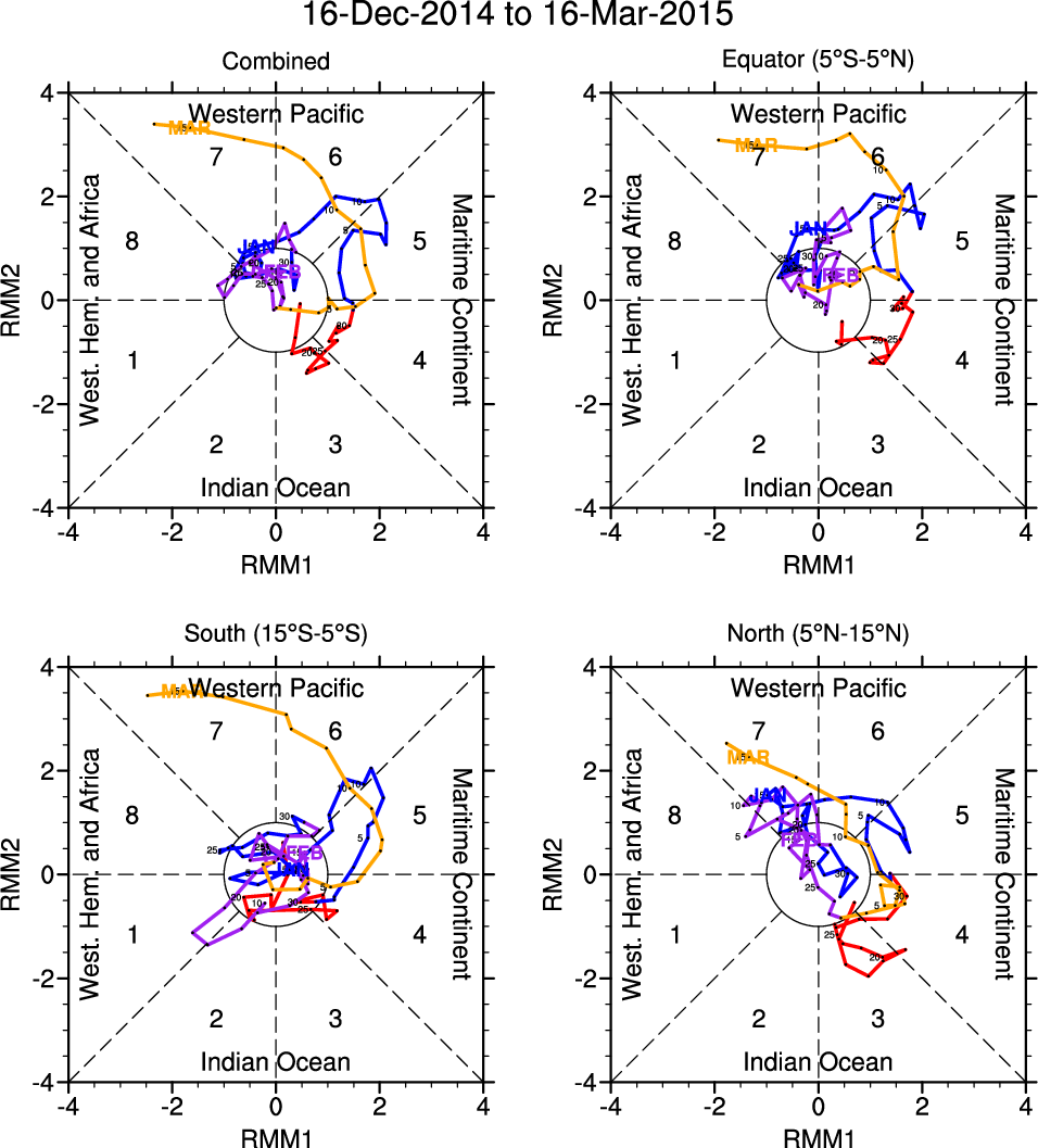 Wheeler and Hendon (2004) constructed the RMM index for monitoring the MJO. This index consists of the first two principal components (PCs) of OLR, 850-hPa zonal wind, and 200-hPa zonal wind averaged 15S-15N.