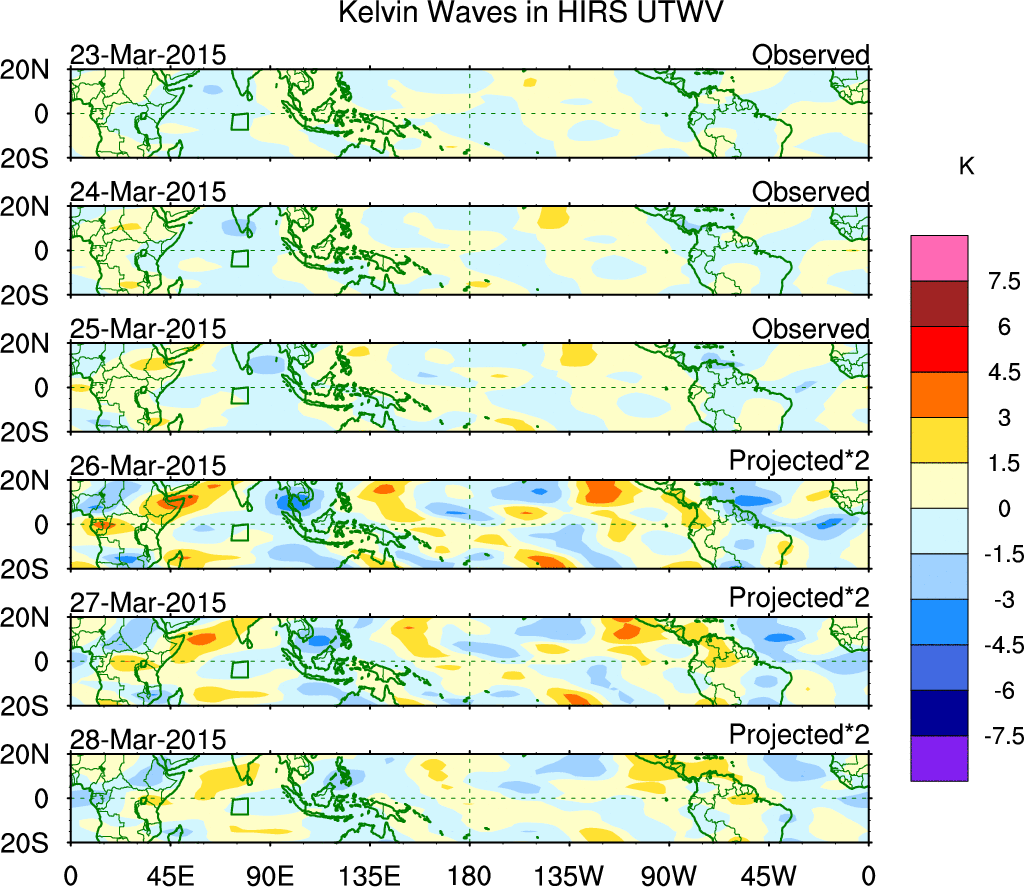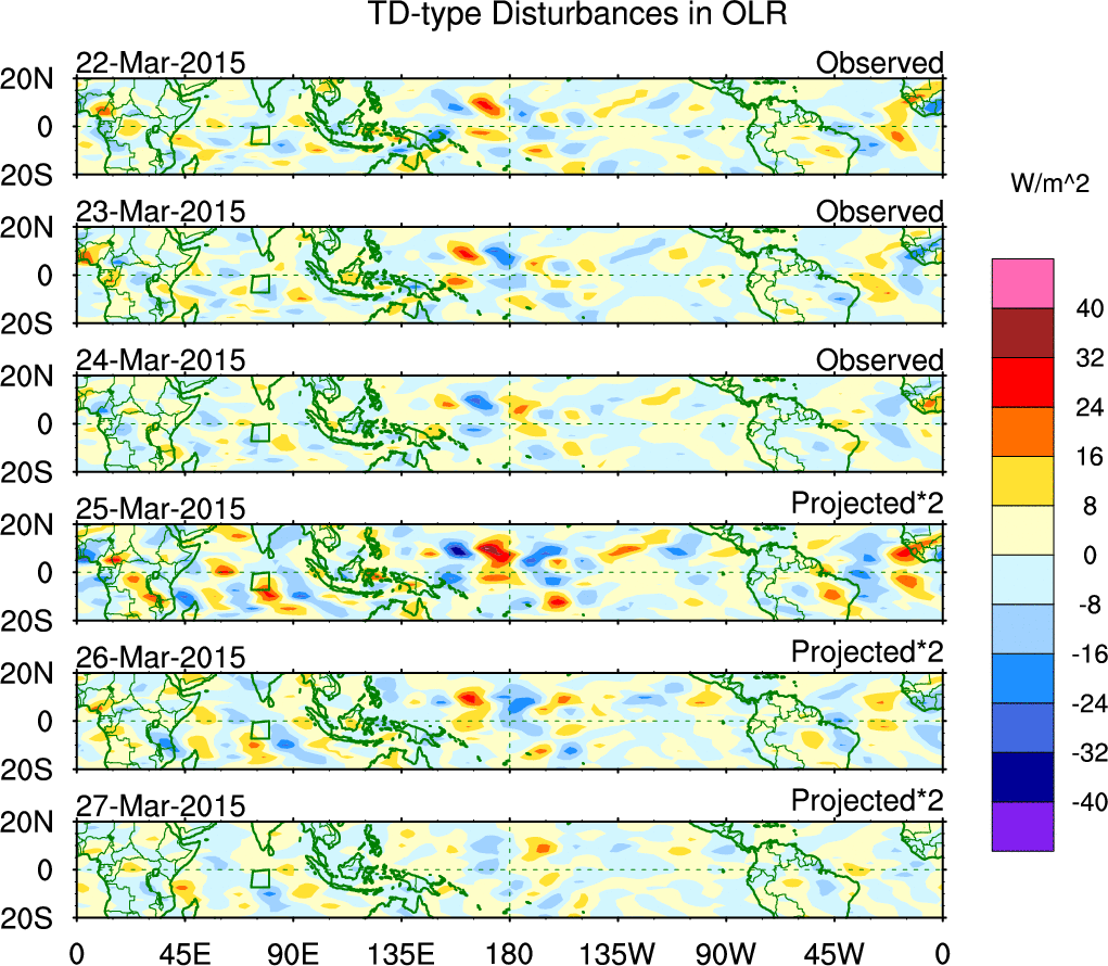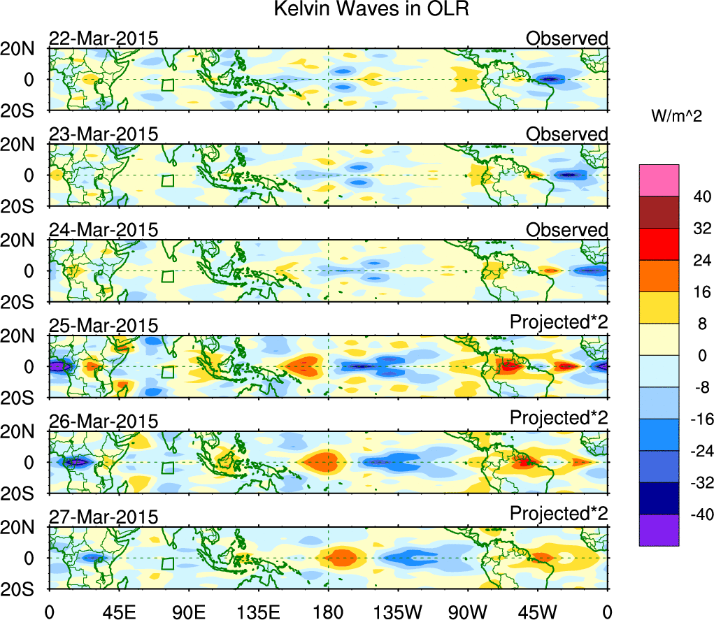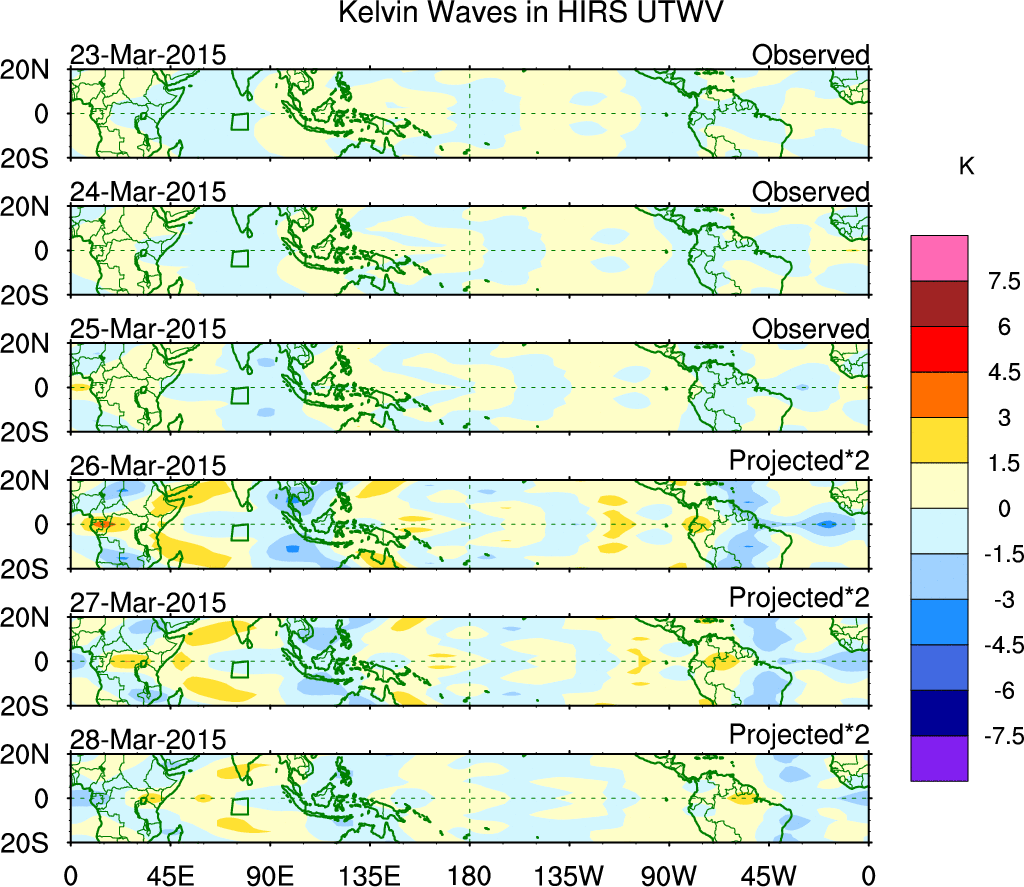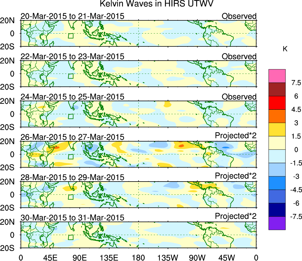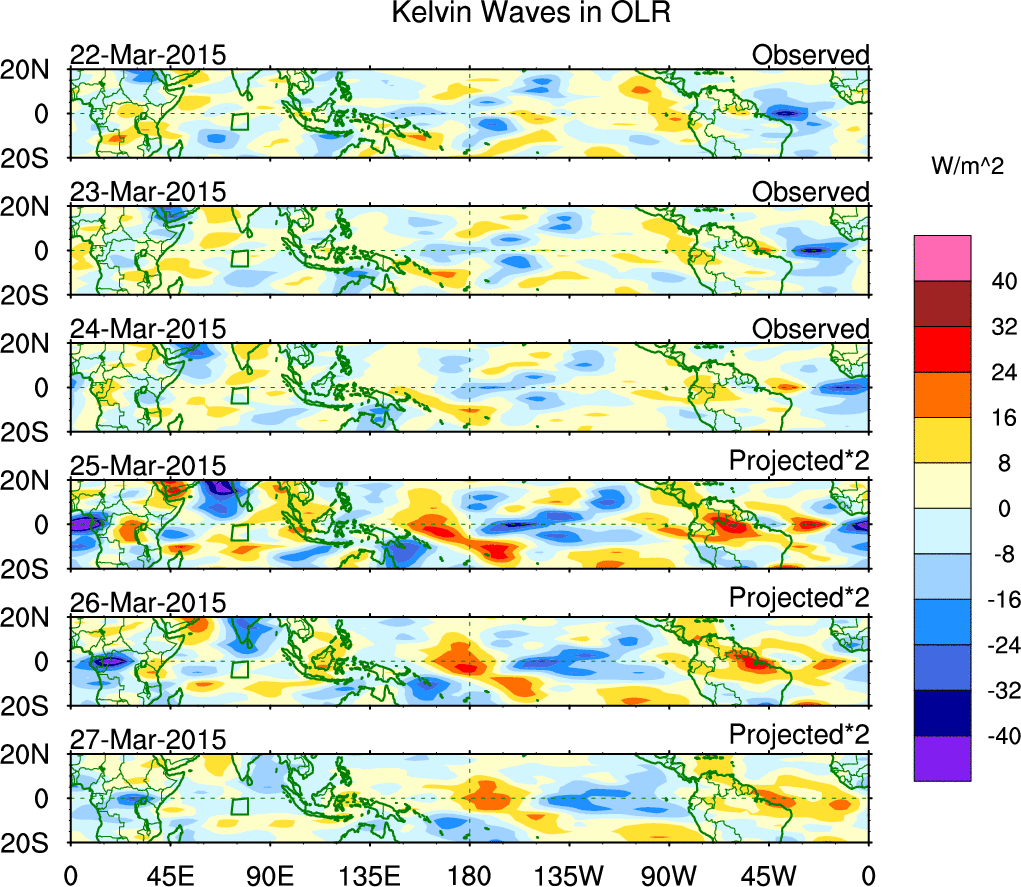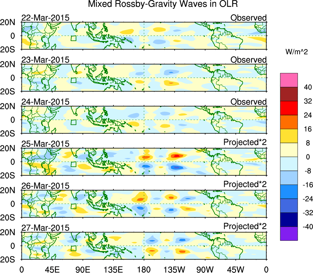 To identify tropical waves in near real-time, the OLR and UTWV data are filtered following Wheeler & Weickmann (2001 MWR). The daily anomalies are calculated using the first 3 harmonics of the seasonal cycle for 1979–2009. Missing values are then filled using linear interpolation in space and time. The most recent 365 days of anomalies are padded with 659 days of zeroes, and the result is filtered for each wave type.
