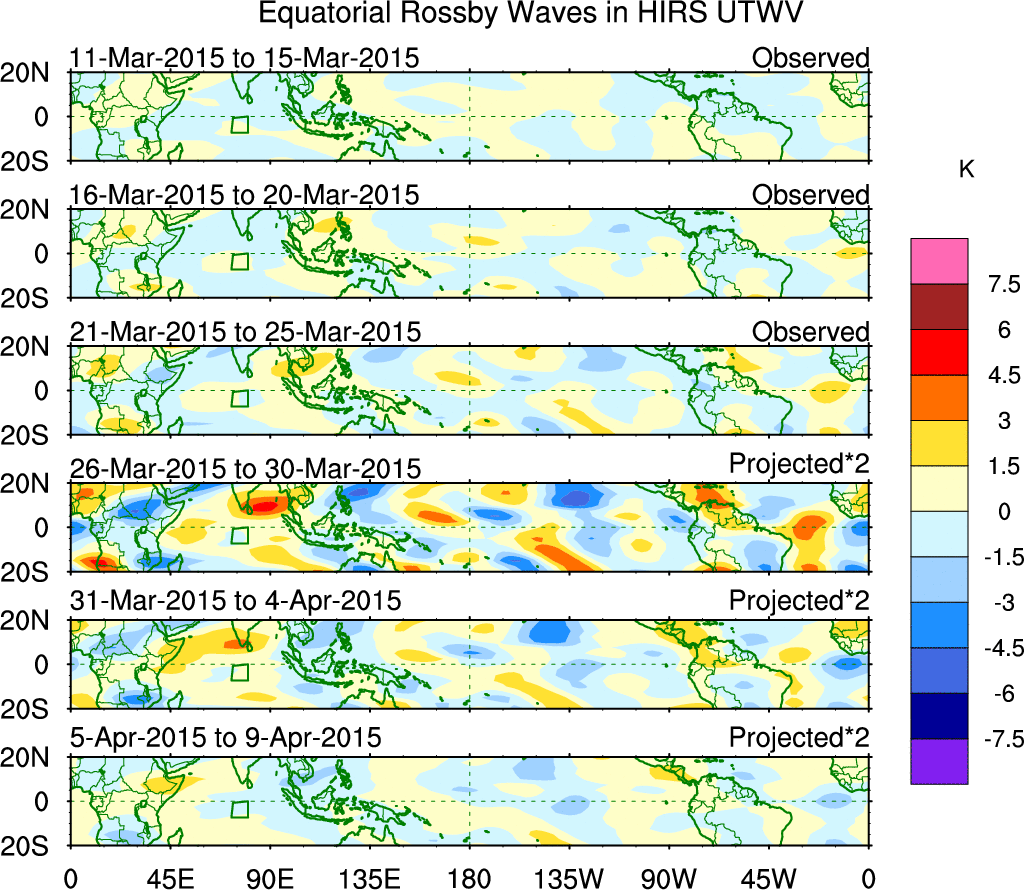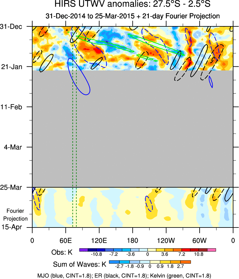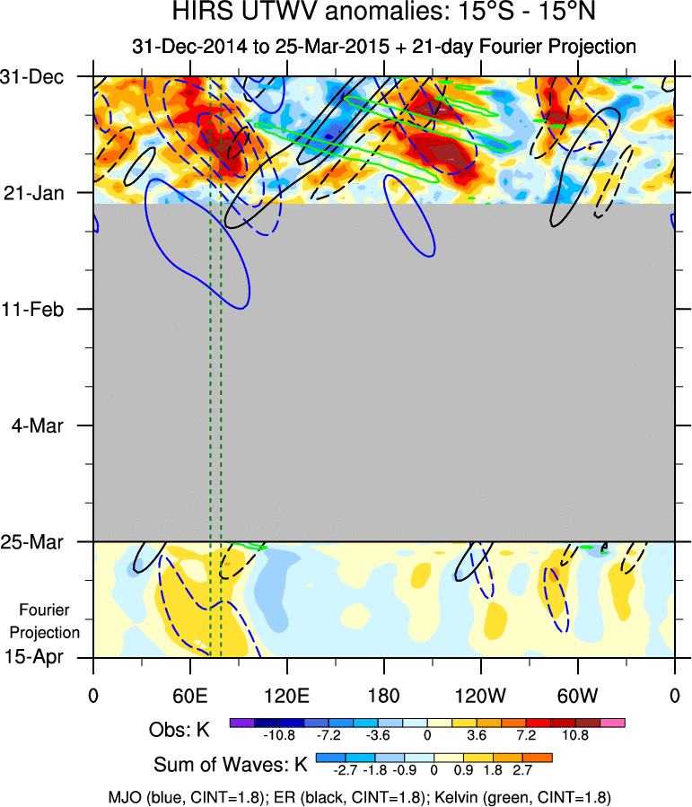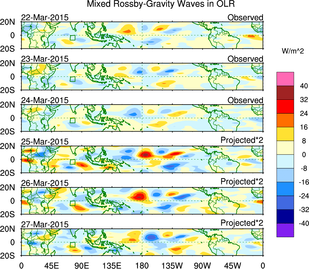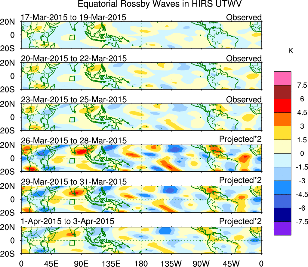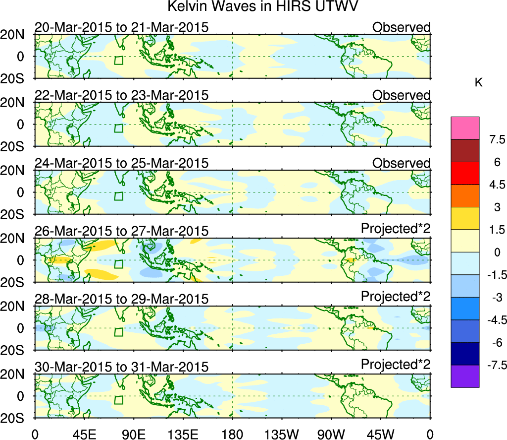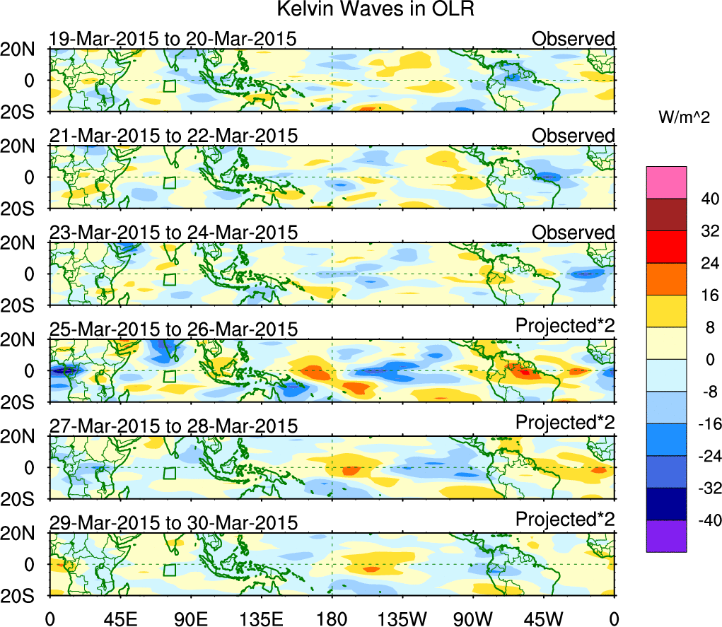 To identify tropical waves in near real-time, the OLR and UTWV data are filtered following Wheeler & Weickmann (2001 MWR). The daily anomalies are calculated using the first 3 harmonics of the seasonal cycle for 1979–2009. Missing values are then filled using linear interpolation in space and time. The most recent 365 days of anomalies are padded with 659 days of zeroes, and the result is filtered for each wave type.