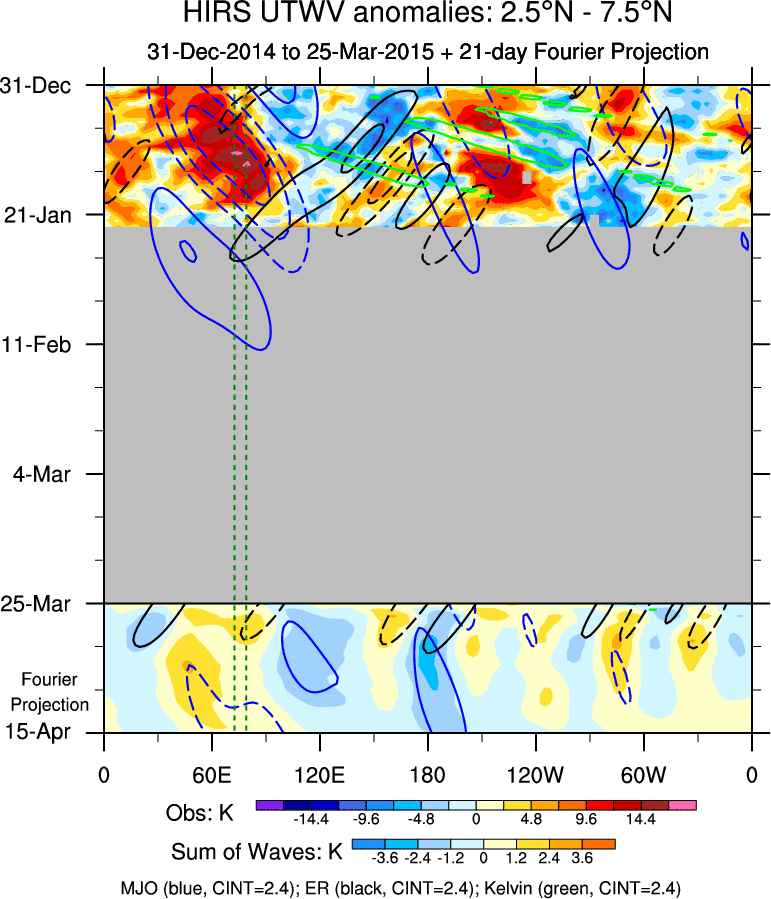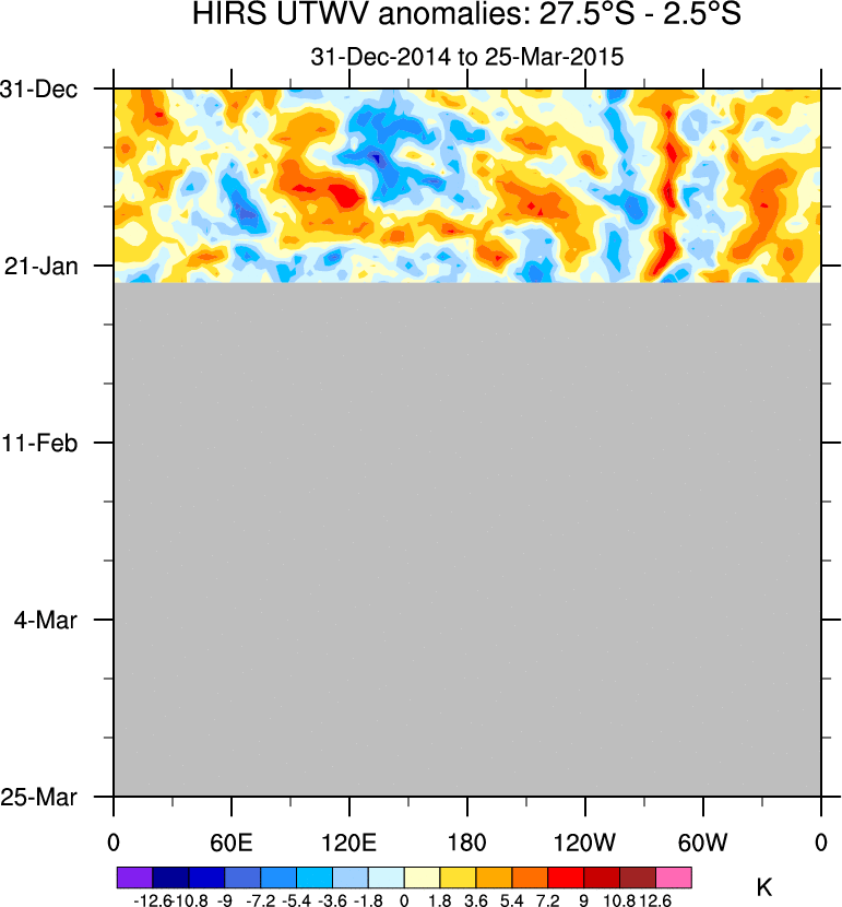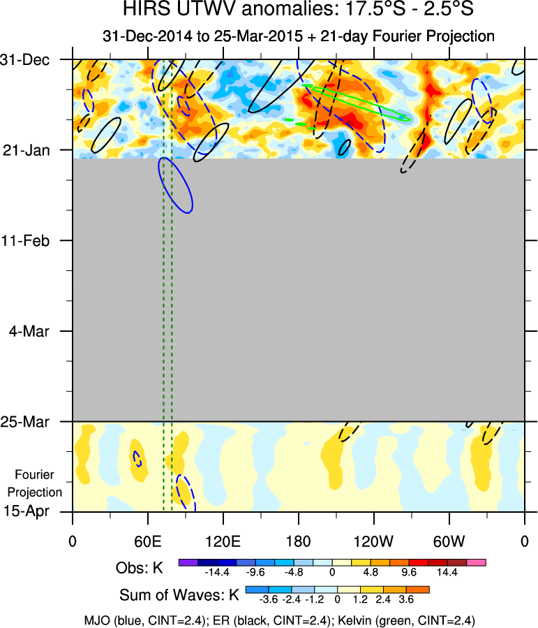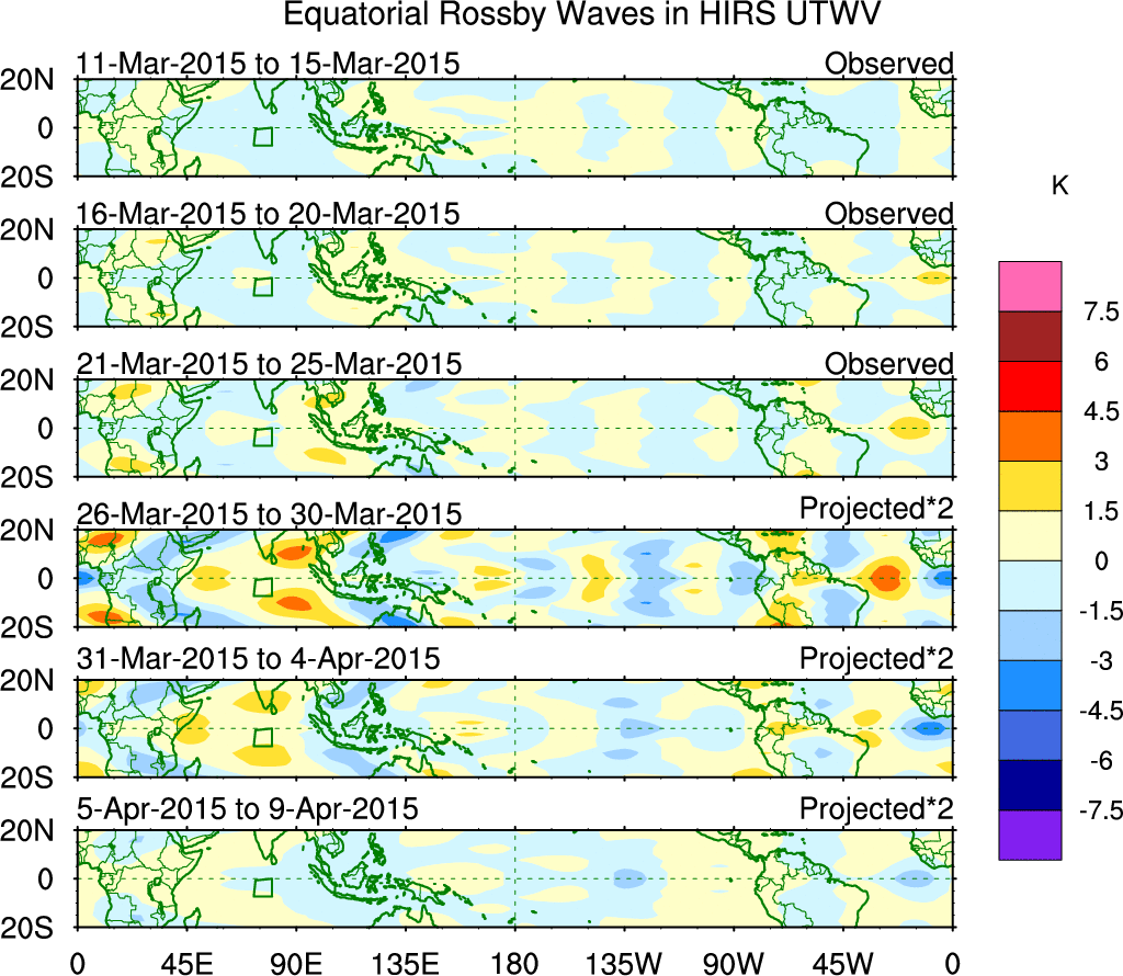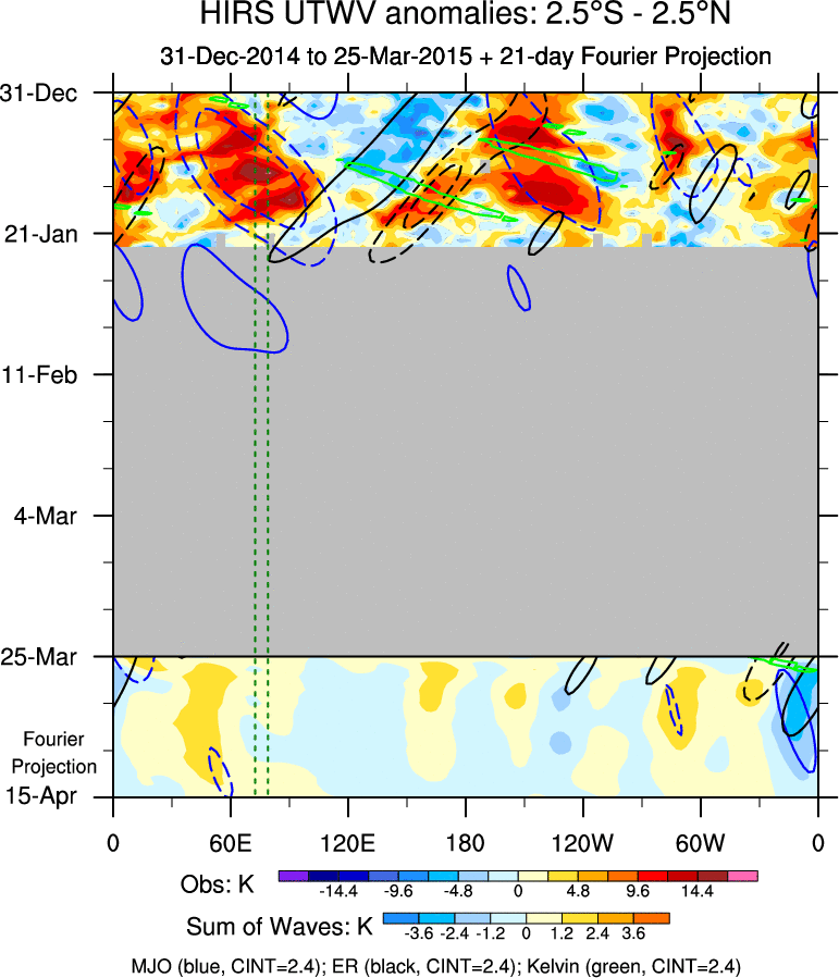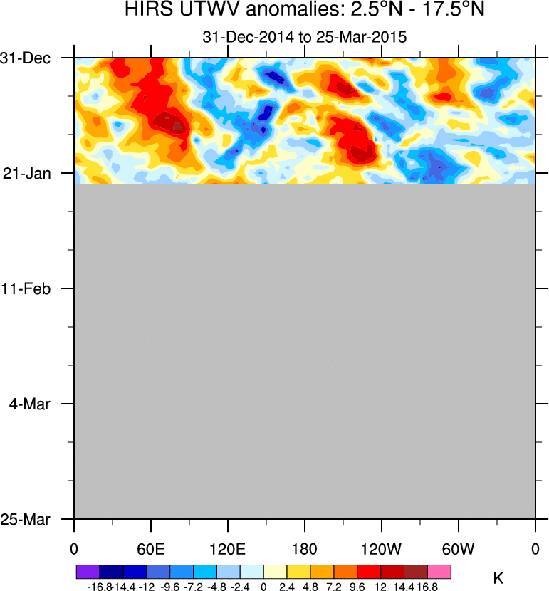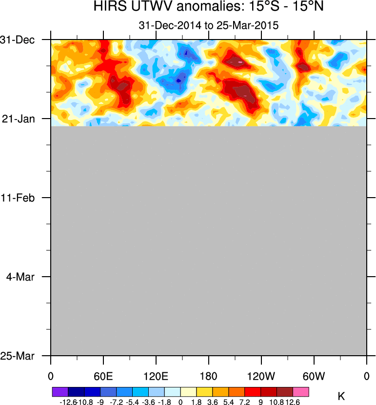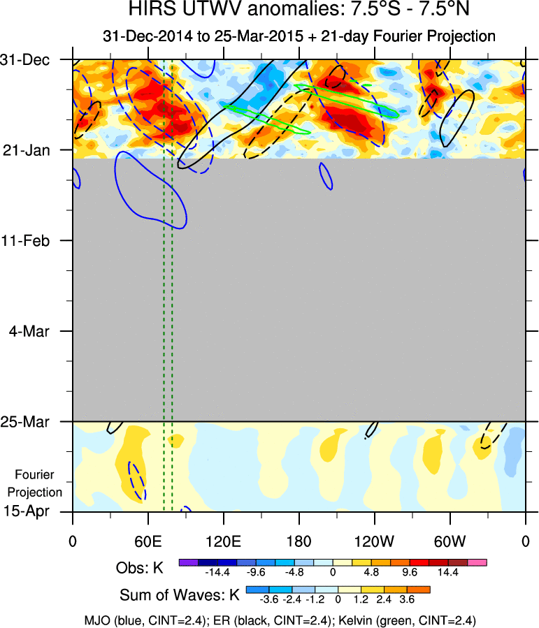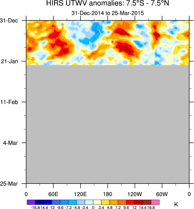 To identify tropical waves in near real-time, the OLR and UTWV data are filtered following Wheeler & Weickmann (2001 MWR). The daily anomalies are calculated using the first 3 harmonics of the seasonal cycle for 1979–2009. Missing values are then filled using linear interpolation in space and time. The most recent 365 days of anomalies are padded with 659 days of zeroes, and the result is filtered for each wave type.