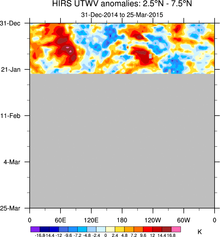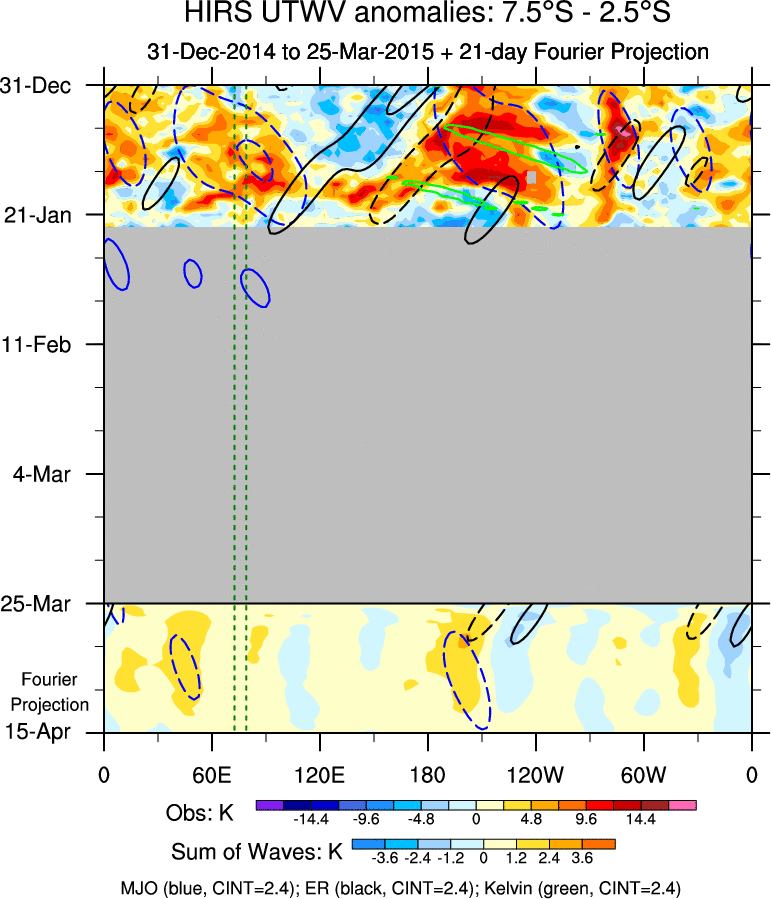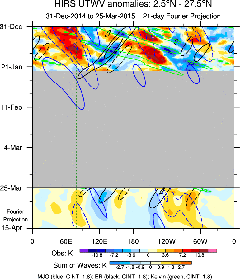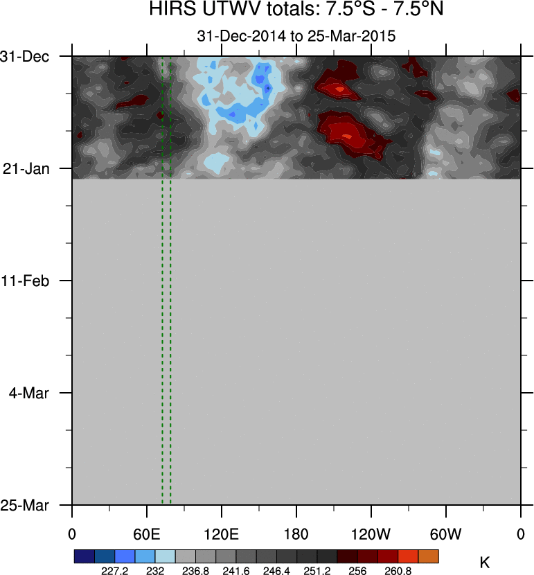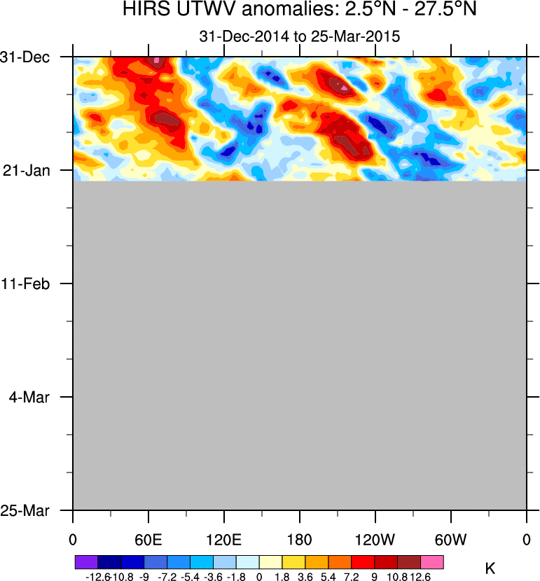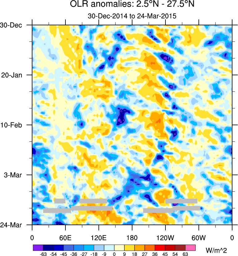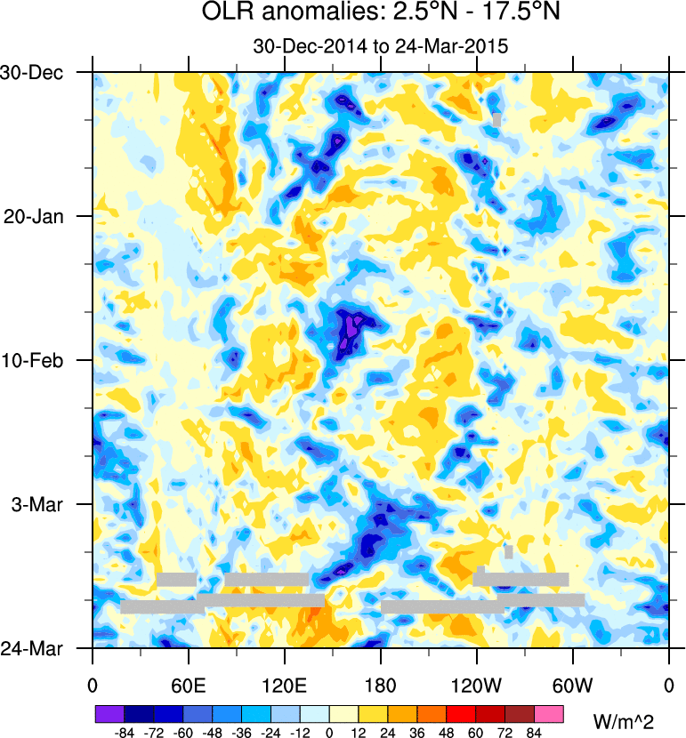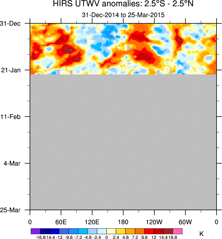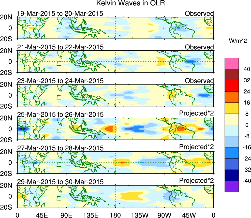 To identify tropical waves in near real-time, the OLR and UTWV data are filtered following Wheeler & Weickmann (2001 MWR). The daily anomalies are calculated using the first 3 harmonics of the seasonal cycle for 1979–2009. Missing values are then filled using linear interpolation in space and time. The most recent 365 days of anomalies are padded with 659 days of zeroes, and the result is filtered for each wave type.