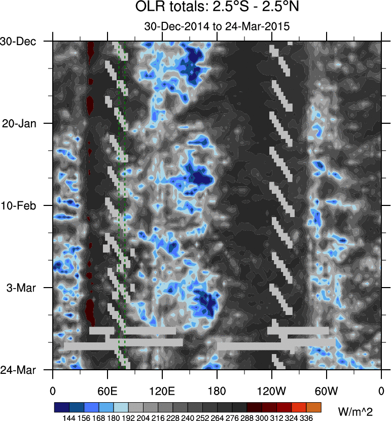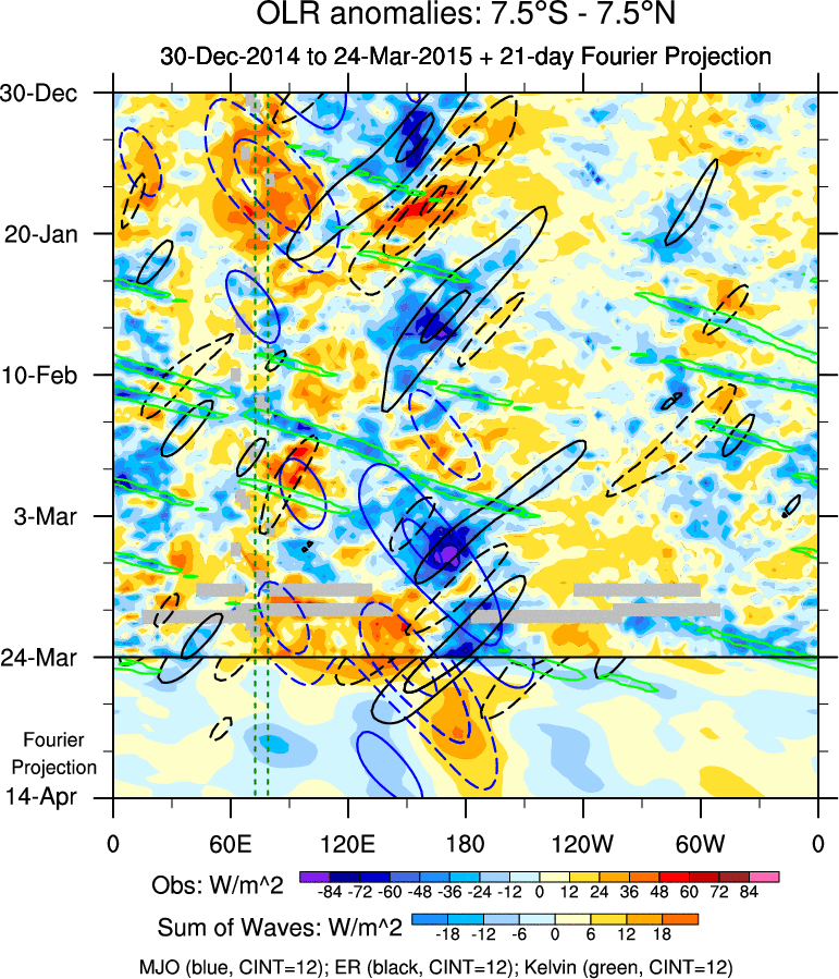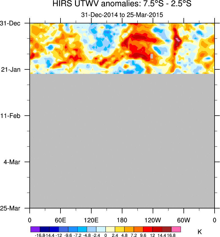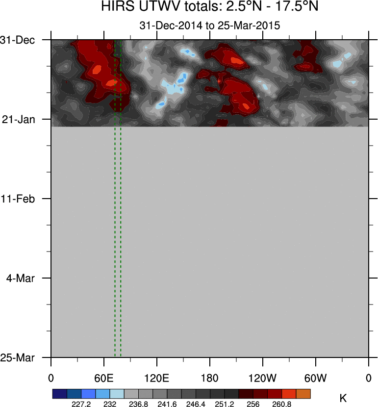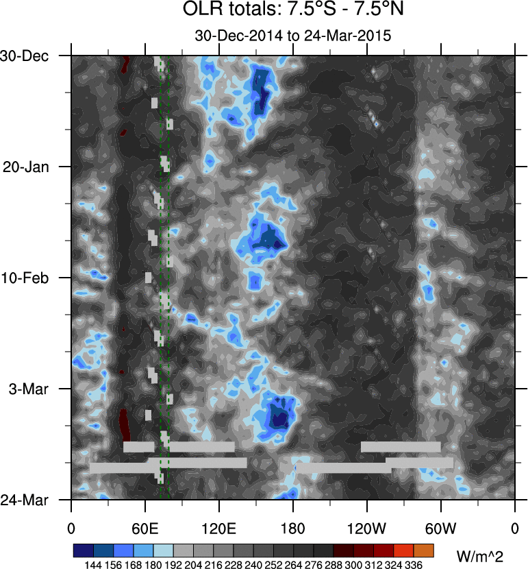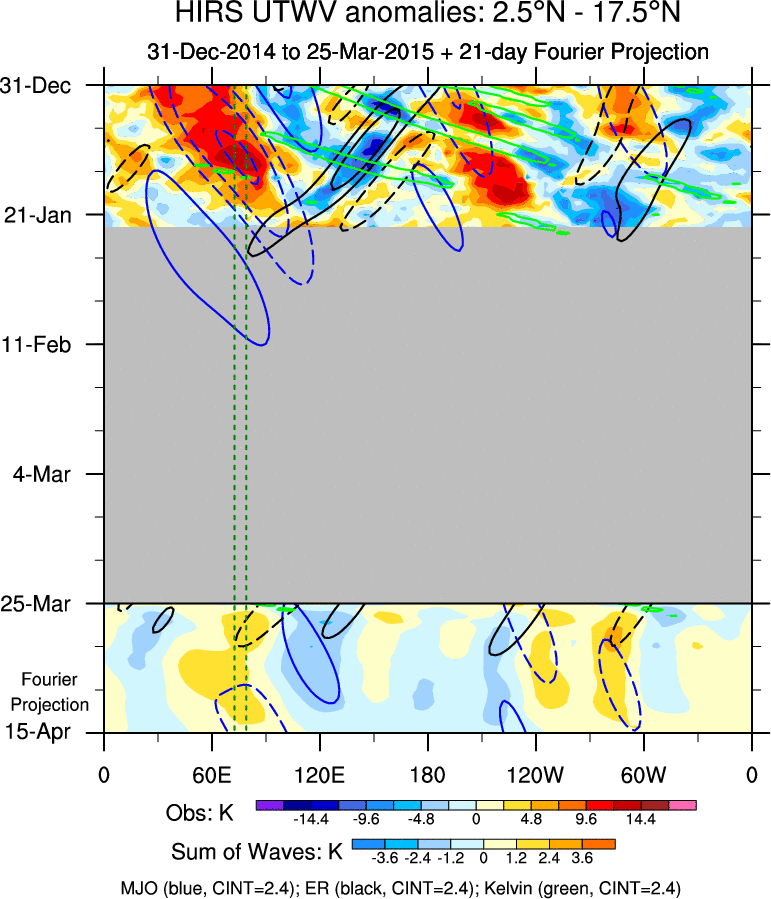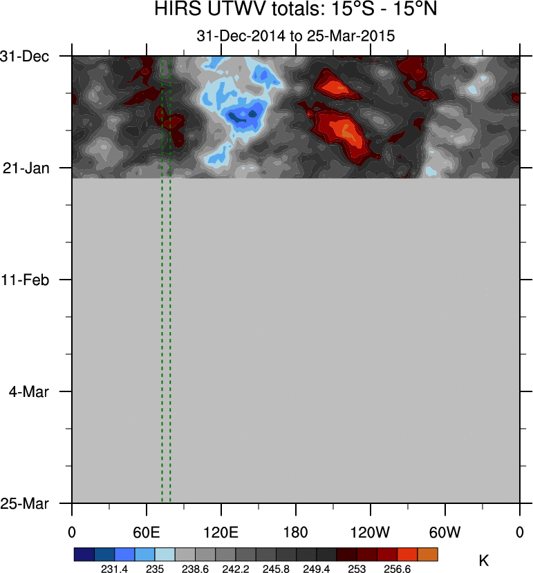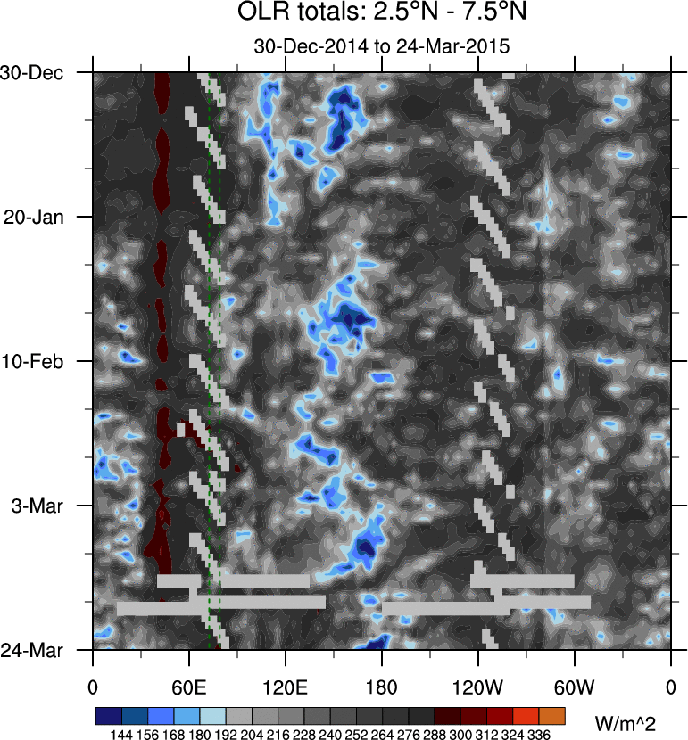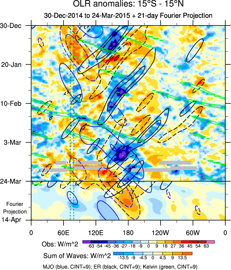 To identify tropical waves in near real-time, the OLR and UTWV data are filtered following Wheeler & Weickmann (2001 MWR). The daily anomalies are calculated using the first 3 harmonics of the seasonal cycle for 1979–2009. Missing values are then filled using linear interpolation in space and time. The most recent 365 days of anomalies are padded with 659 days of zeroes, and the result is filtered for each wave type.