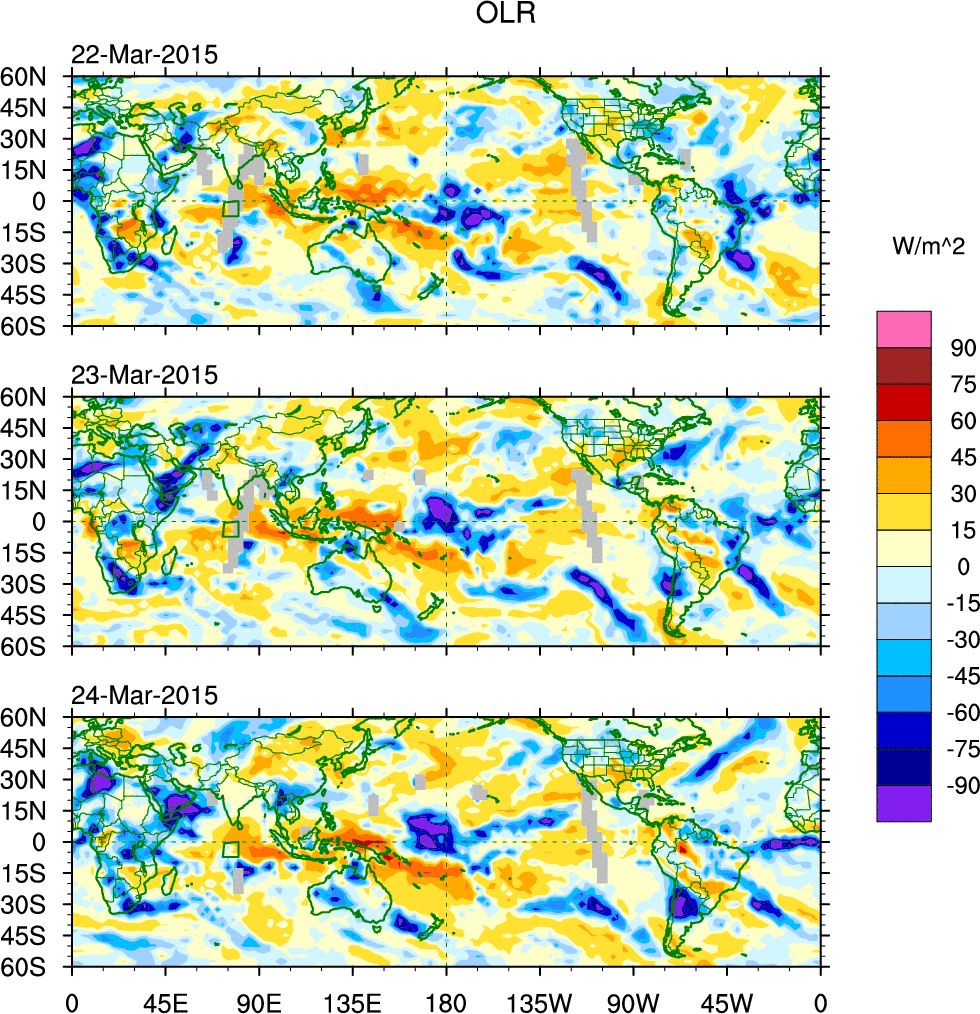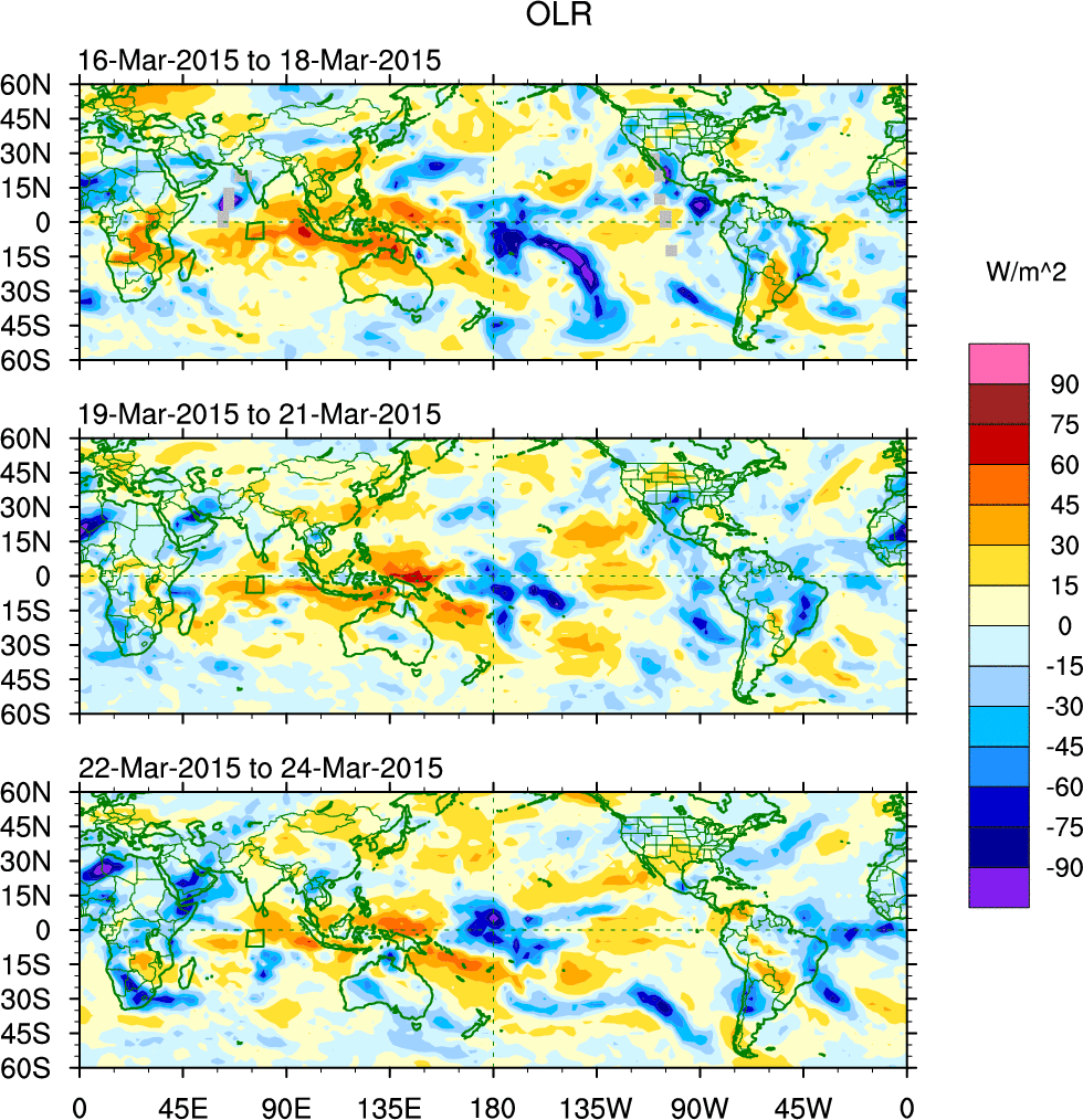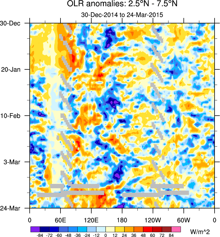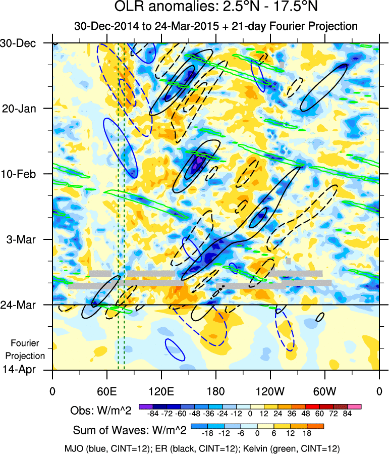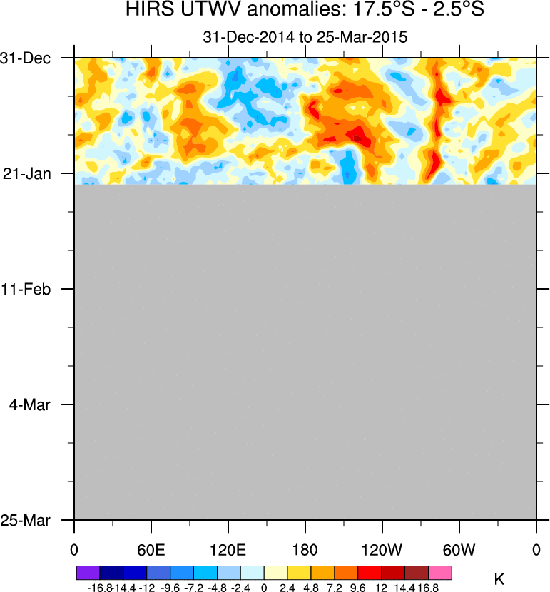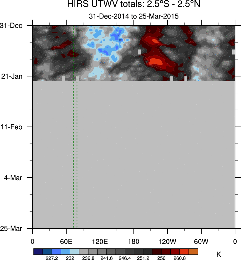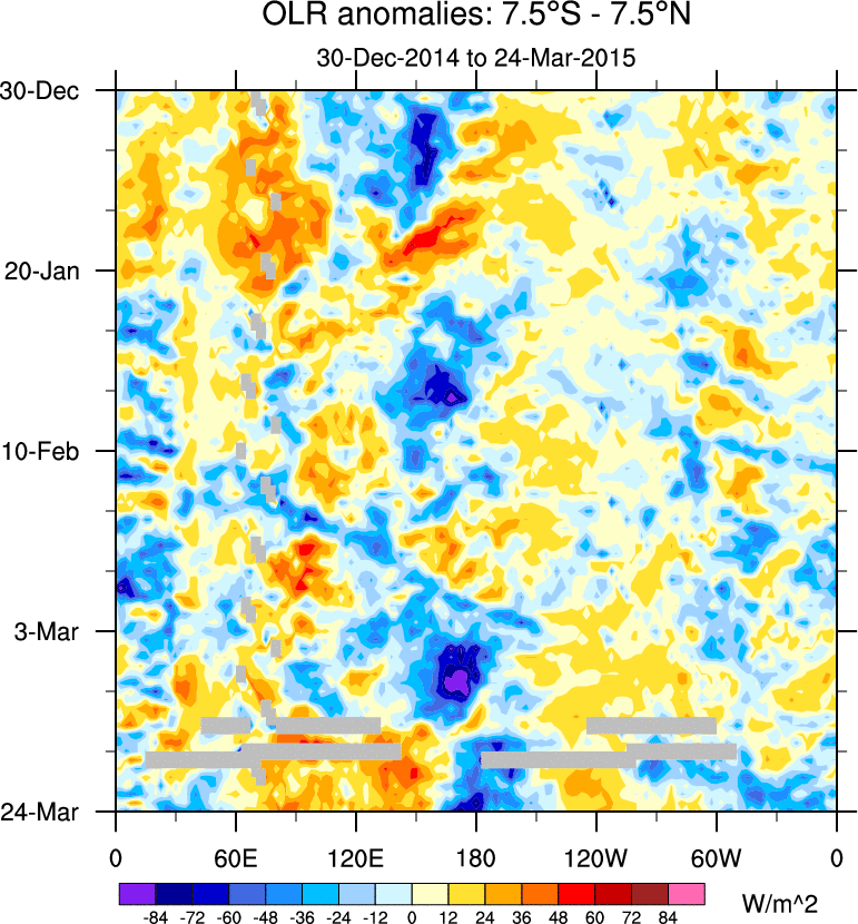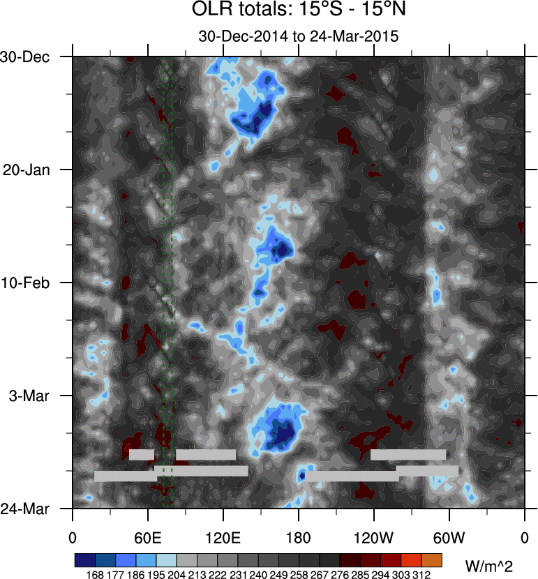 To identify tropical waves in near real-time, the OLR and UTWV data are filtered following Wheeler & Weickmann (2001 MWR). The daily anomalies are calculated using the first 3 harmonics of the seasonal cycle for 1979–2009. Missing values are then filled using linear interpolation in space and time. The most recent 365 days of anomalies are padded with 659 days of zeroes, and the result is filtered for each wave type.