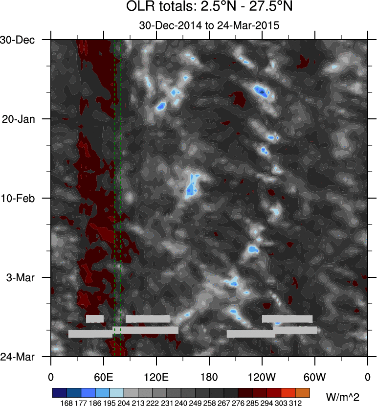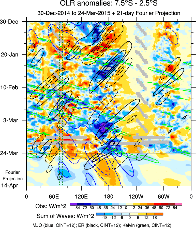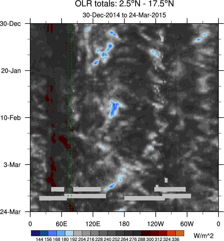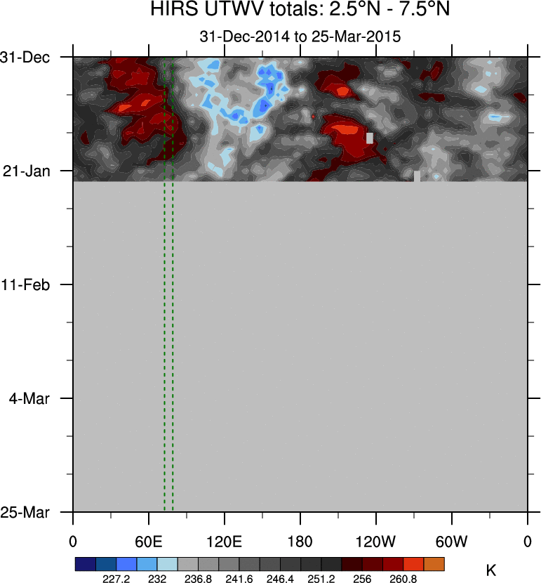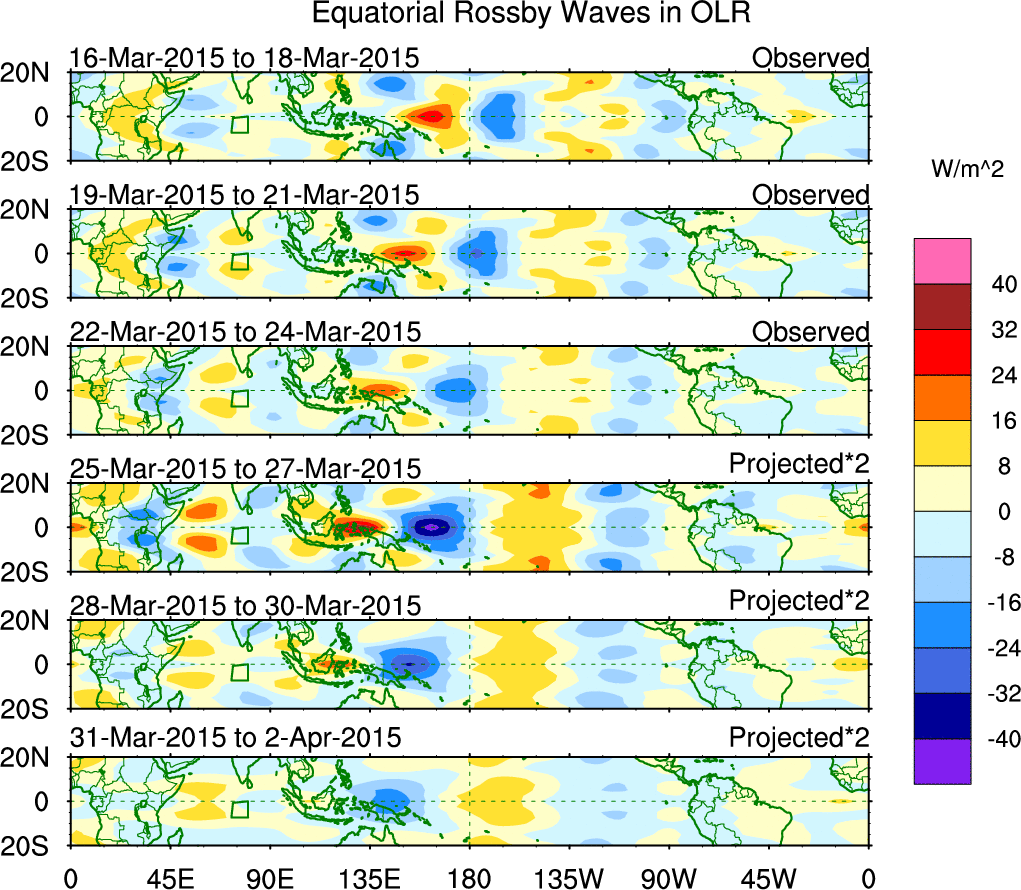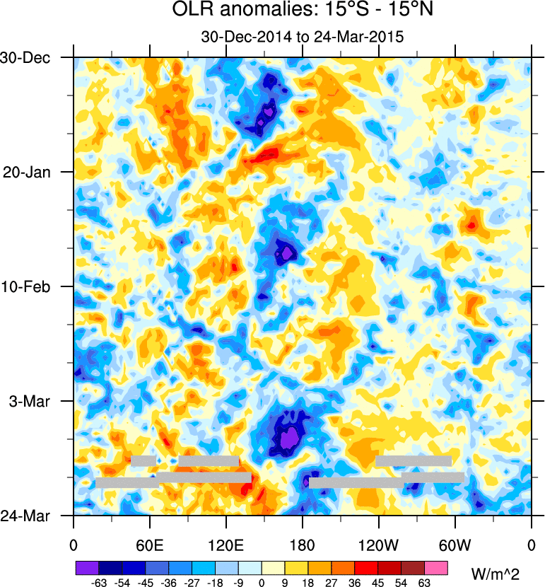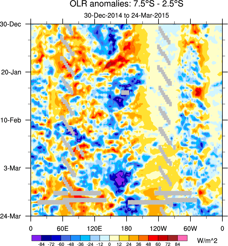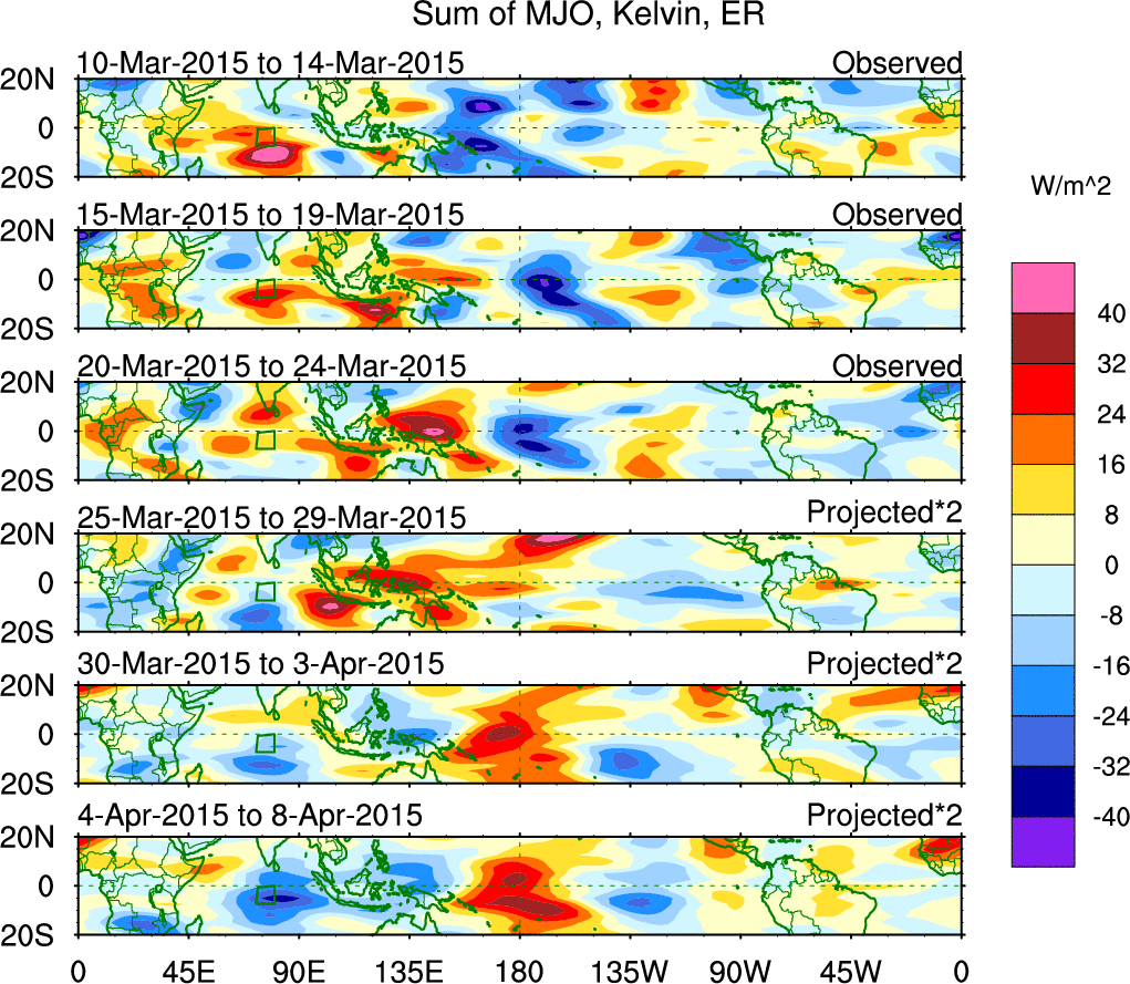 To identify tropical waves in near real-time, the OLR and UTWV data are filtered following Wheeler & Weickmann (2001 MWR). The daily anomalies are calculated using the first 3 harmonics of the seasonal cycle for 1979–2009. Missing values are then filled using linear interpolation in space and time. The most recent 365 days of anomalies are padded with 659 days of zeroes, and the result is filtered for each wave type.