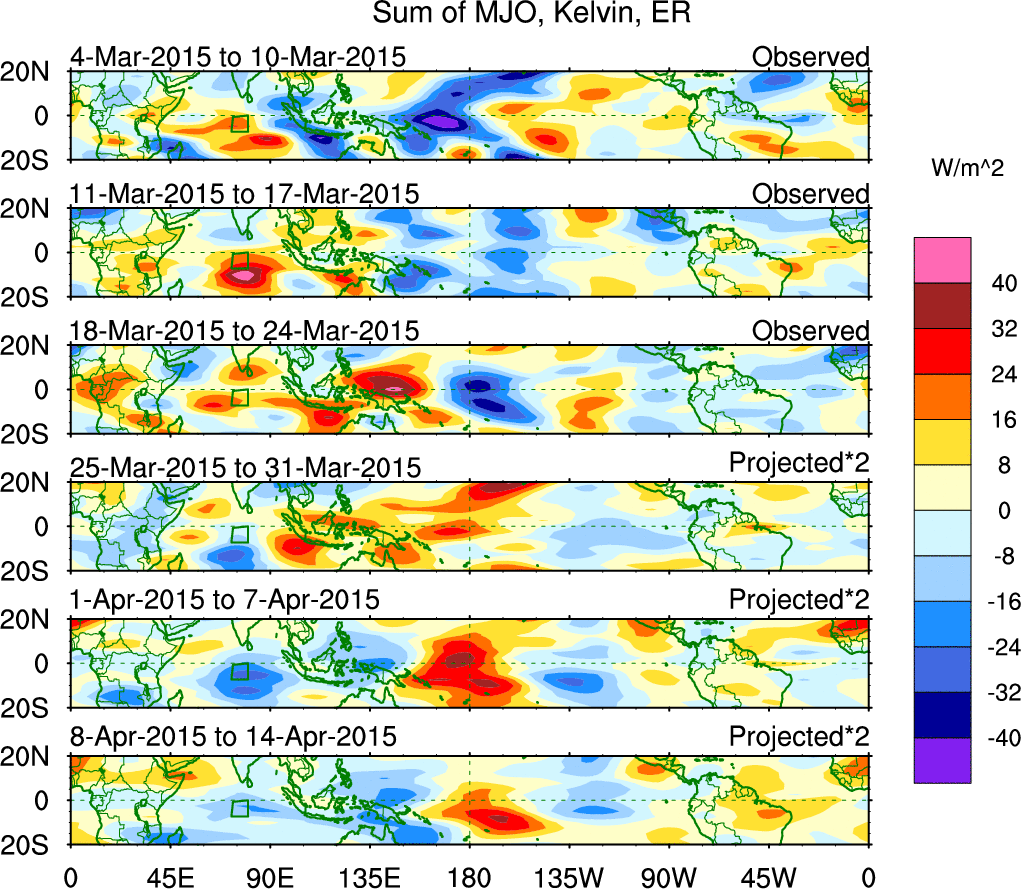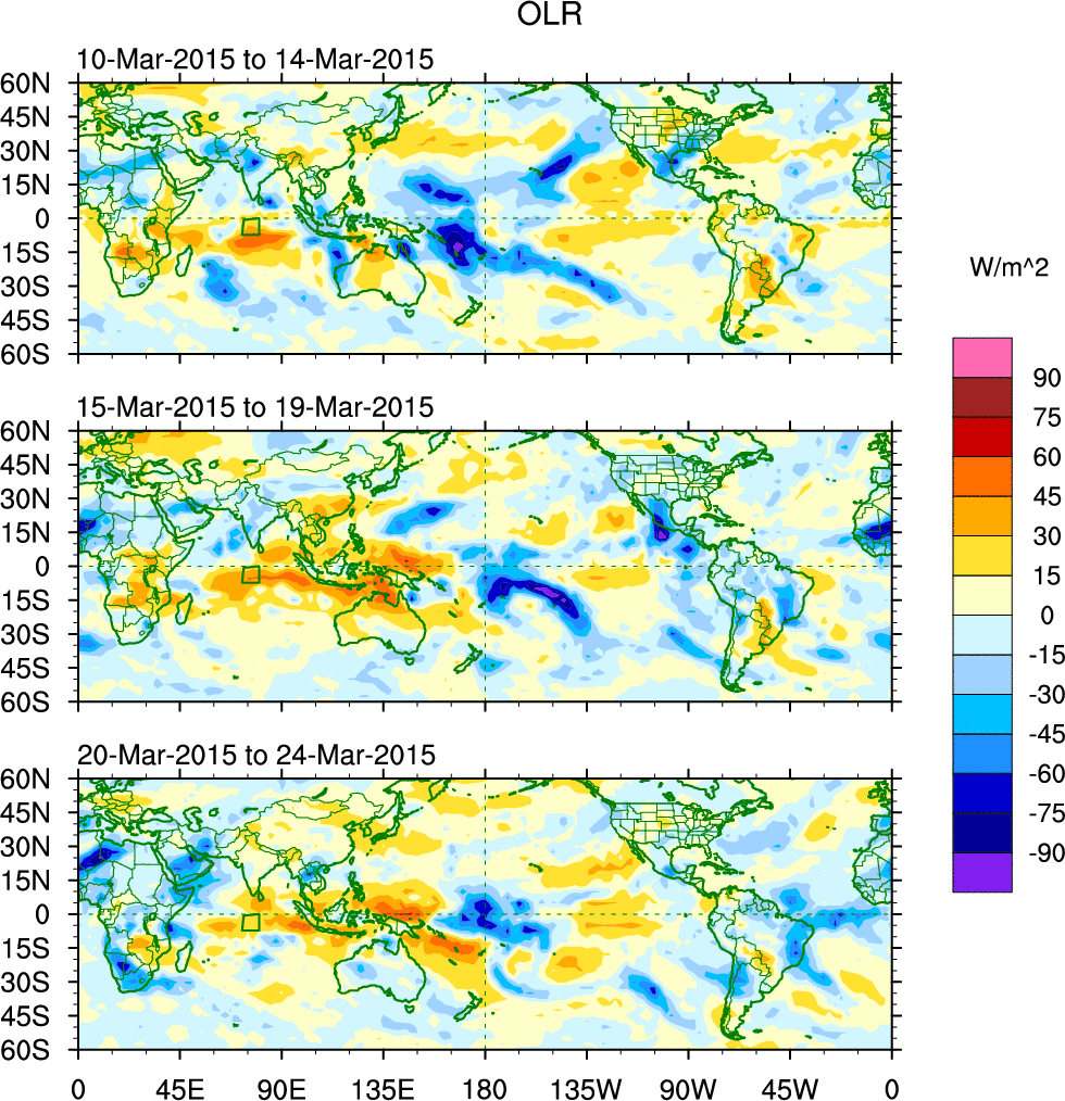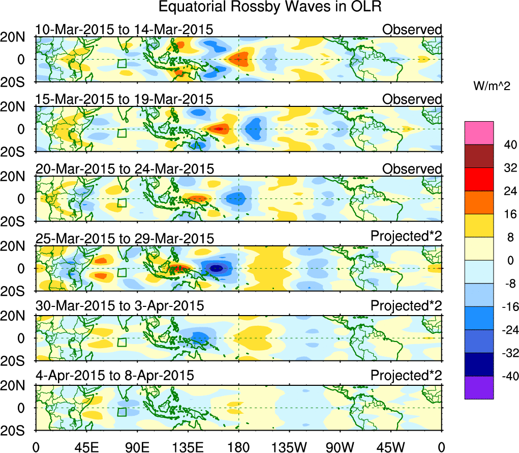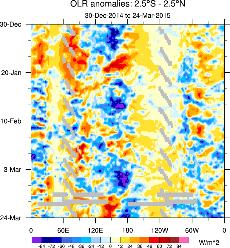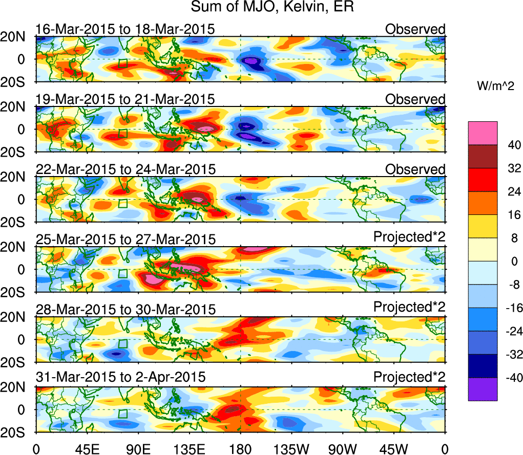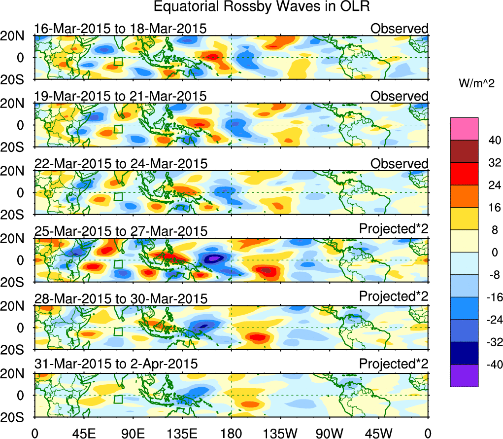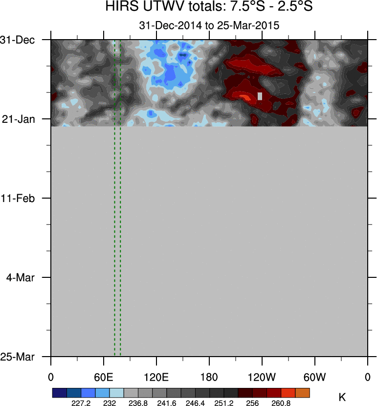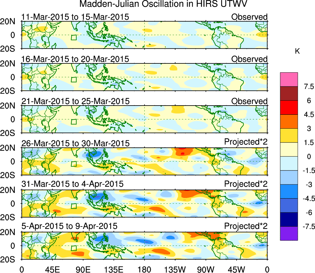 To identify tropical waves in near real-time, the OLR and UTWV data are filtered following Wheeler & Weickmann (2001 MWR). The daily anomalies are calculated using the first 3 harmonics of the seasonal cycle for 1979–2009. Missing values are then filled using linear interpolation in space and time. The most recent 365 days of anomalies are padded with 659 days of zeroes, and the result is filtered for each wave type.
