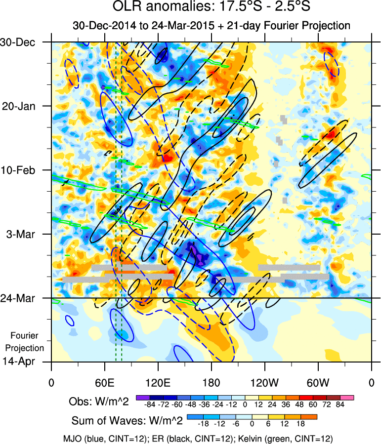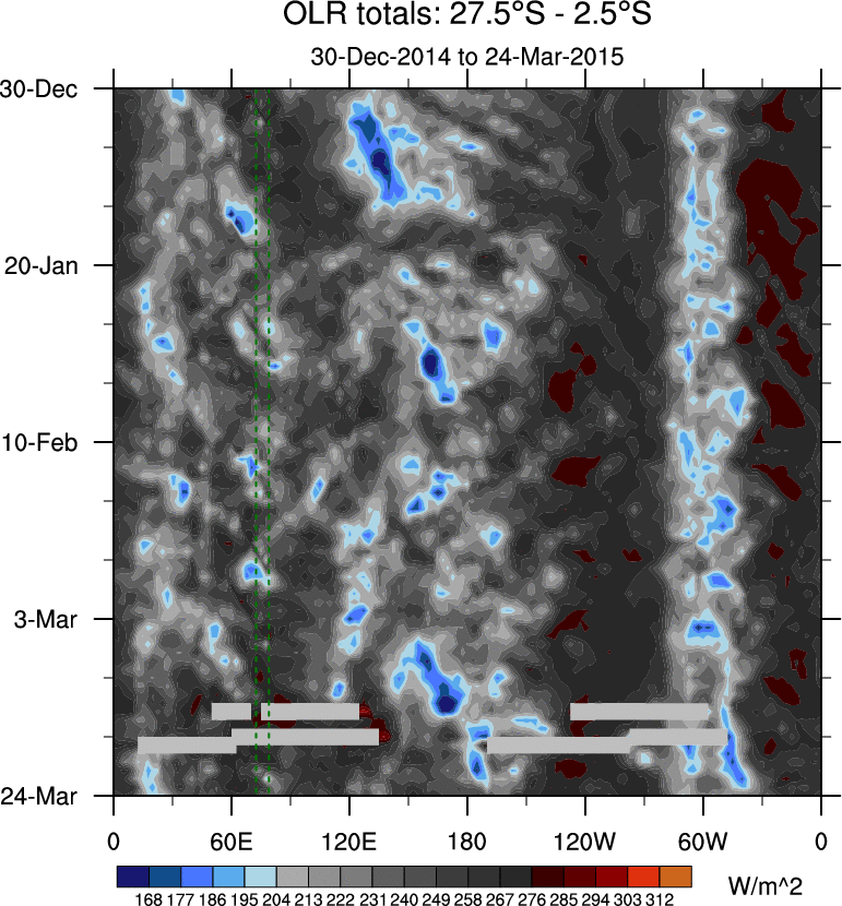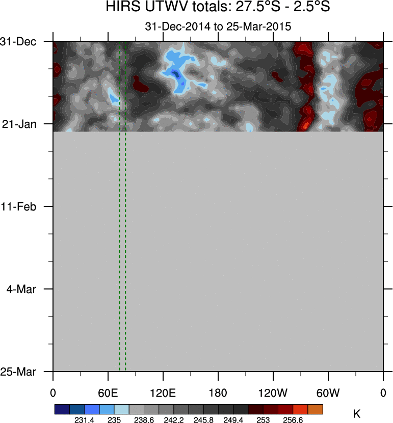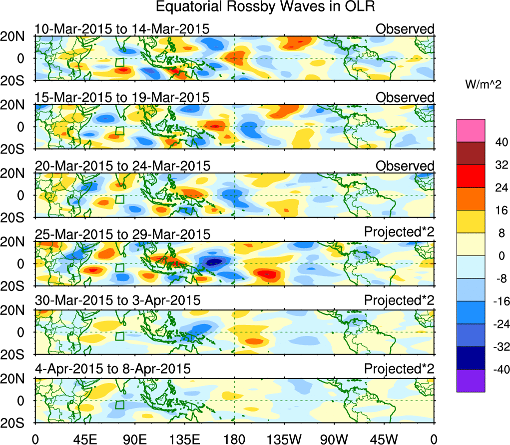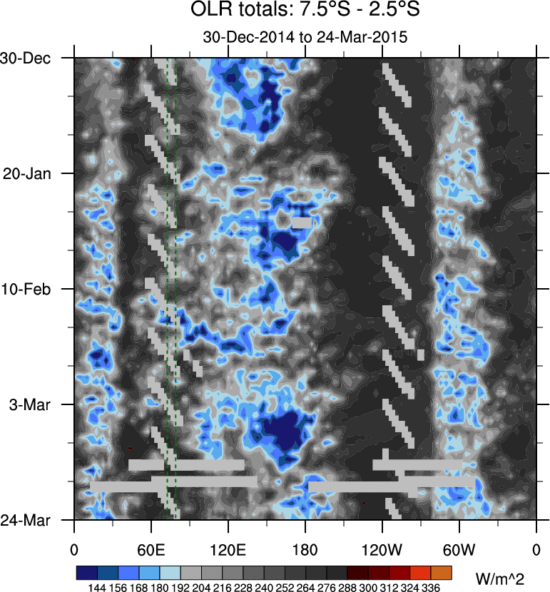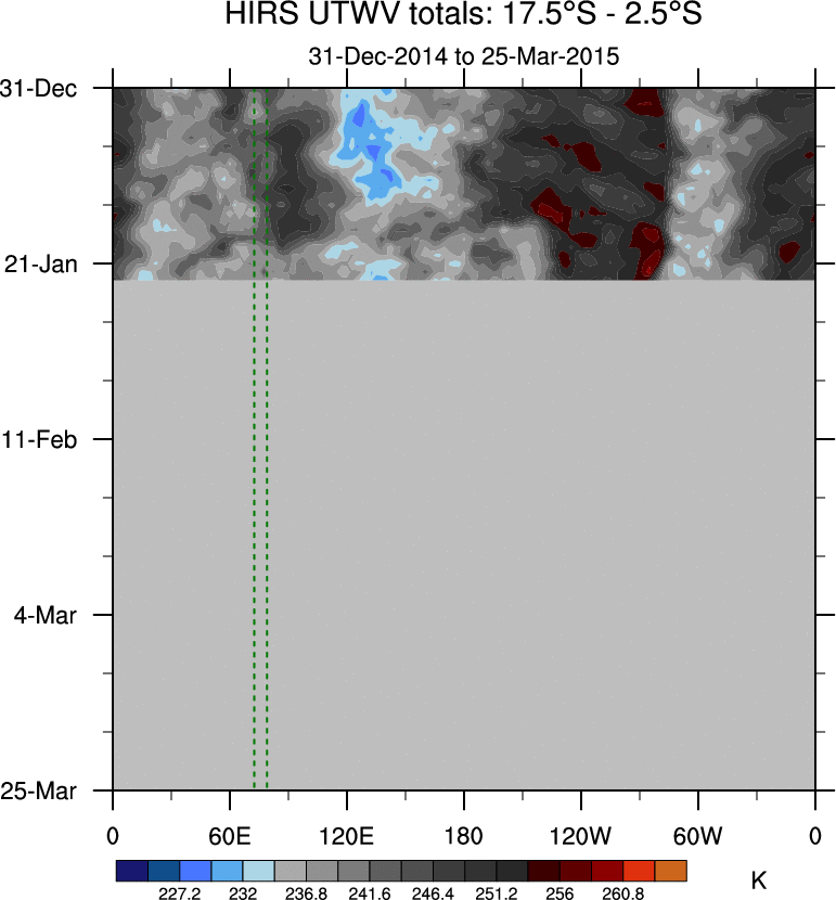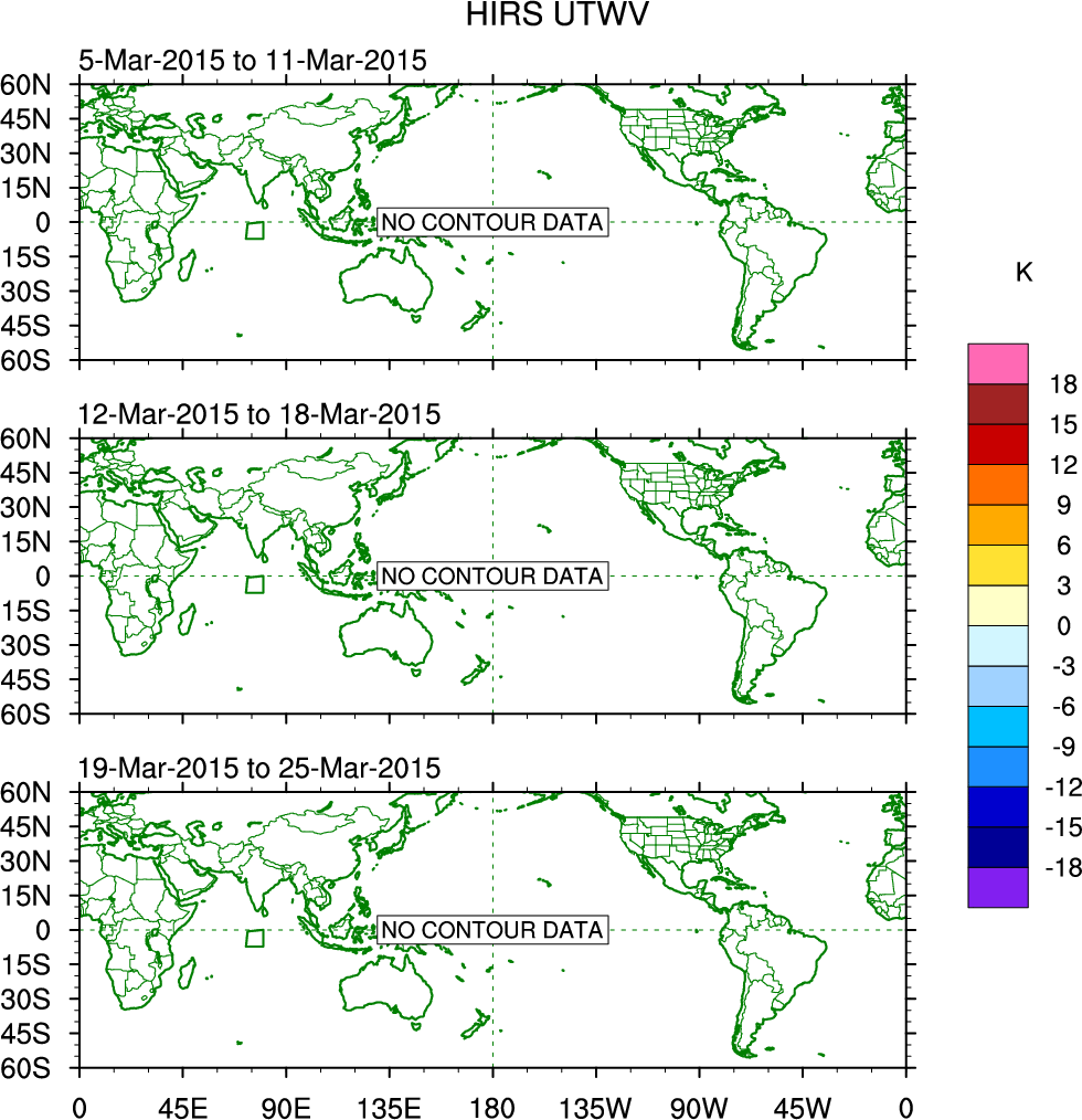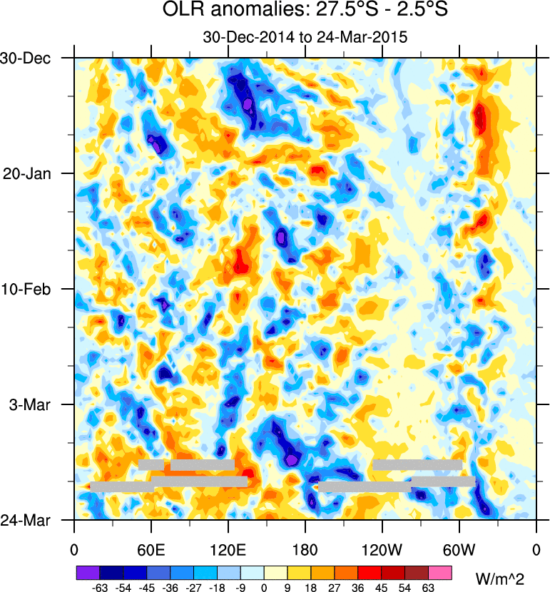 To identify tropical waves in near real-time, the OLR and UTWV data are filtered following Wheeler & Weickmann (2001 MWR). The daily anomalies are calculated using the first 3 harmonics of the seasonal cycle for 1979–2009. Missing values are then filled using linear interpolation in space and time. The most recent 365 days of anomalies are padded with 659 days of zeroes, and the result is filtered for each wave type.