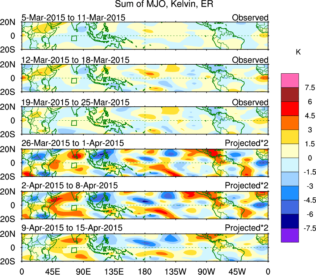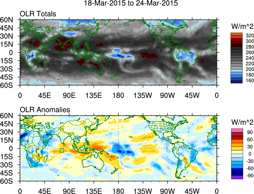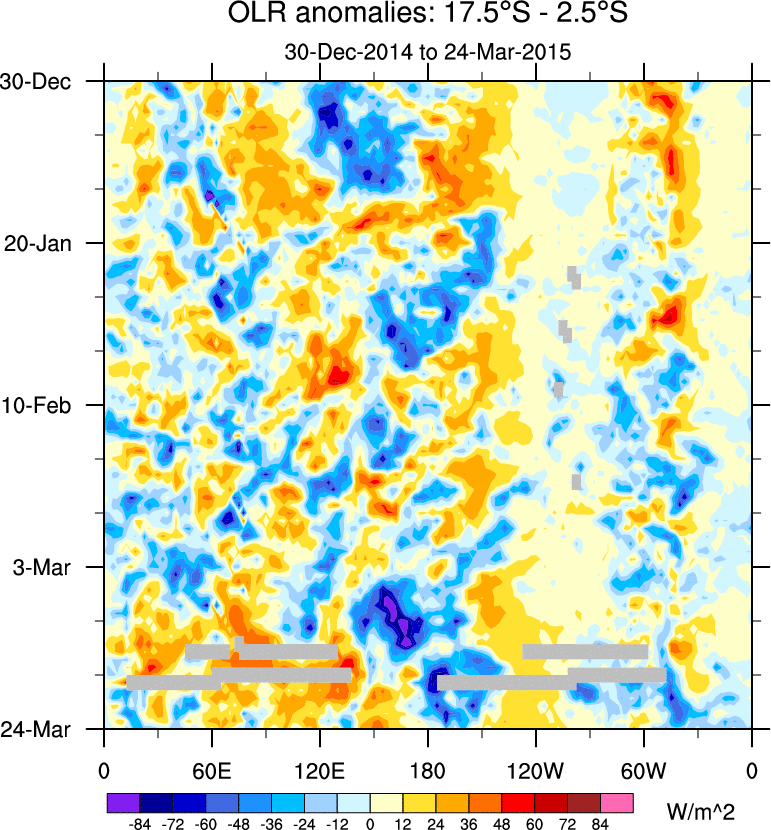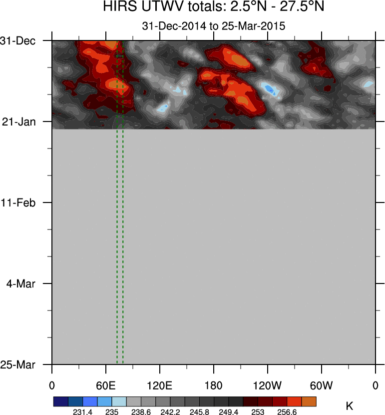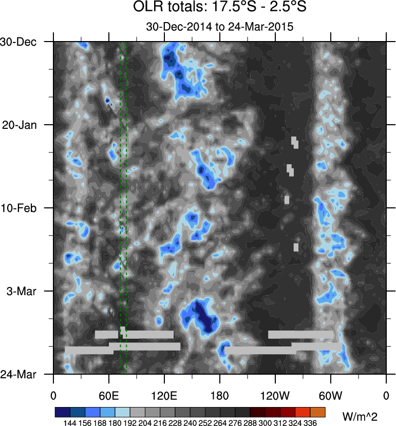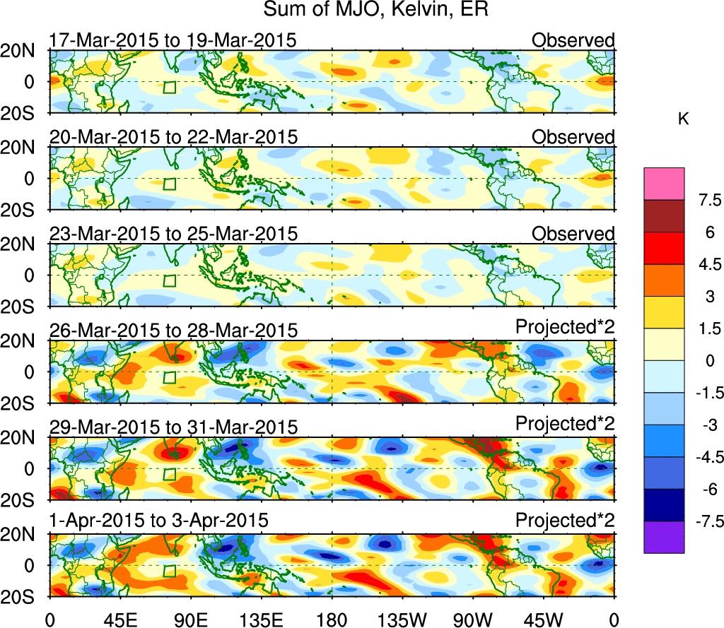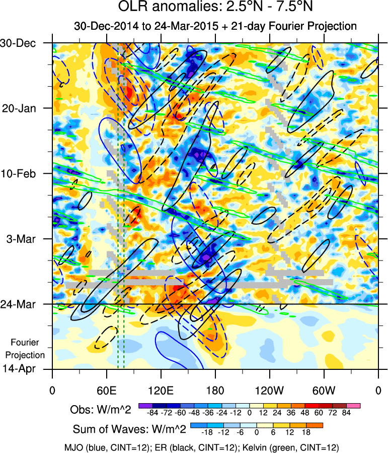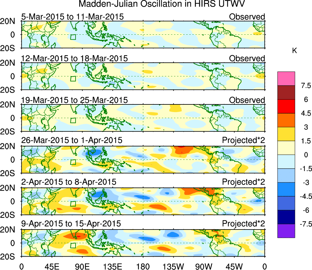 To identify tropical waves in near real-time, the OLR and UTWV data are filtered following Wheeler & Weickmann (2001 MWR). The daily anomalies are calculated using the first 3 harmonics of the seasonal cycle for 1979–2009. Missing values are then filled using linear interpolation in space and time. The most recent 365 days of anomalies are padded with 659 days of zeroes, and the result is filtered for each wave type.