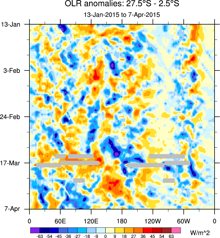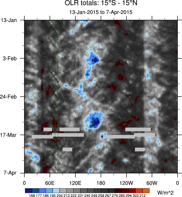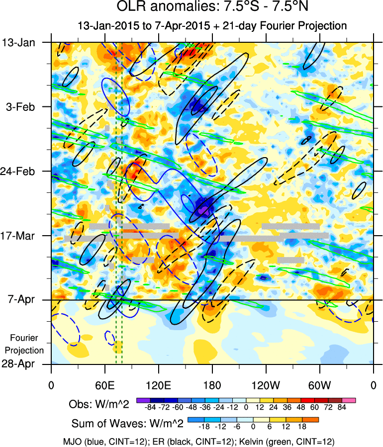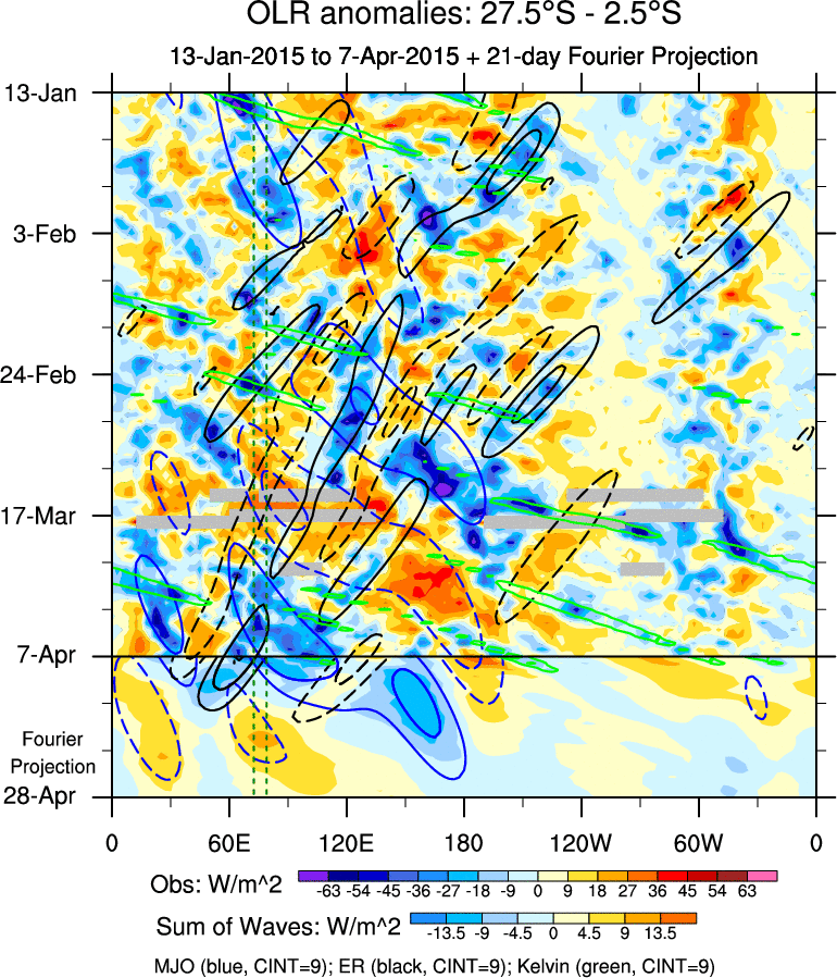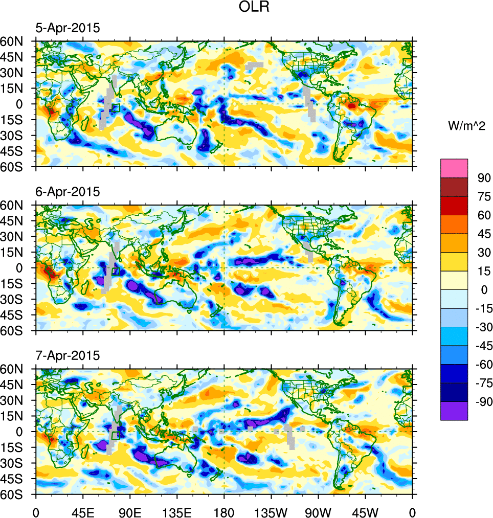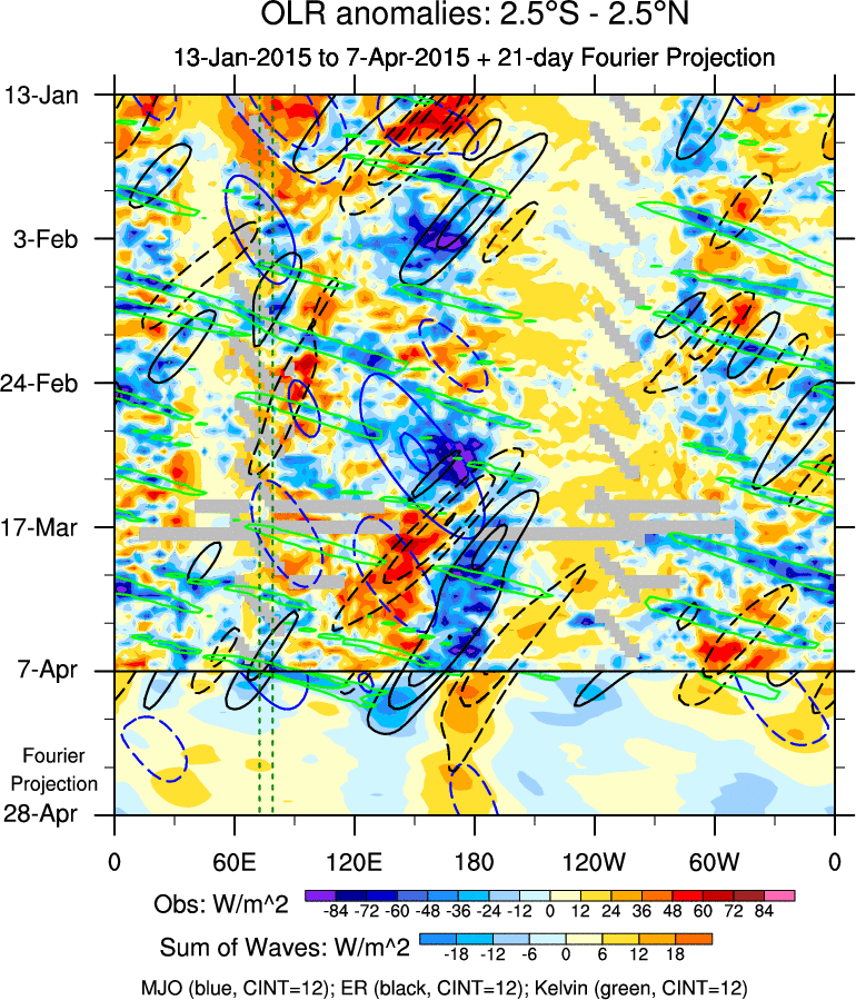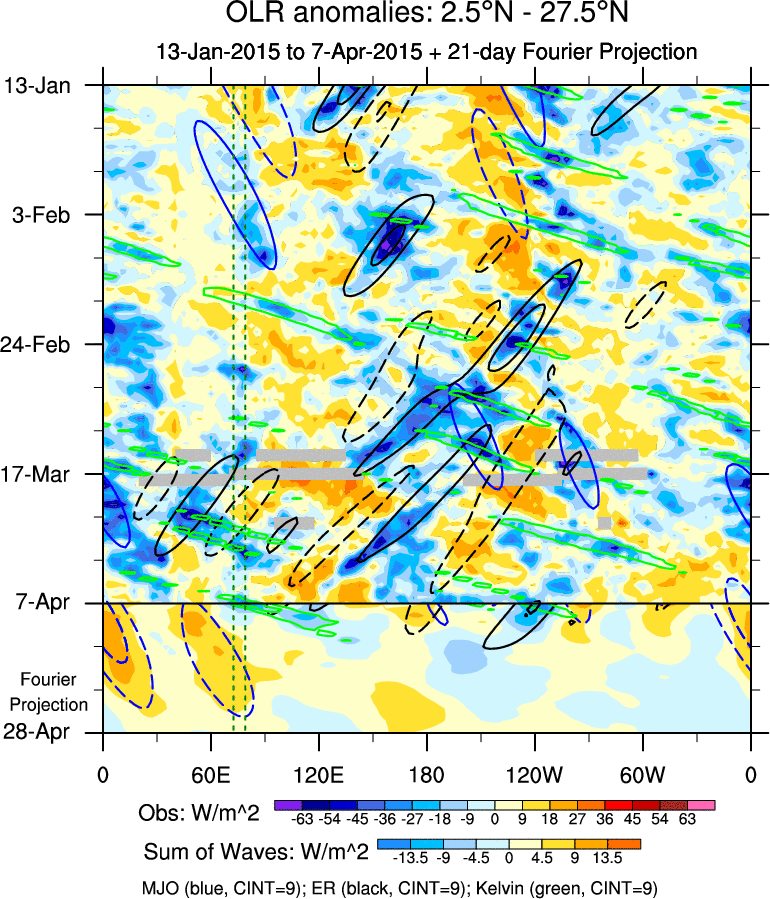 To identify tropical waves in near real-time, the OLR and UTWV data are filtered following Wheeler & Weickmann (2001 MWR). The daily anomalies are calculated using the first 3 harmonics of the seasonal cycle for 1979–2009. Missing values are then filled using linear interpolation in space and time. The most recent 365 days of anomalies are padded with 659 days of zeroes, and the result is filtered for each wave type.