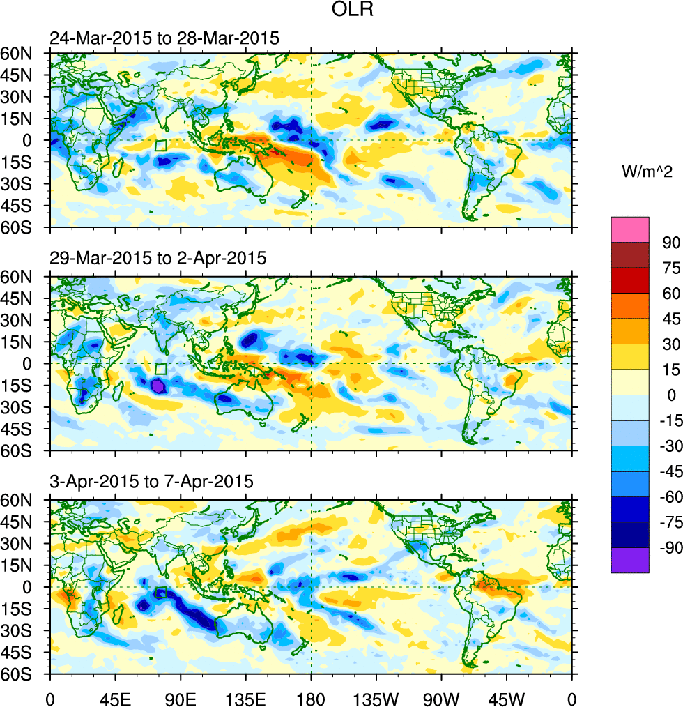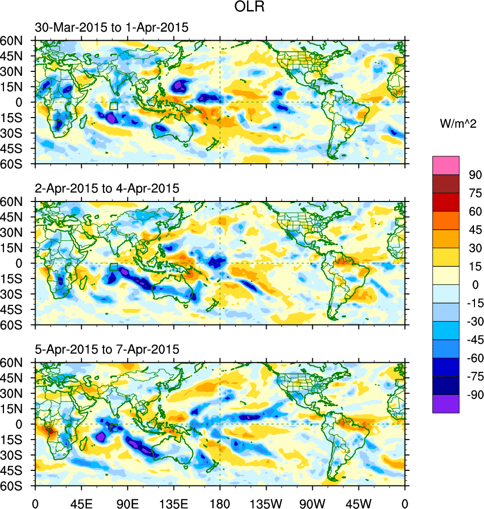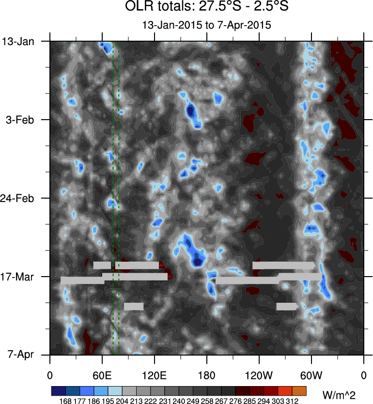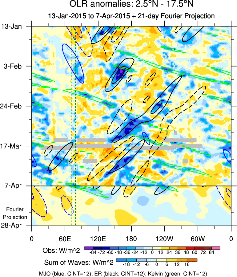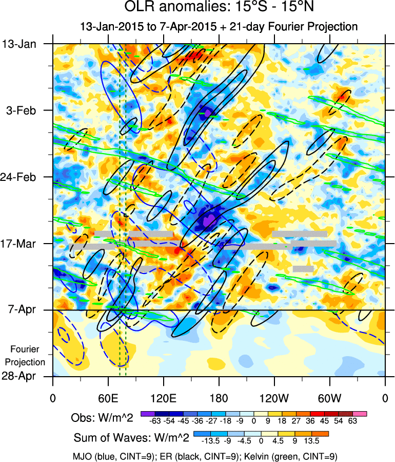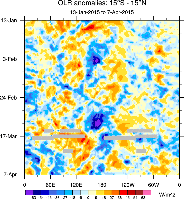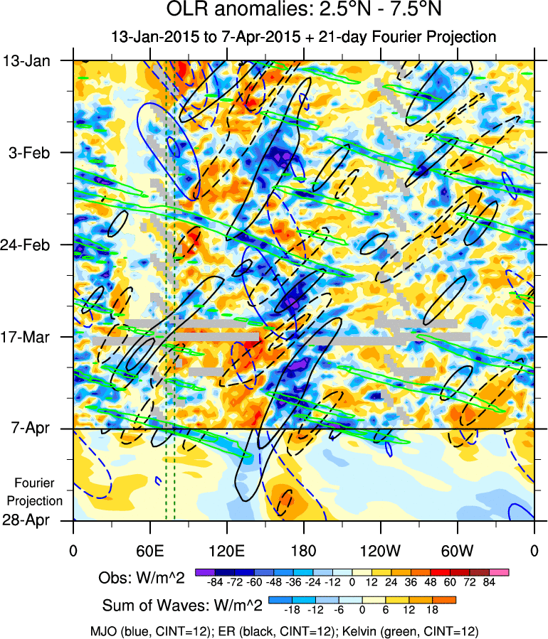 To identify tropical waves in near real-time, the OLR and UTWV data are filtered following Wheeler & Weickmann (2001 MWR). The daily anomalies are calculated using the first 3 harmonics of the seasonal cycle for 1979–2009. Missing values are then filled using linear interpolation in space and time. The most recent 365 days of anomalies are padded with 659 days of zeroes, and the result is filtered for each wave type.