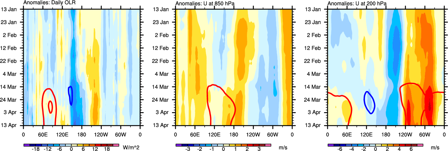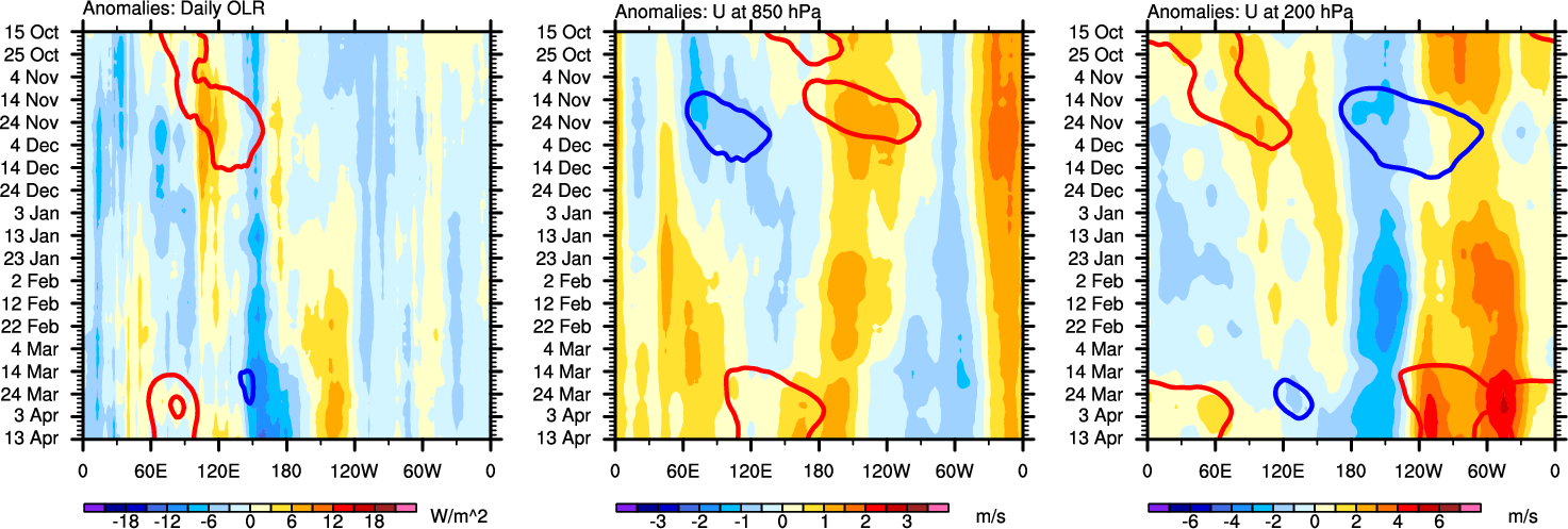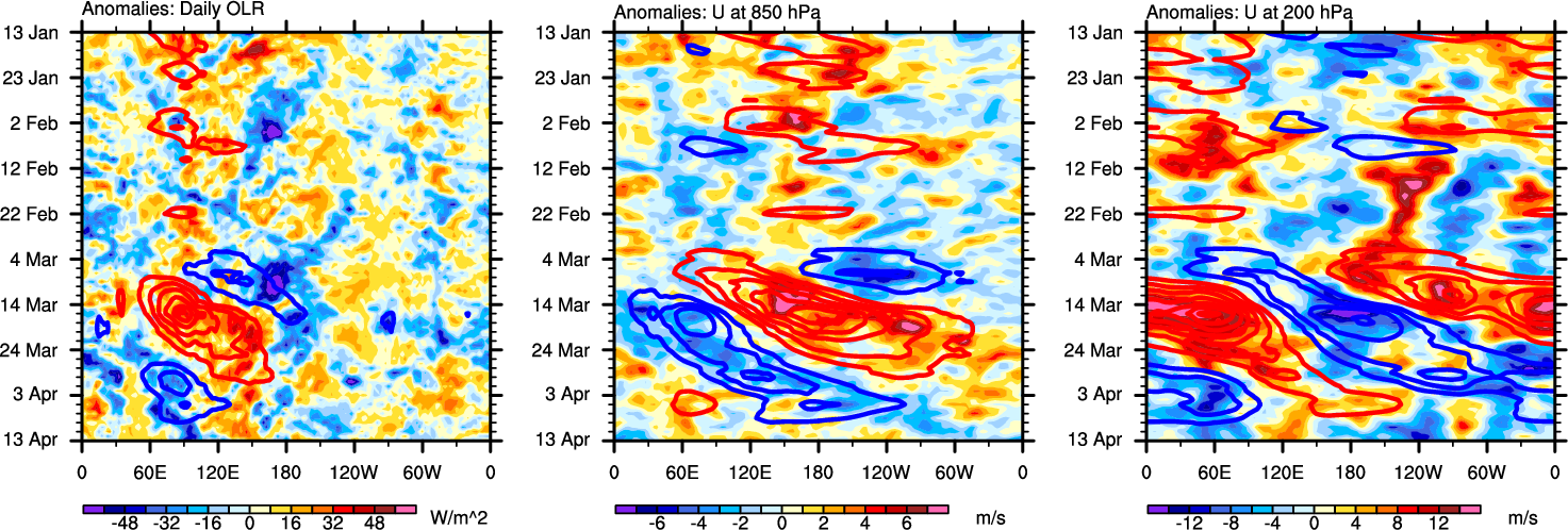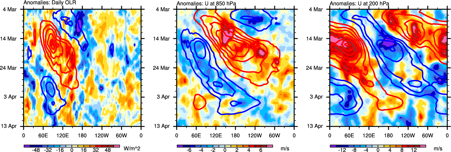 The Hovmöllers show longitude-time plots for OLR, U-850, and U-200. The shading indicates the observed anomalies, while the contours are the projection of those anomalies onto the RMM EOFs.