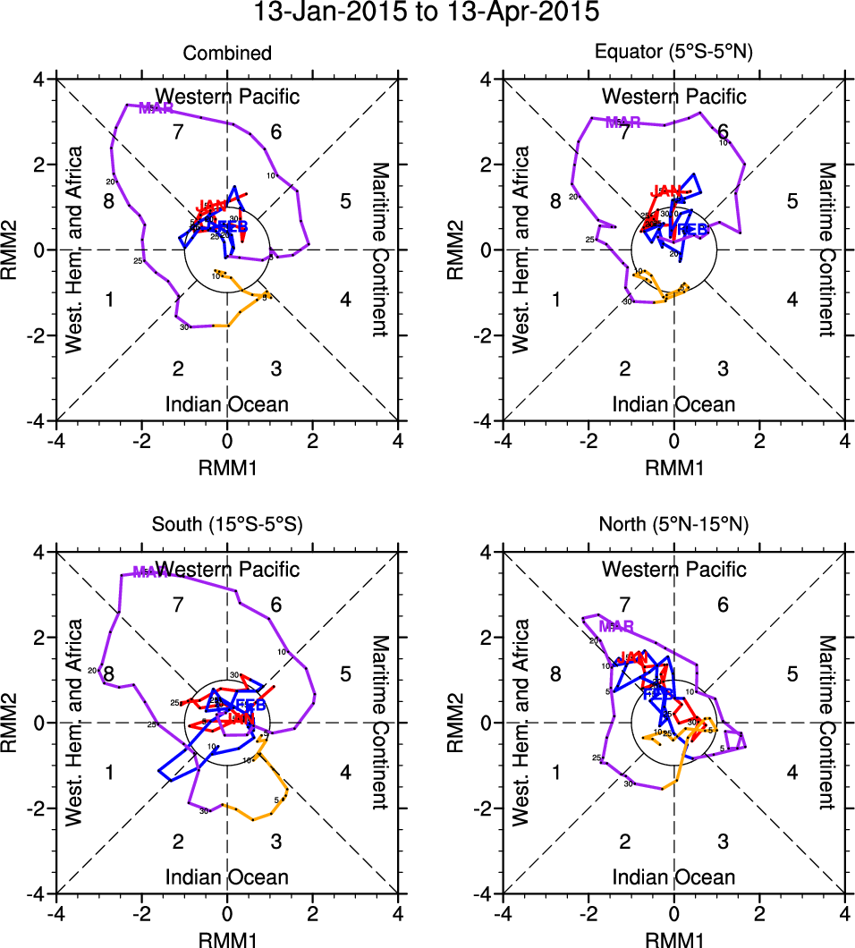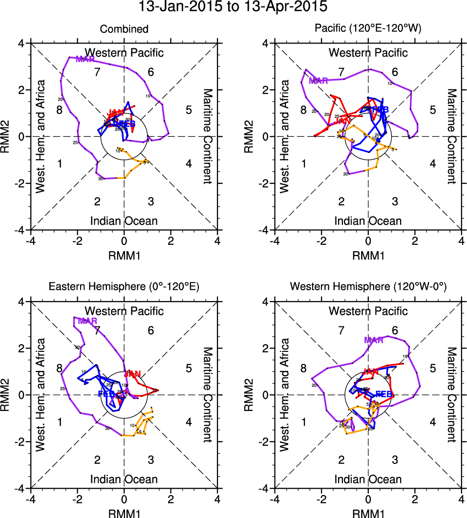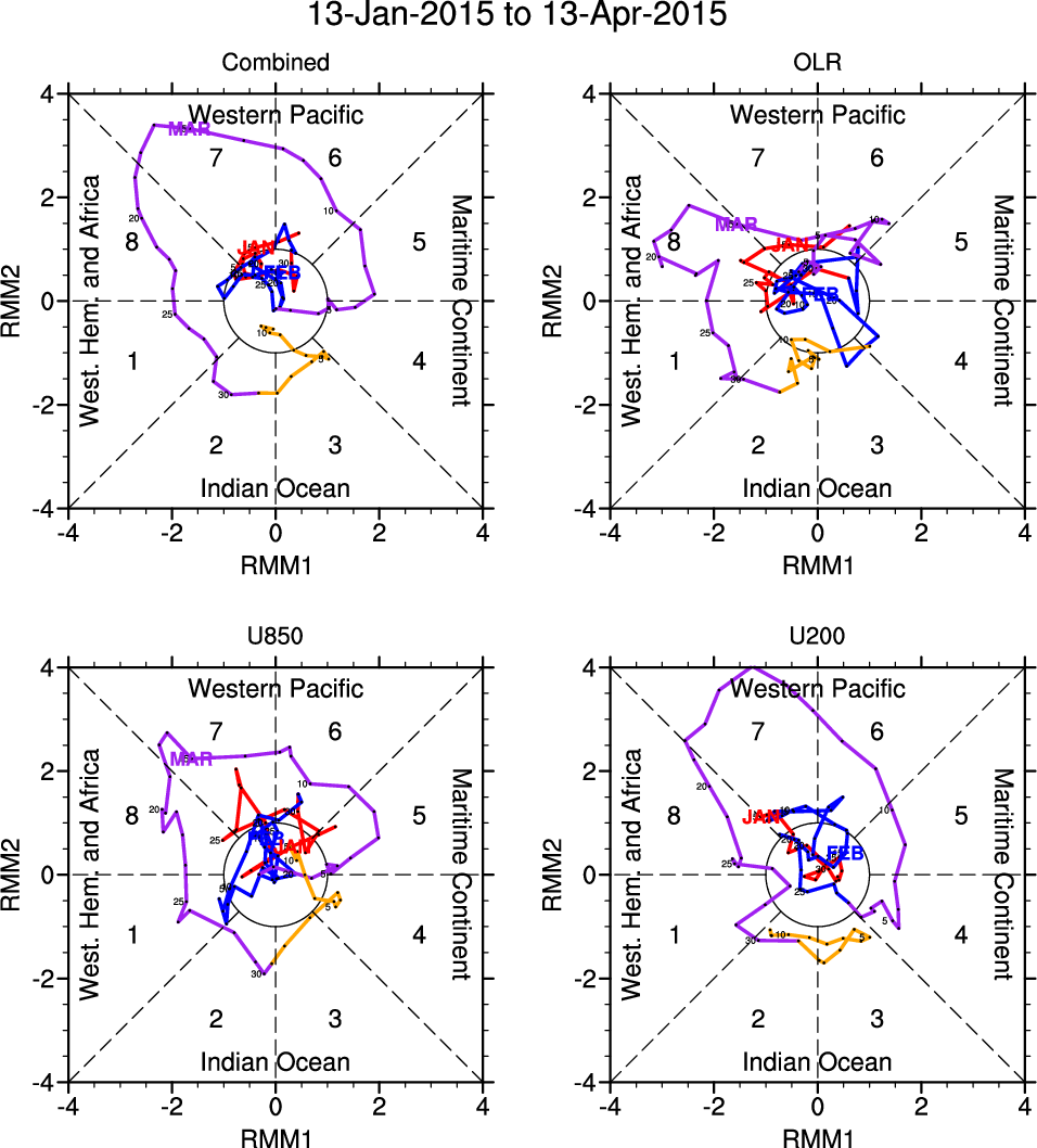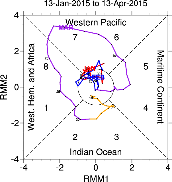 Wheeler and Hendon (2004) constructed the RMM index for monitoring the MJO. This index consists of the first two principal components (PCs) of OLR, 850-hPa zonal wind, and 200-hPa zonal wind averaged 15S-15N.