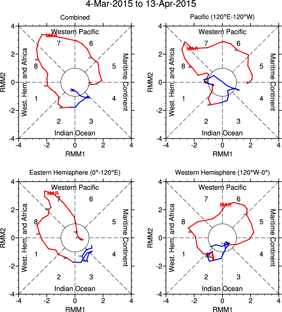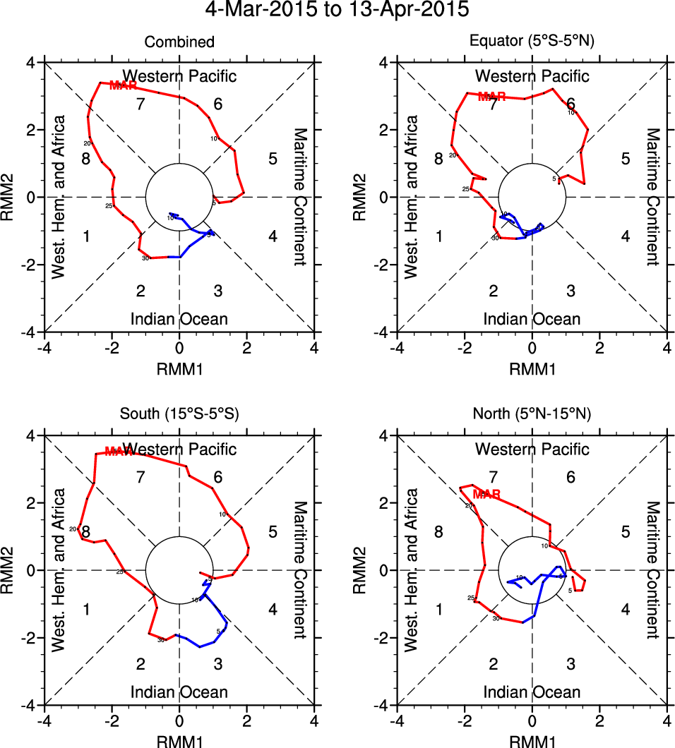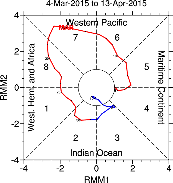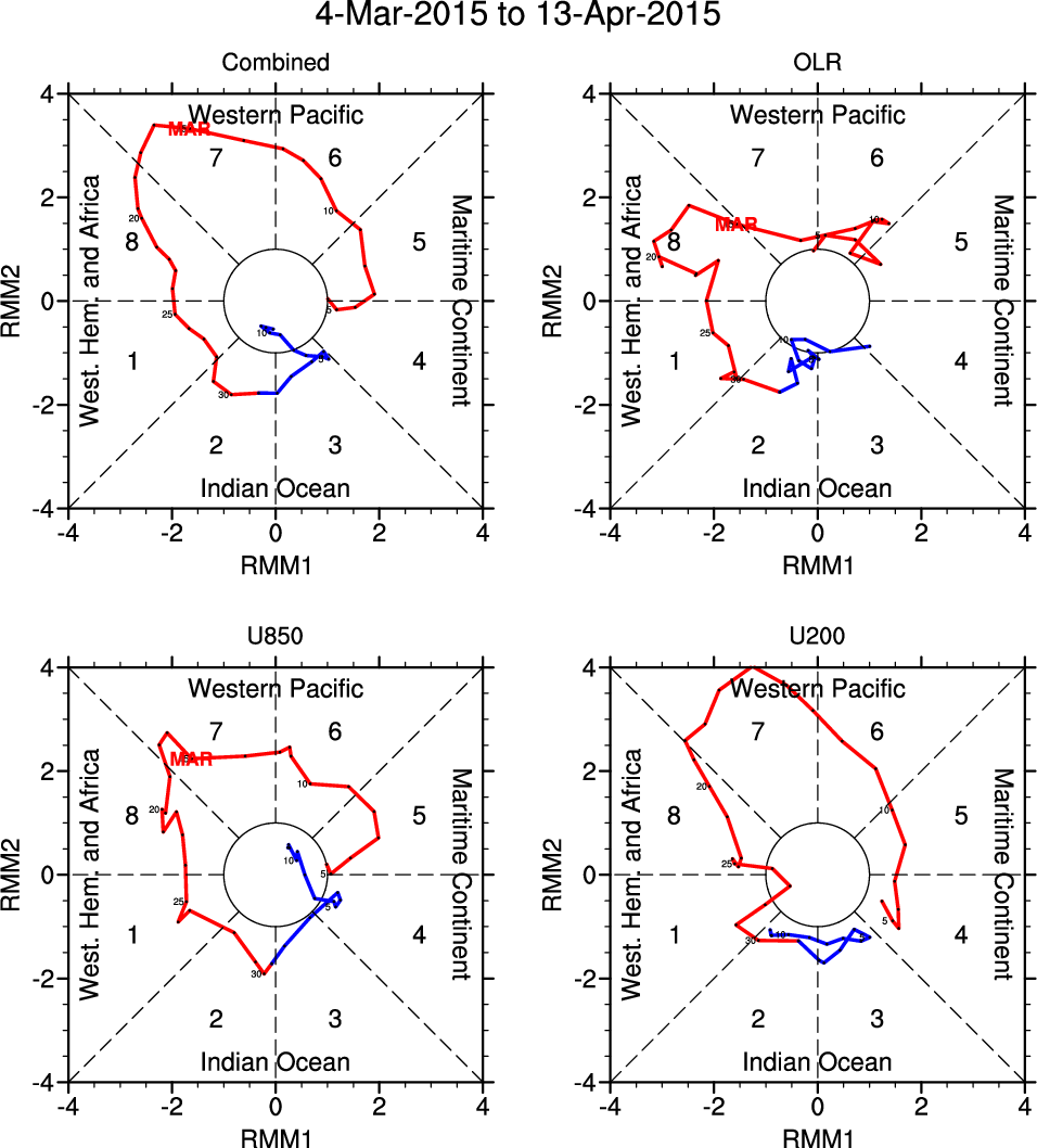 Wheeler and Hendon (2004) constructed the RMM index for monitoring the MJO. This index consists of the first two principal components (PCs) of OLR, 850-hPa zonal wind, and 200-hPa zonal wind averaged 15S-15N.