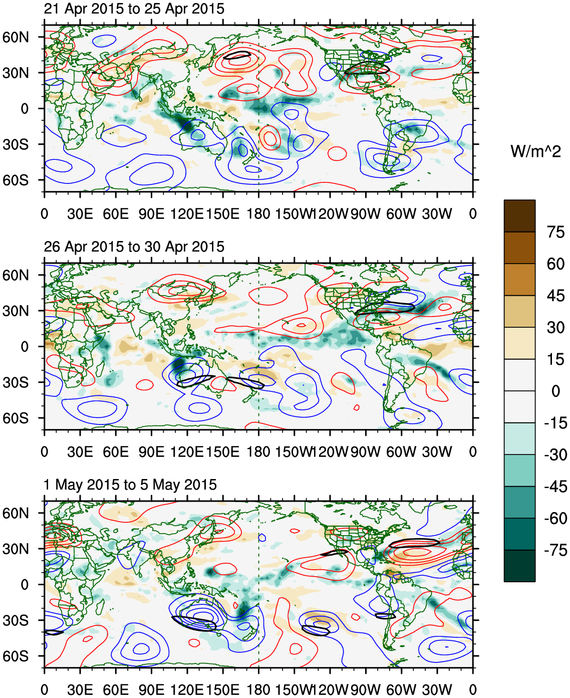 Maps of 500-hPa geopotential height anomalies (contoured every 30 m) and significant 850-hPa temperature anomalies, as shown in Schreck et al. (2013).