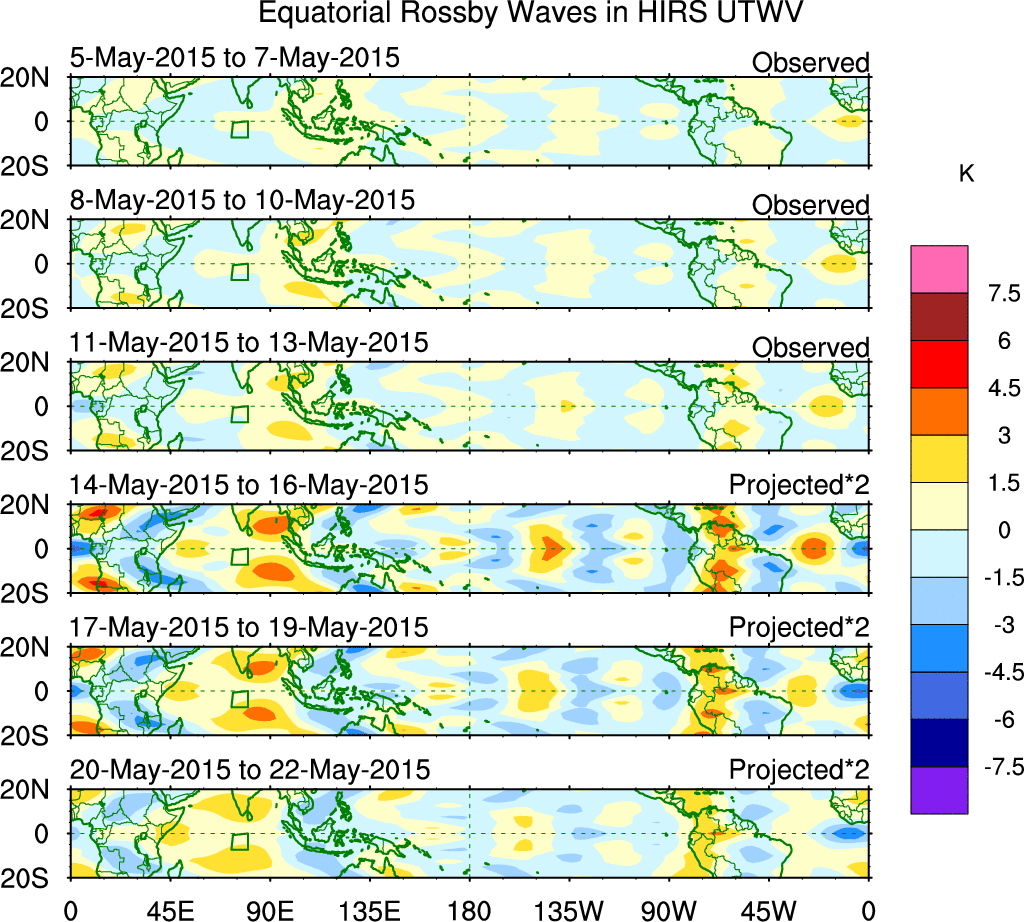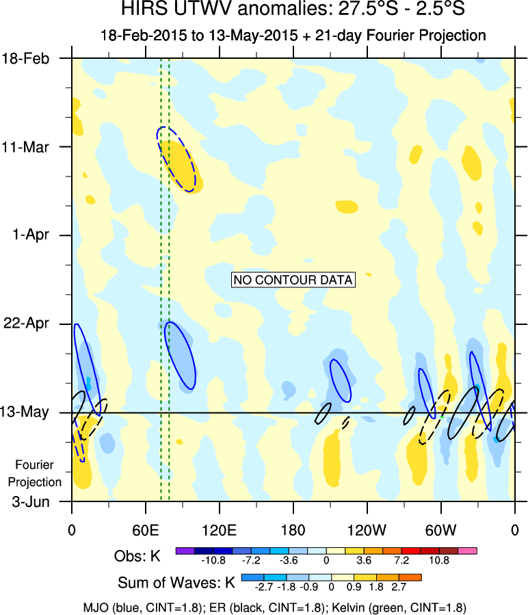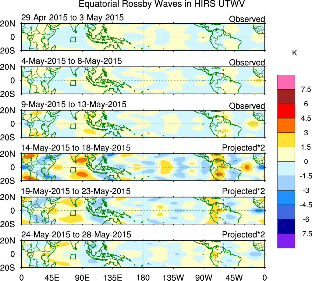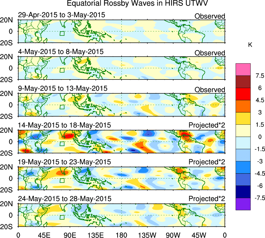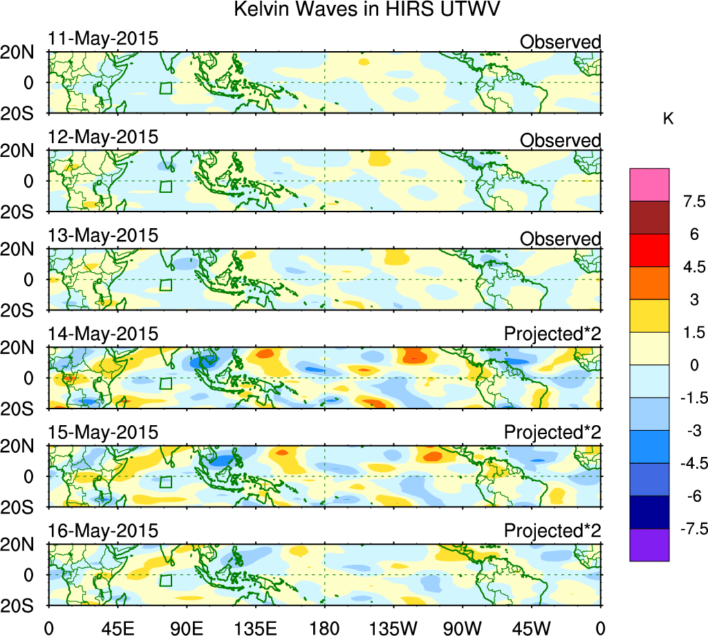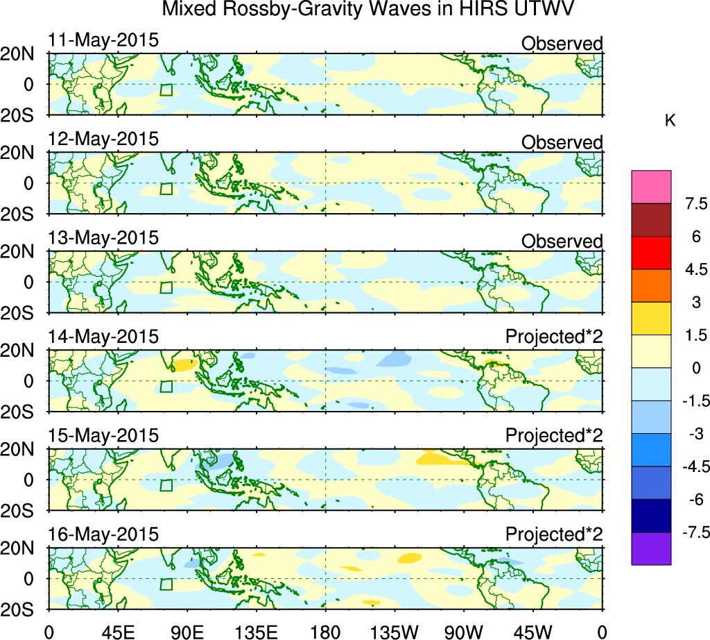 To identify tropical waves in near real-time, the OLR and UTWV data are filtered following Wheeler & Weickmann (2001 MWR). The daily anomalies are calculated using the first 3 harmonics of the seasonal cycle for 1979–2009. Missing values are then filled using linear interpolation in space and time. The most recent 365 days of anomalies are padded with 659 days of zeroes, and the result is filtered for each wave type.