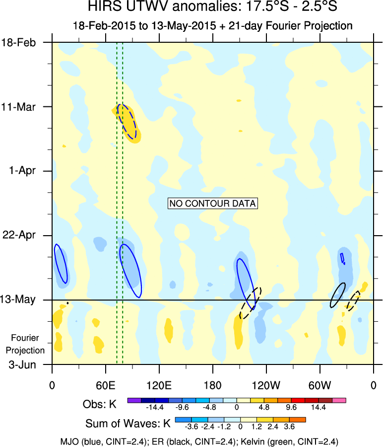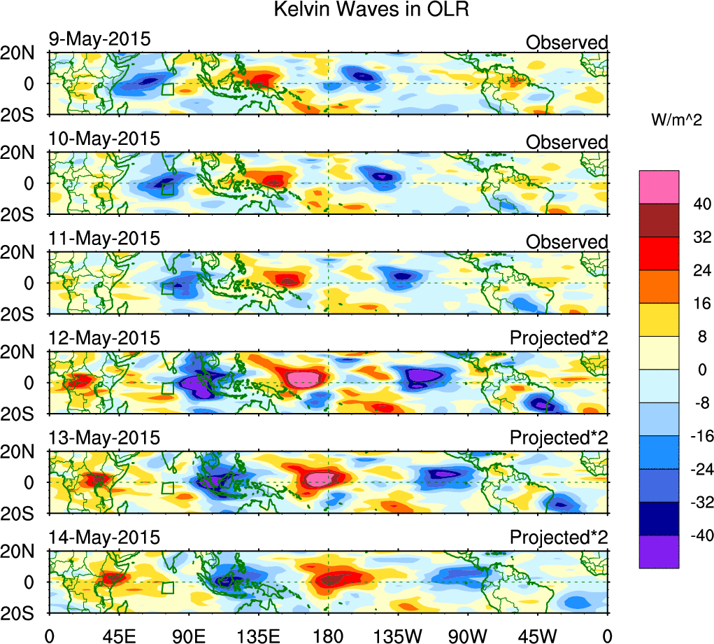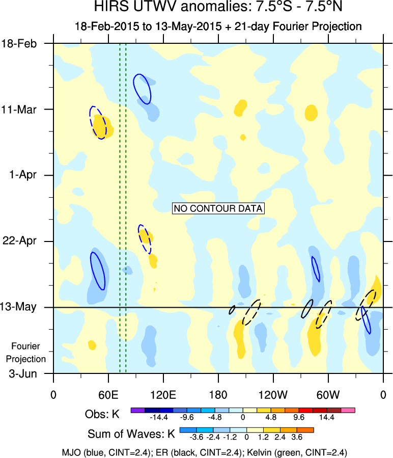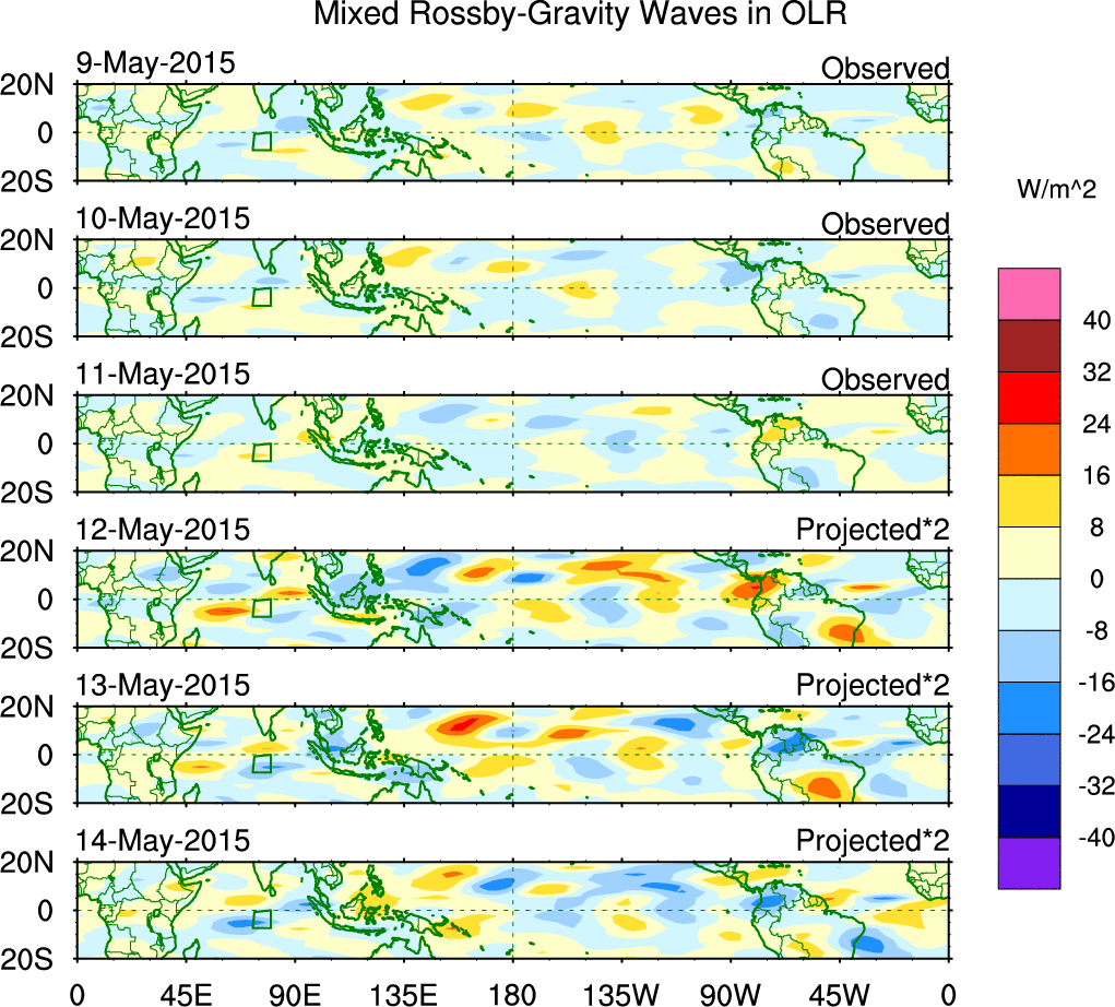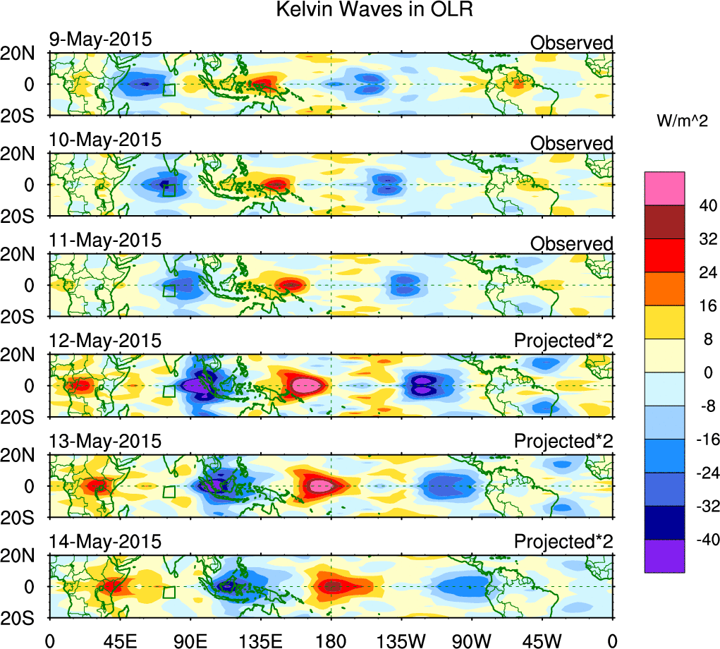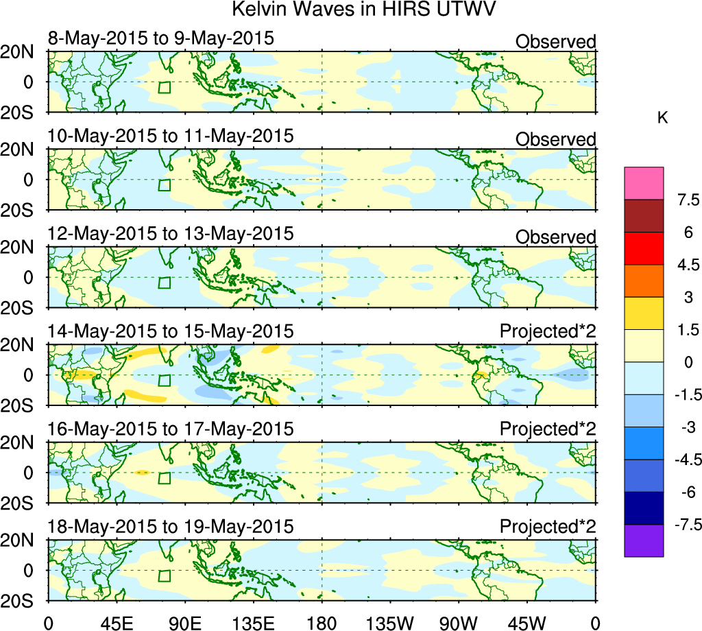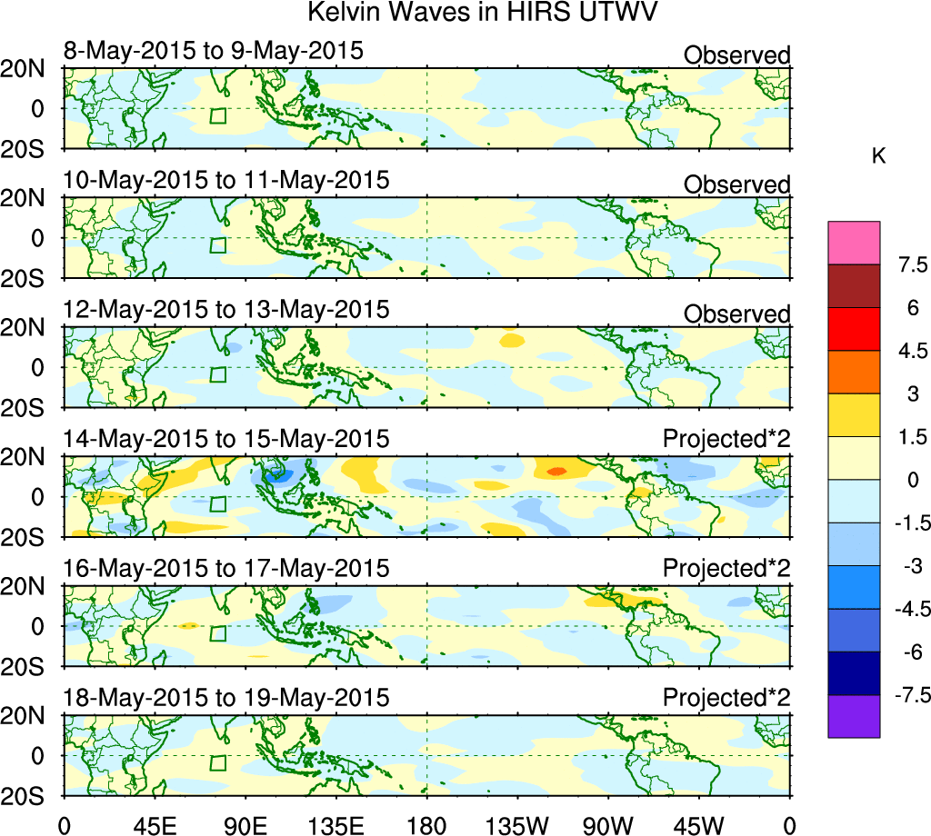 To identify tropical waves in near real-time, the OLR and UTWV data are filtered following Wheeler & Weickmann (2001 MWR). The daily anomalies are calculated using the first 3 harmonics of the seasonal cycle for 1979–2009. Missing values are then filled using linear interpolation in space and time. The most recent 365 days of anomalies are padded with 659 days of zeroes, and the result is filtered for each wave type.
