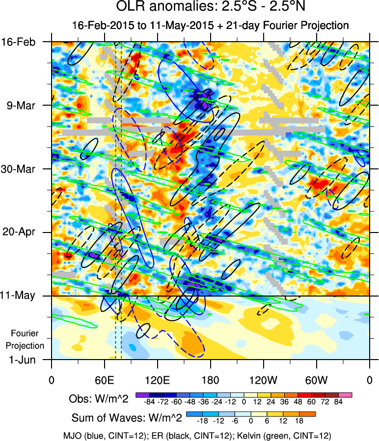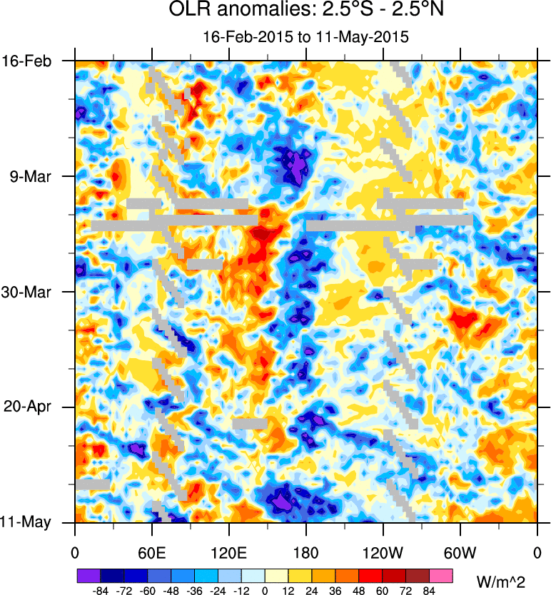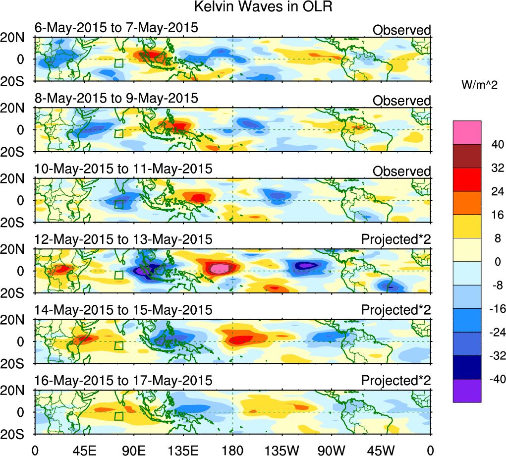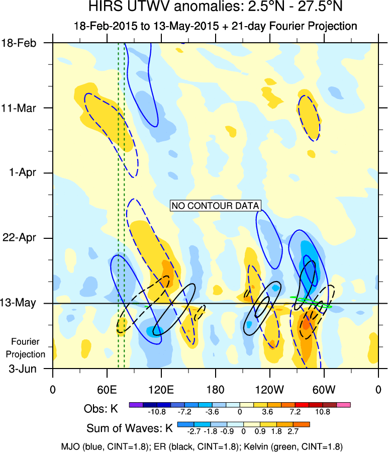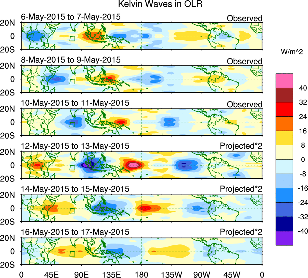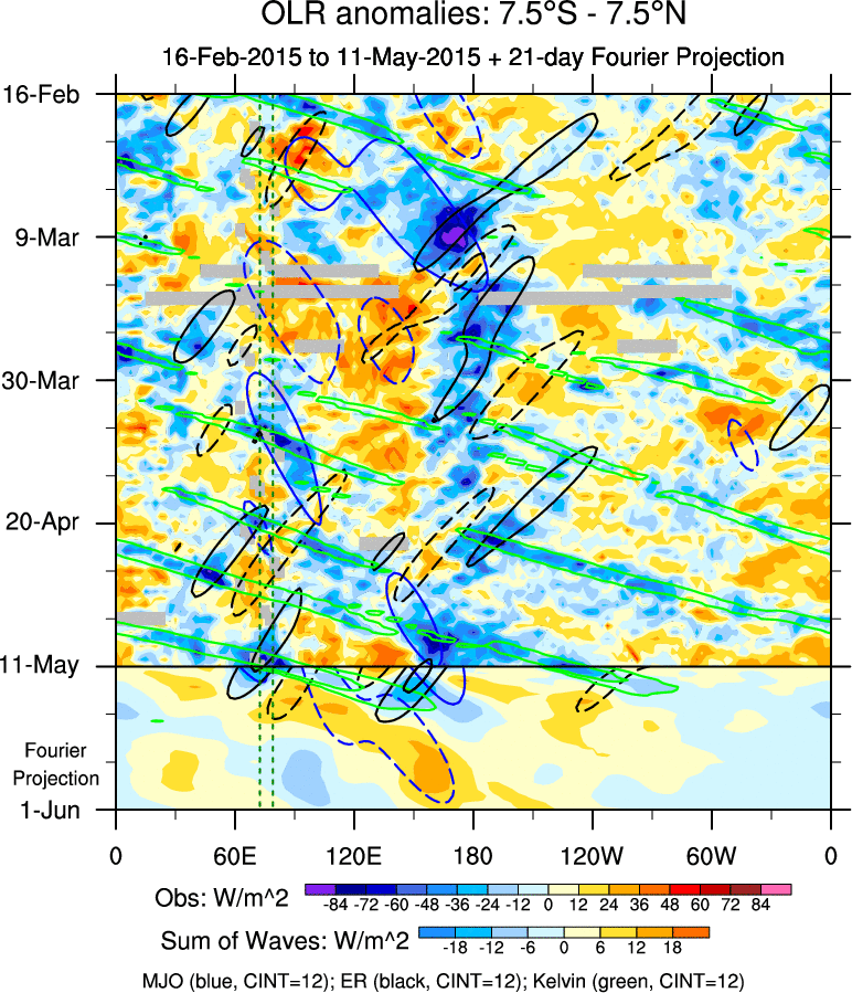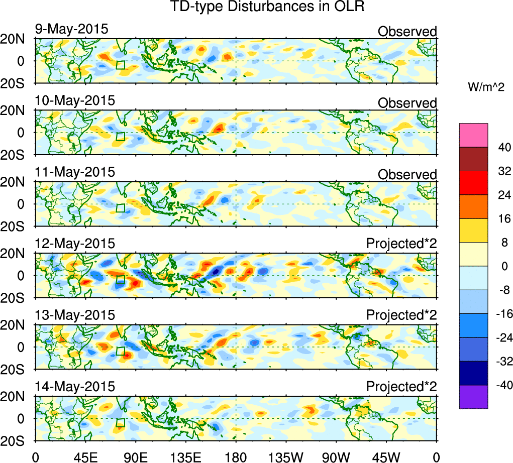 To identify tropical waves in near real-time, the OLR and UTWV data are filtered following Wheeler & Weickmann (2001 MWR). The daily anomalies are calculated using the first 3 harmonics of the seasonal cycle for 1979–2009. Missing values are then filled using linear interpolation in space and time. The most recent 365 days of anomalies are padded with 659 days of zeroes, and the result is filtered for each wave type.