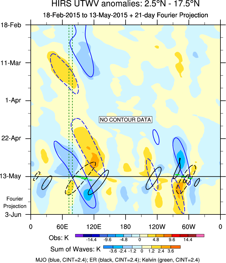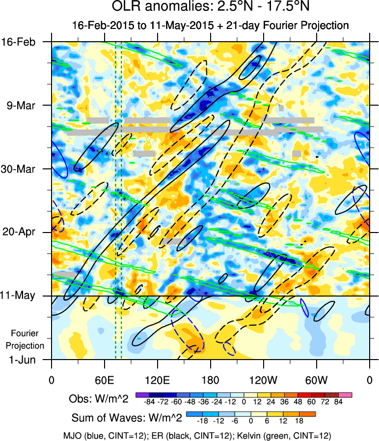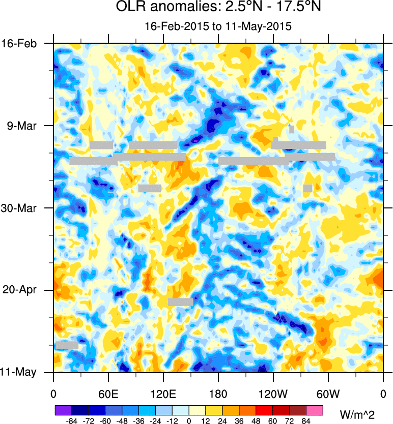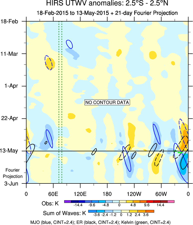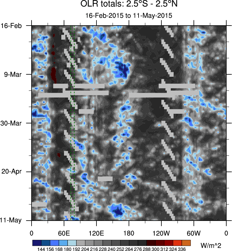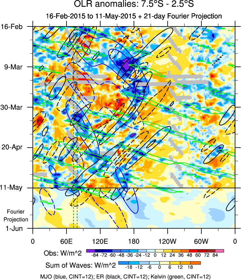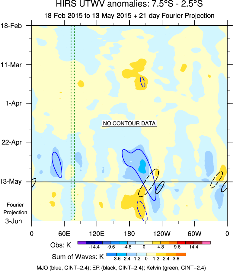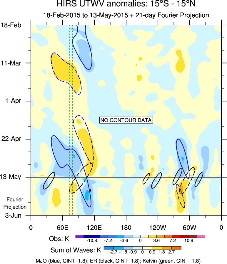 To identify tropical waves in near real-time, the OLR and UTWV data are filtered following Wheeler & Weickmann (2001 MWR). The daily anomalies are calculated using the first 3 harmonics of the seasonal cycle for 1979–2009. Missing values are then filled using linear interpolation in space and time. The most recent 365 days of anomalies are padded with 659 days of zeroes, and the result is filtered for each wave type.