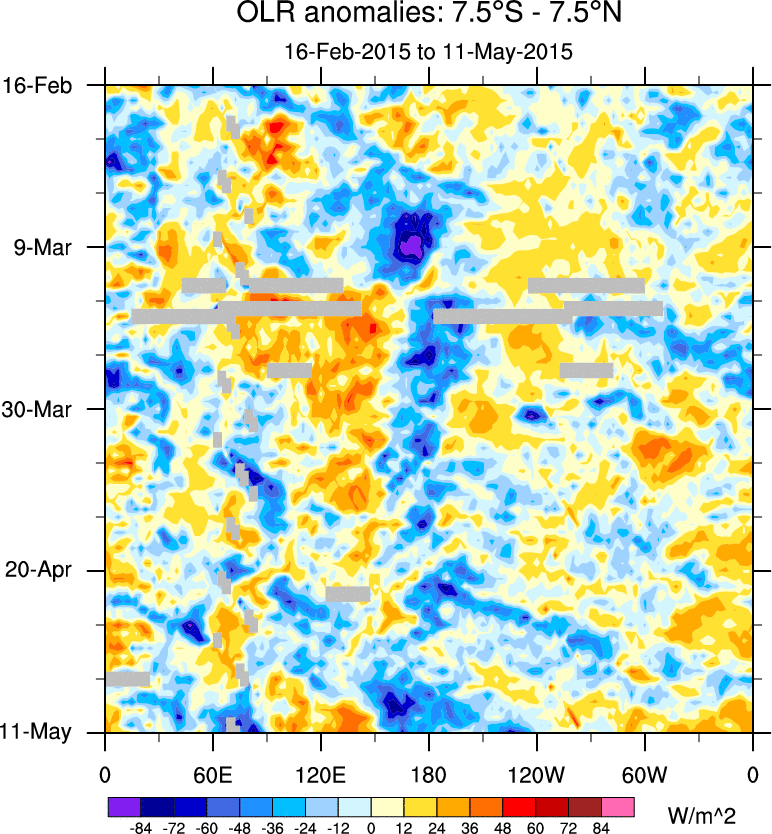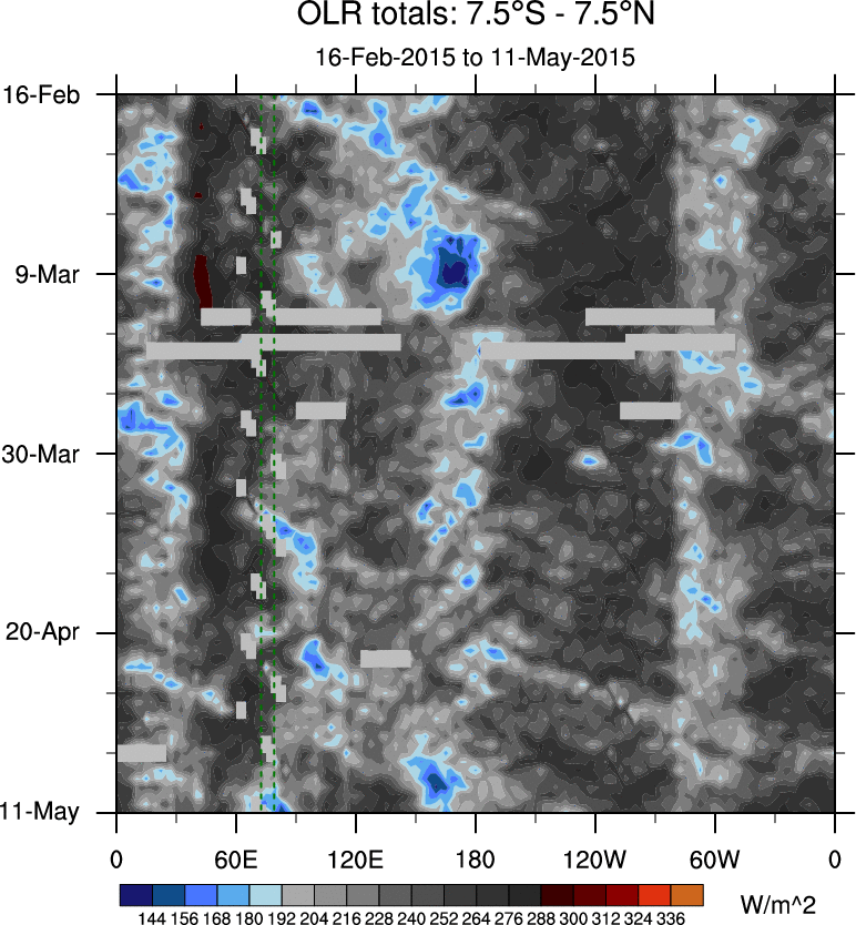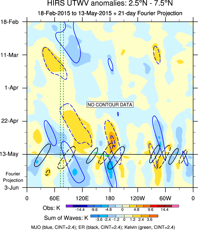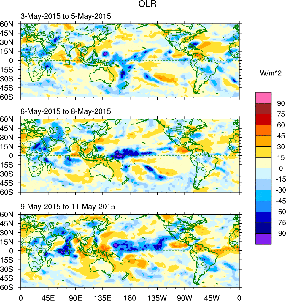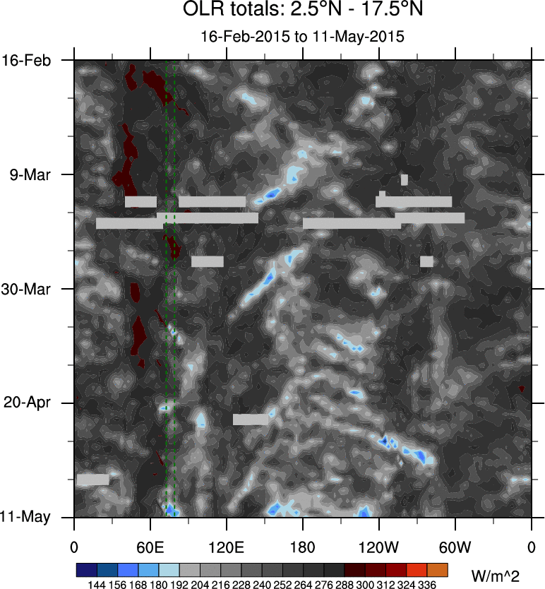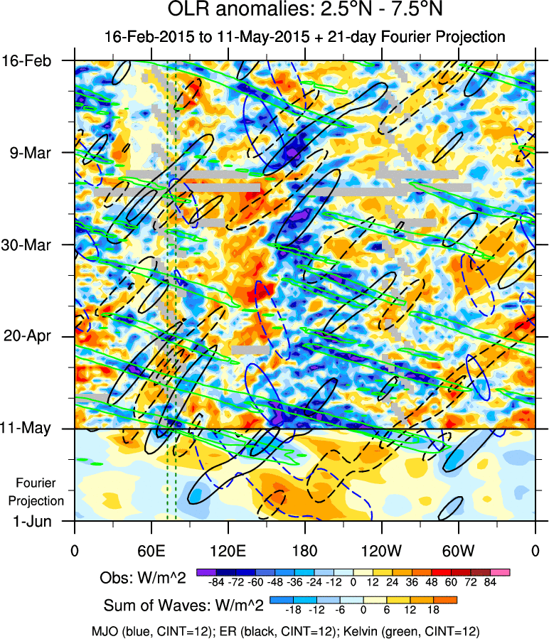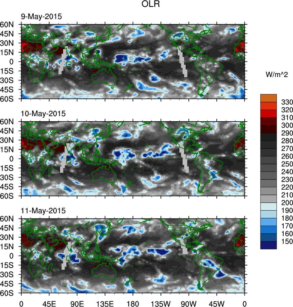 To identify tropical waves in near real-time, the OLR and UTWV data are filtered following Wheeler & Weickmann (2001 MWR). The daily anomalies are calculated using the first 3 harmonics of the seasonal cycle for 1979–2009. Missing values are then filled using linear interpolation in space and time. The most recent 365 days of anomalies are padded with 659 days of zeroes, and the result is filtered for each wave type.