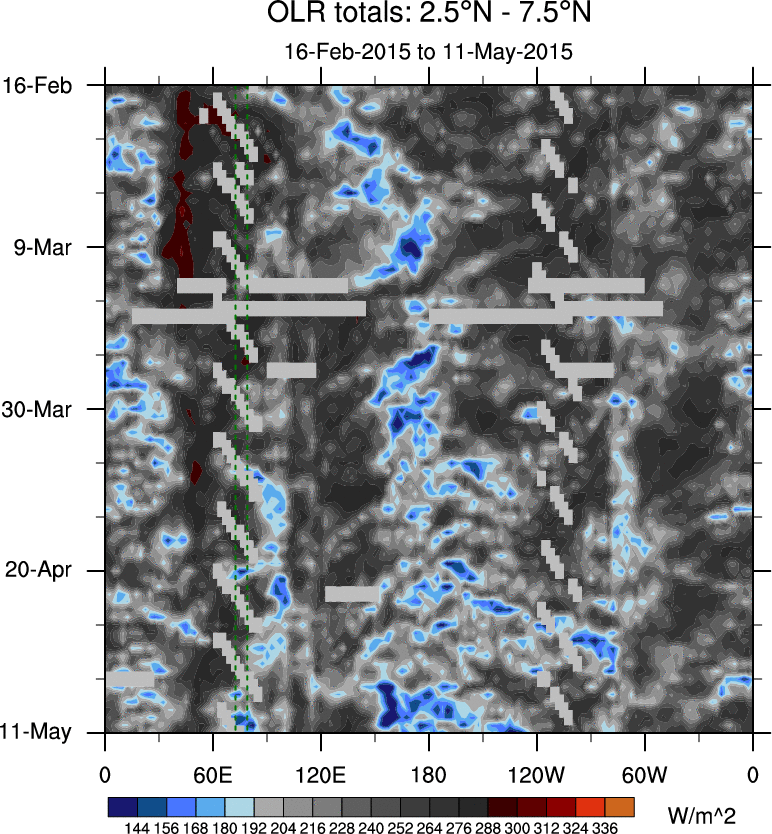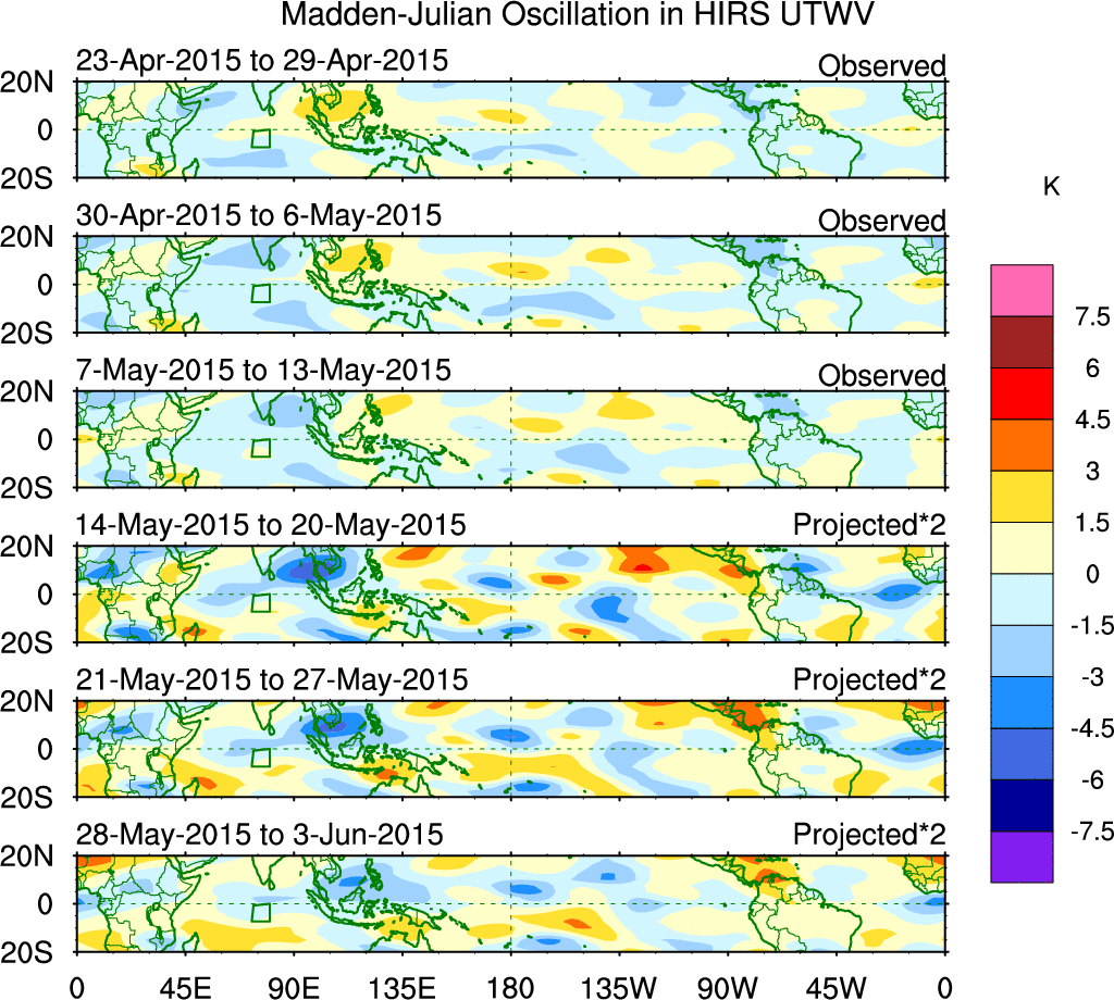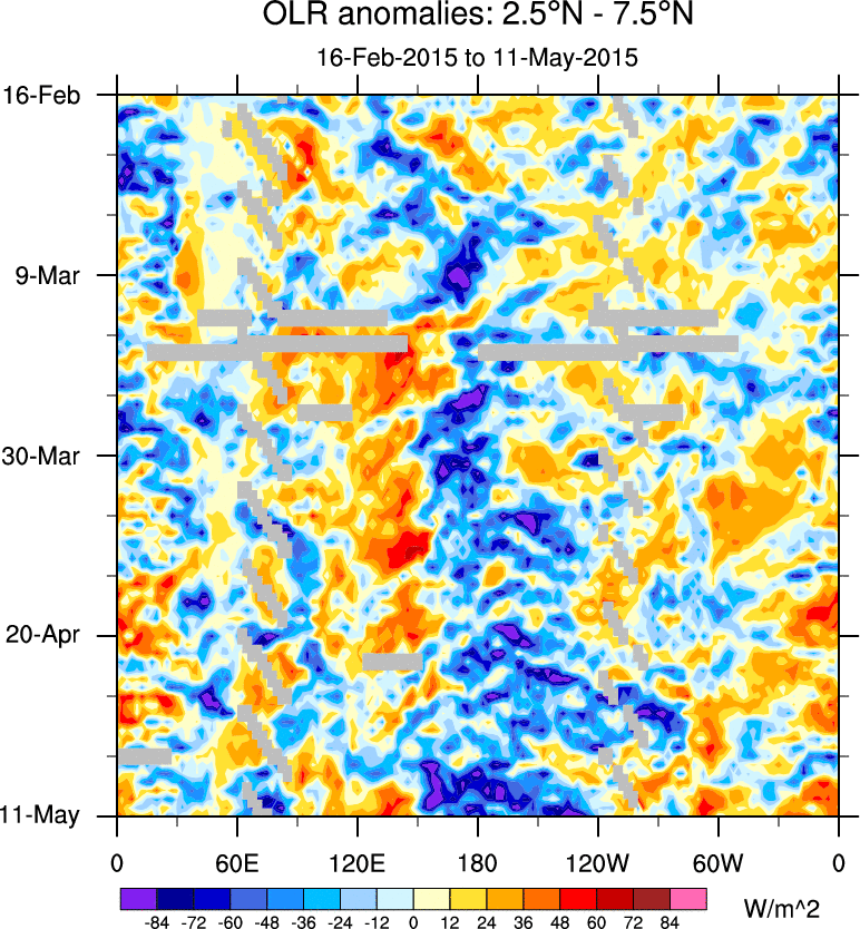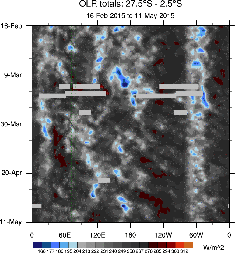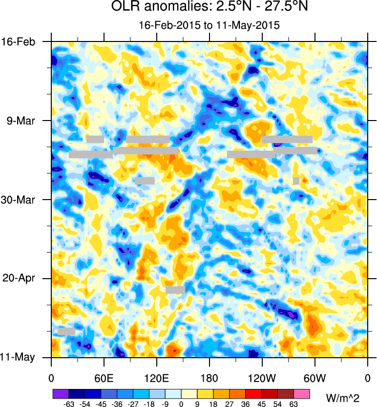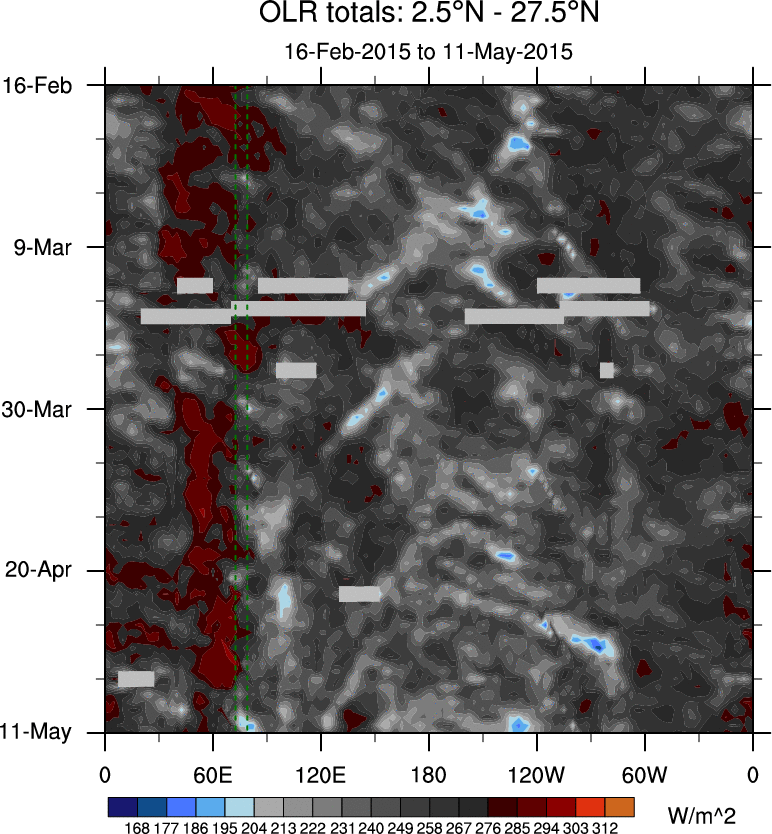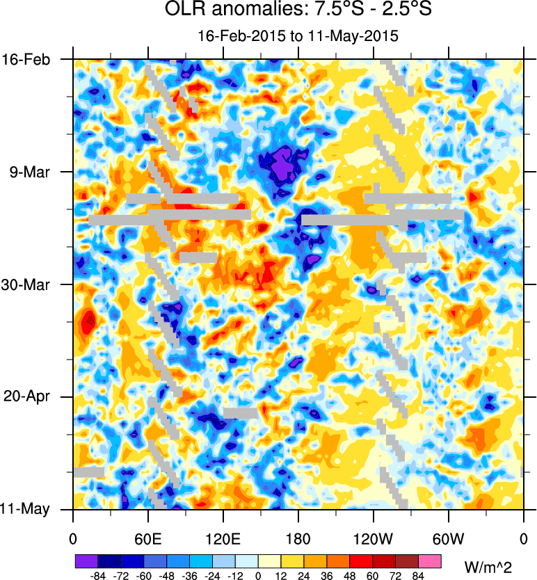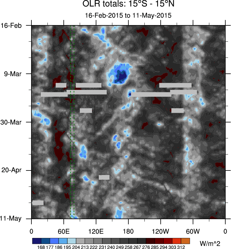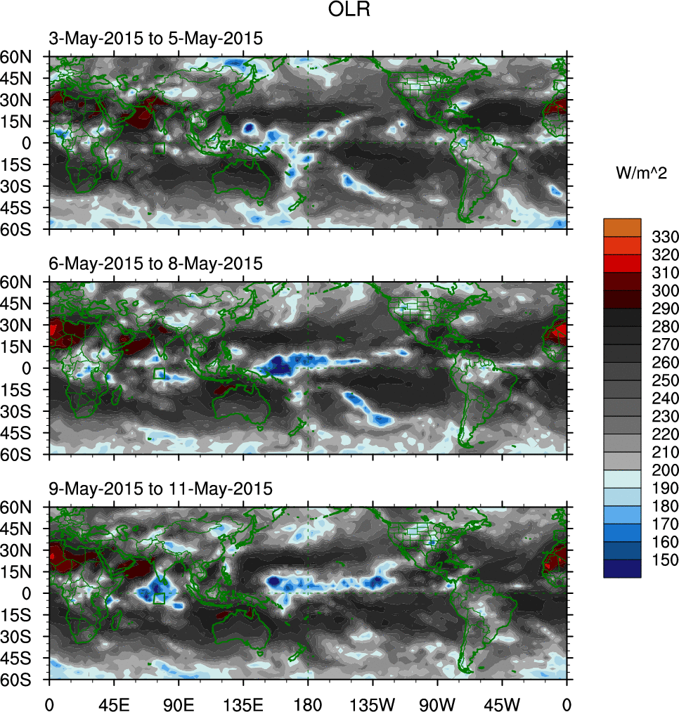 To identify tropical waves in near real-time, the OLR and UTWV data are filtered following Wheeler & Weickmann (2001 MWR). The daily anomalies are calculated using the first 3 harmonics of the seasonal cycle for 1979–2009. Missing values are then filled using linear interpolation in space and time. The most recent 365 days of anomalies are padded with 659 days of zeroes, and the result is filtered for each wave type.