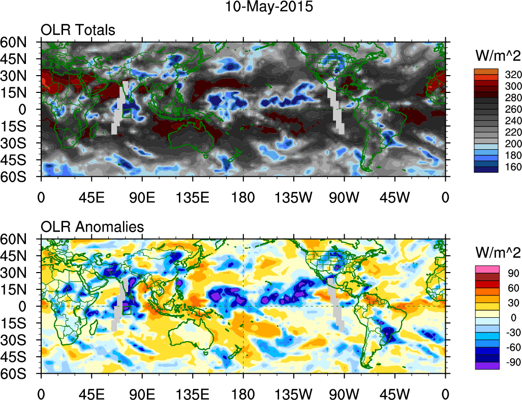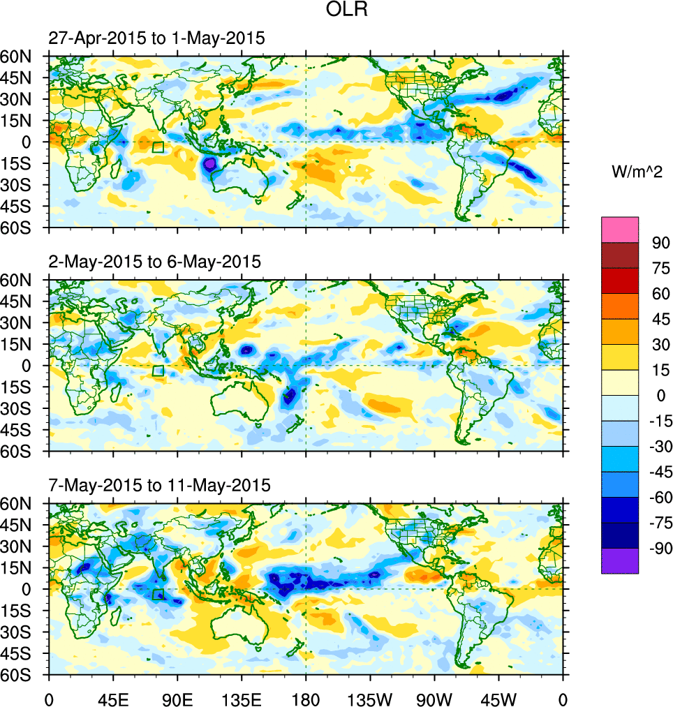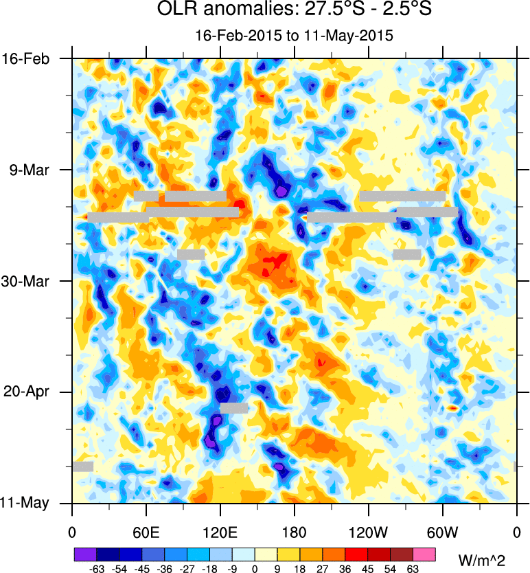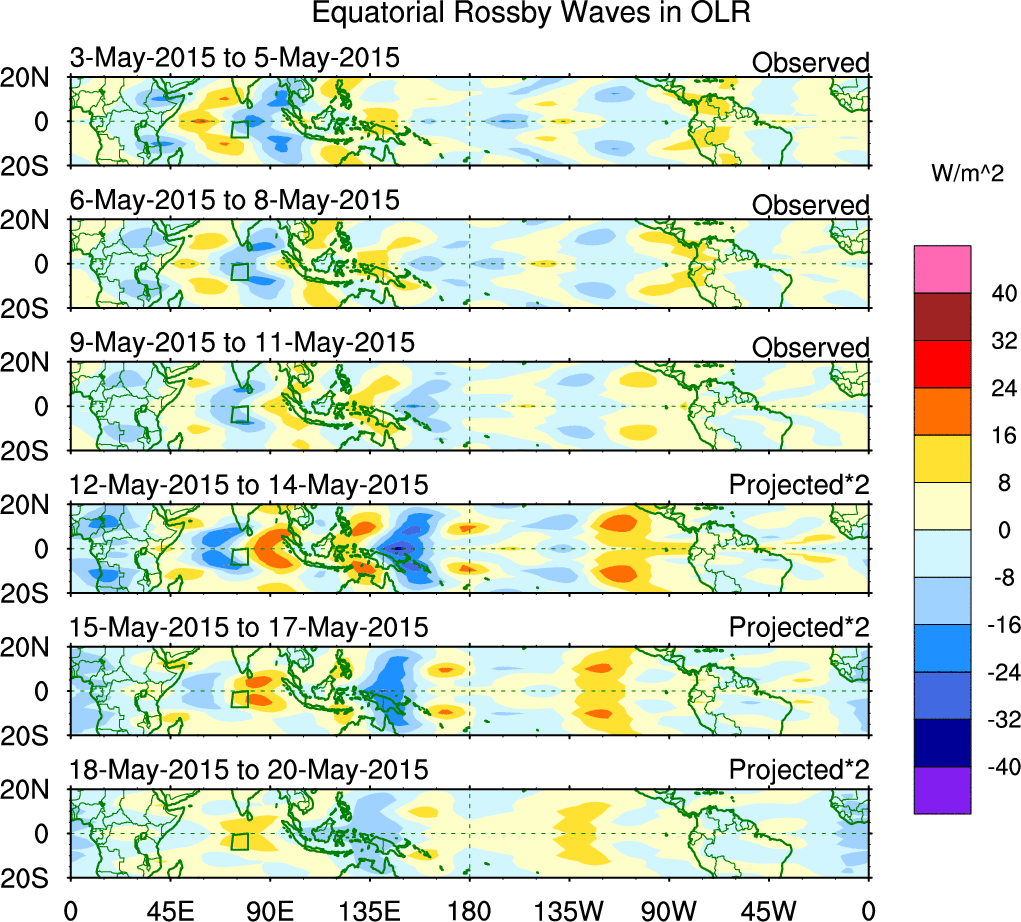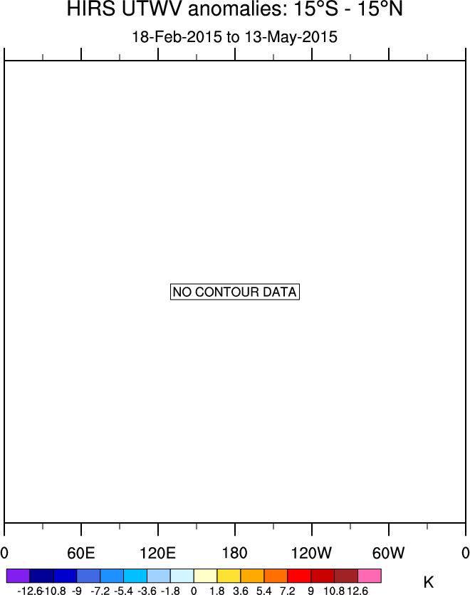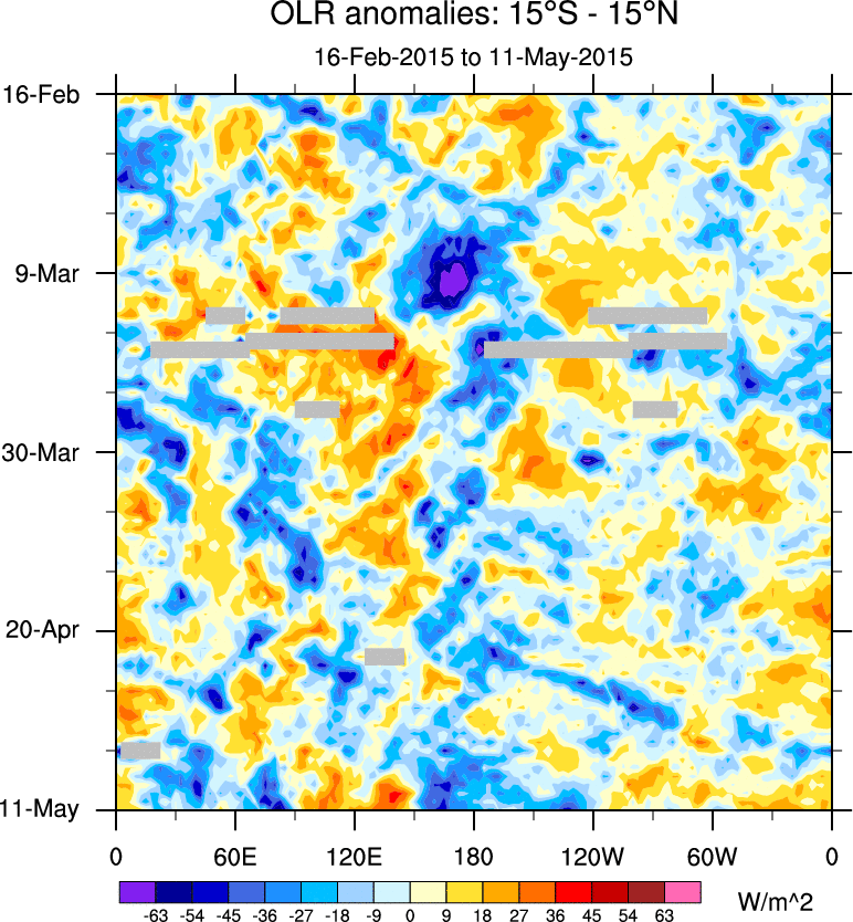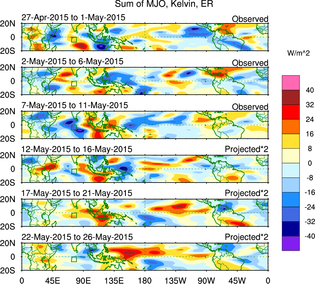 To identify tropical waves in near real-time, the OLR and UTWV data are filtered following Wheeler & Weickmann (2001 MWR). The daily anomalies are calculated using the first 3 harmonics of the seasonal cycle for 1979–2009. Missing values are then filled using linear interpolation in space and time. The most recent 365 days of anomalies are padded with 659 days of zeroes, and the result is filtered for each wave type.