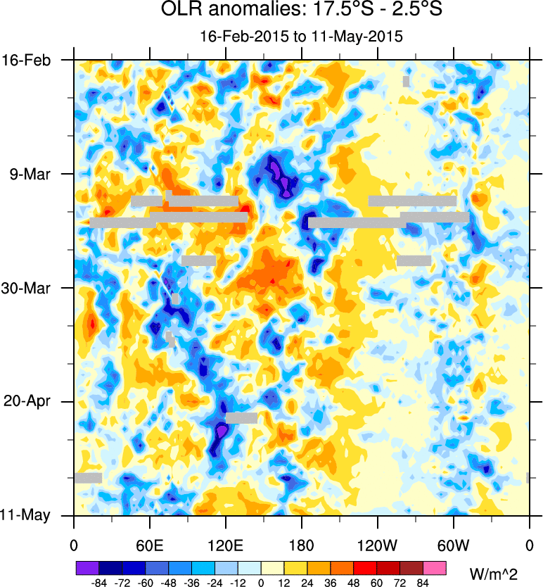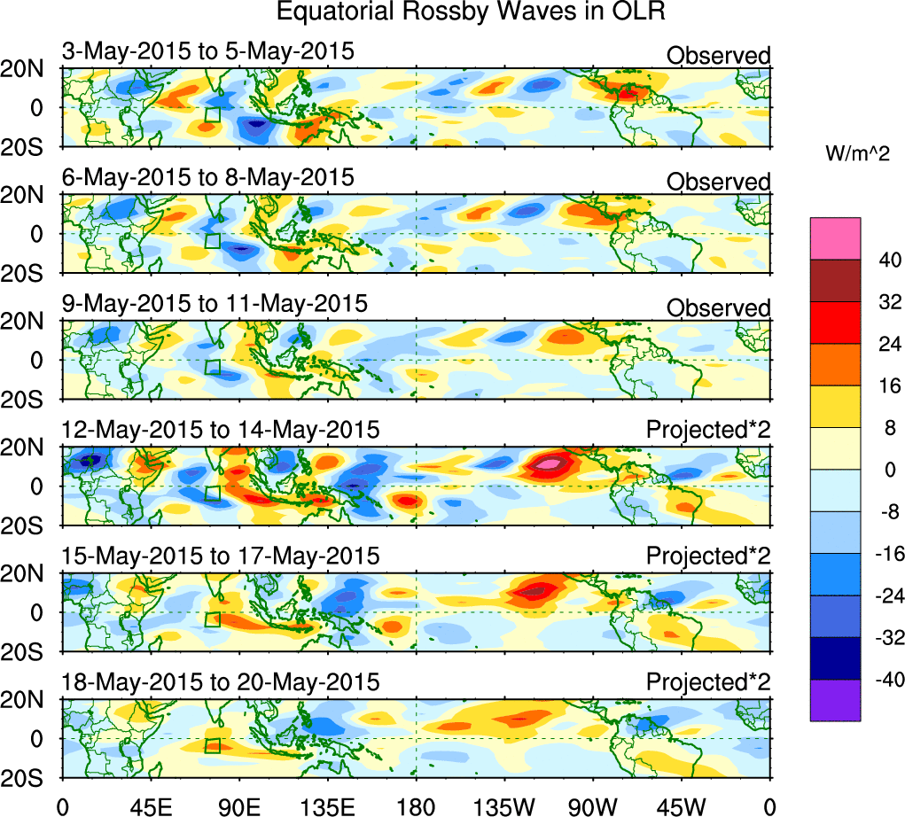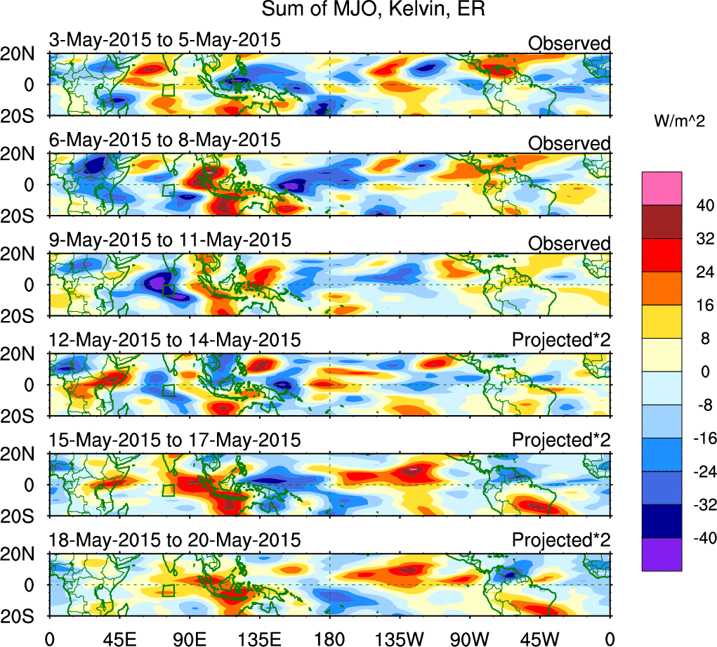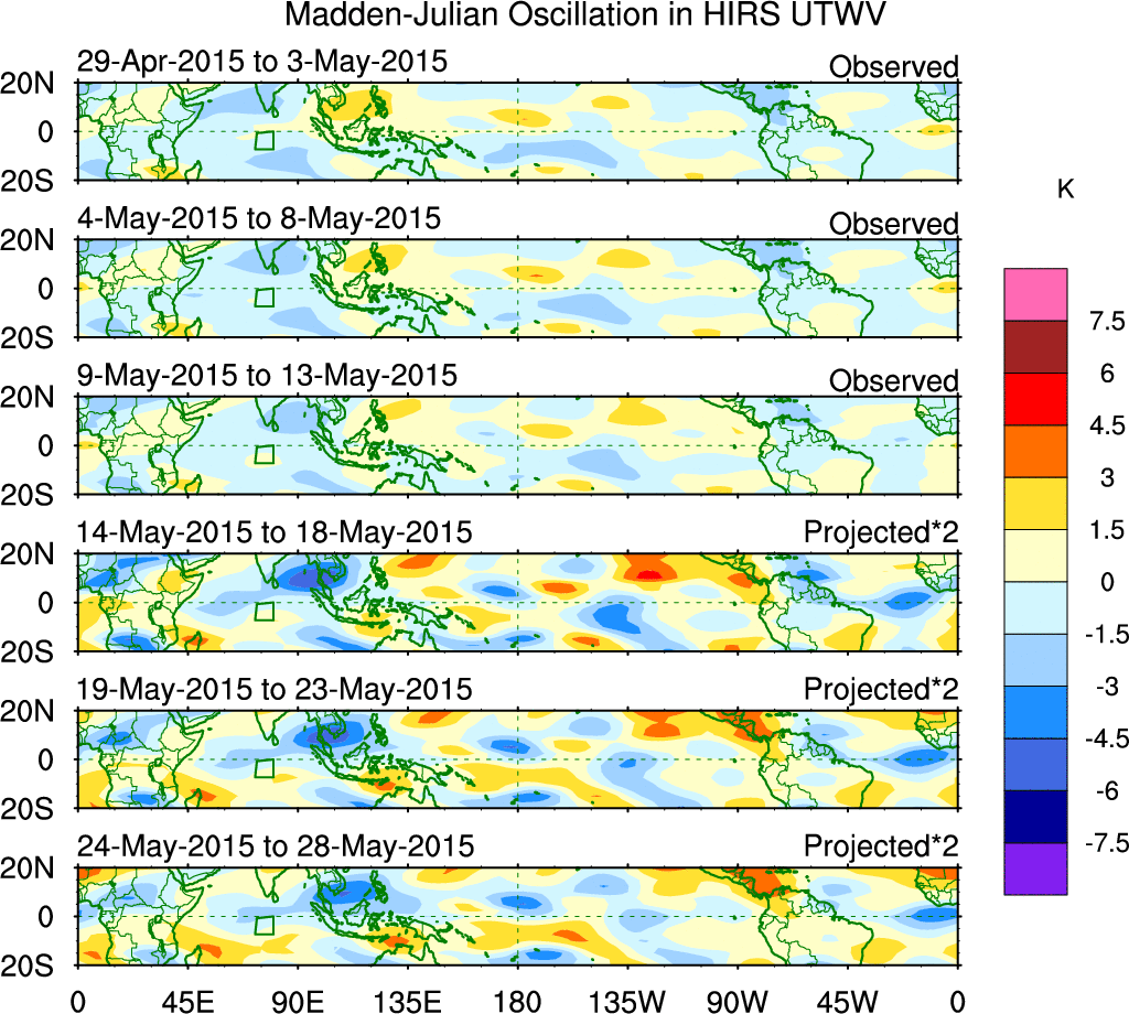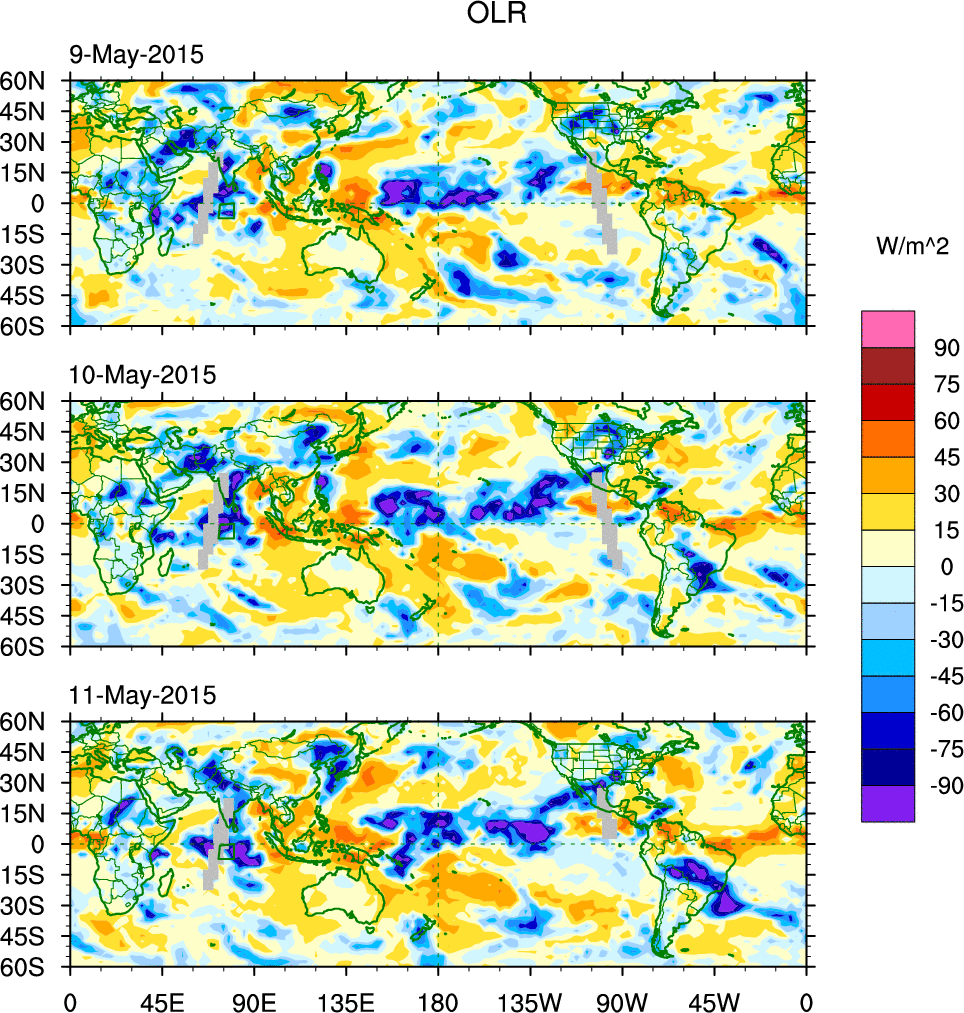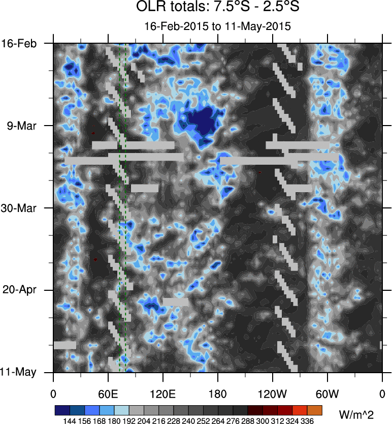 To identify tropical waves in near real-time, the OLR and UTWV data are filtered following Wheeler & Weickmann (2001 MWR). The daily anomalies are calculated using the first 3 harmonics of the seasonal cycle for 1979–2009. Missing values are then filled using linear interpolation in space and time. The most recent 365 days of anomalies are padded with 659 days of zeroes, and the result is filtered for each wave type.