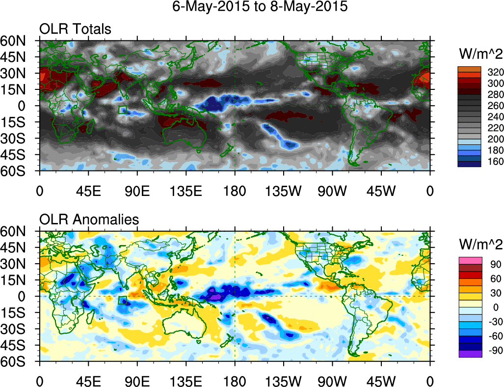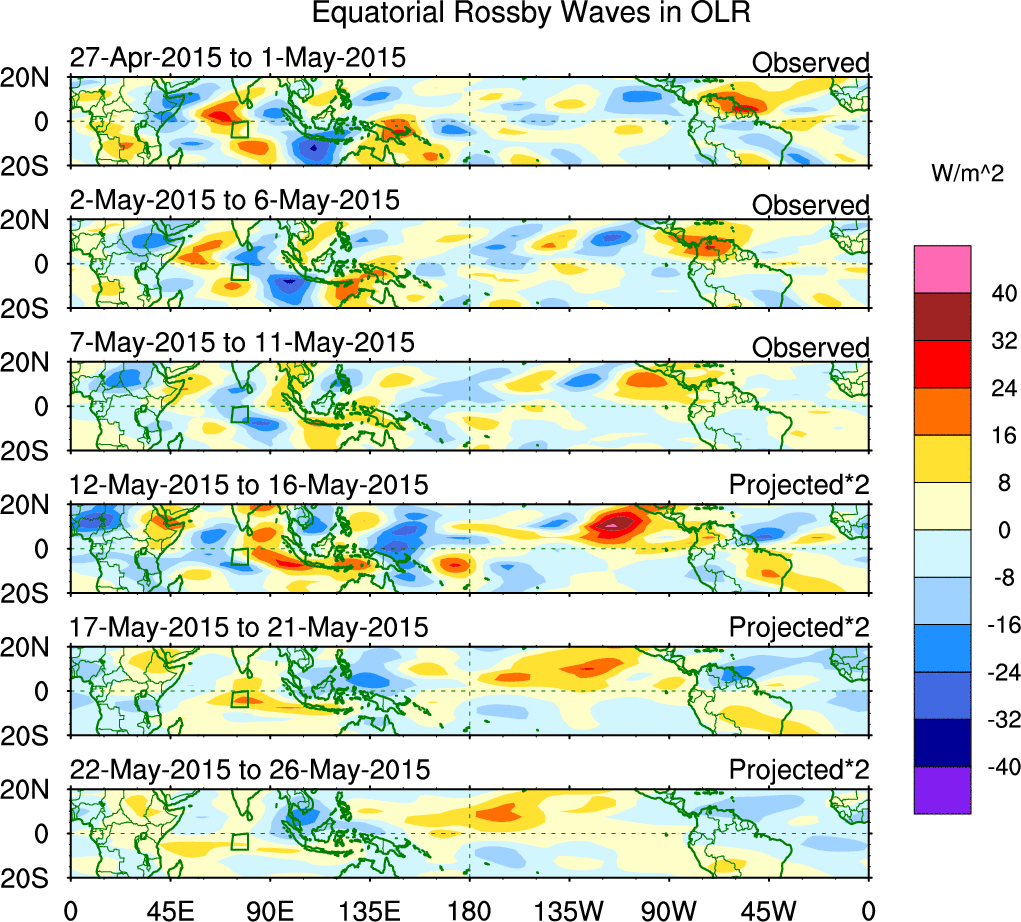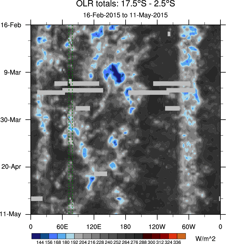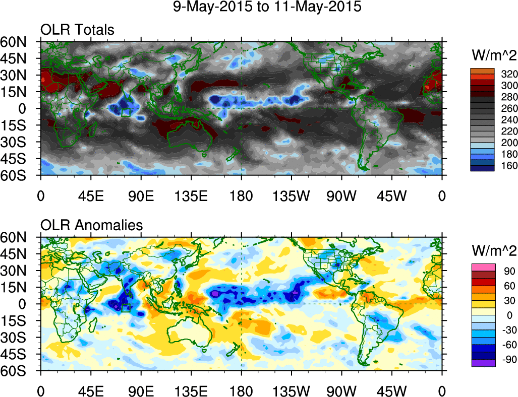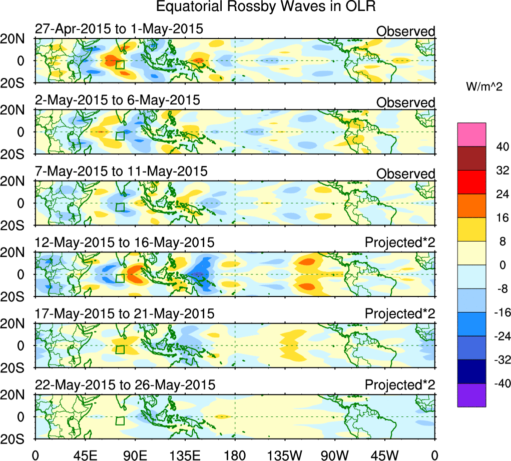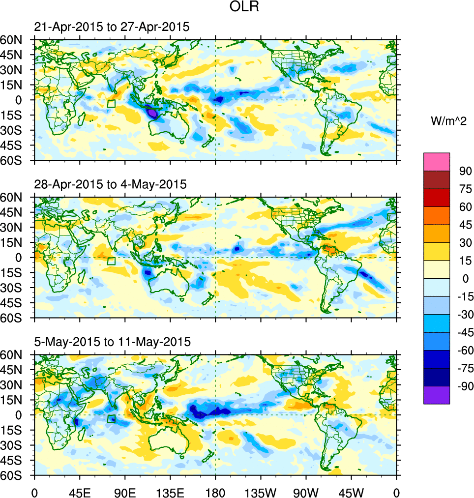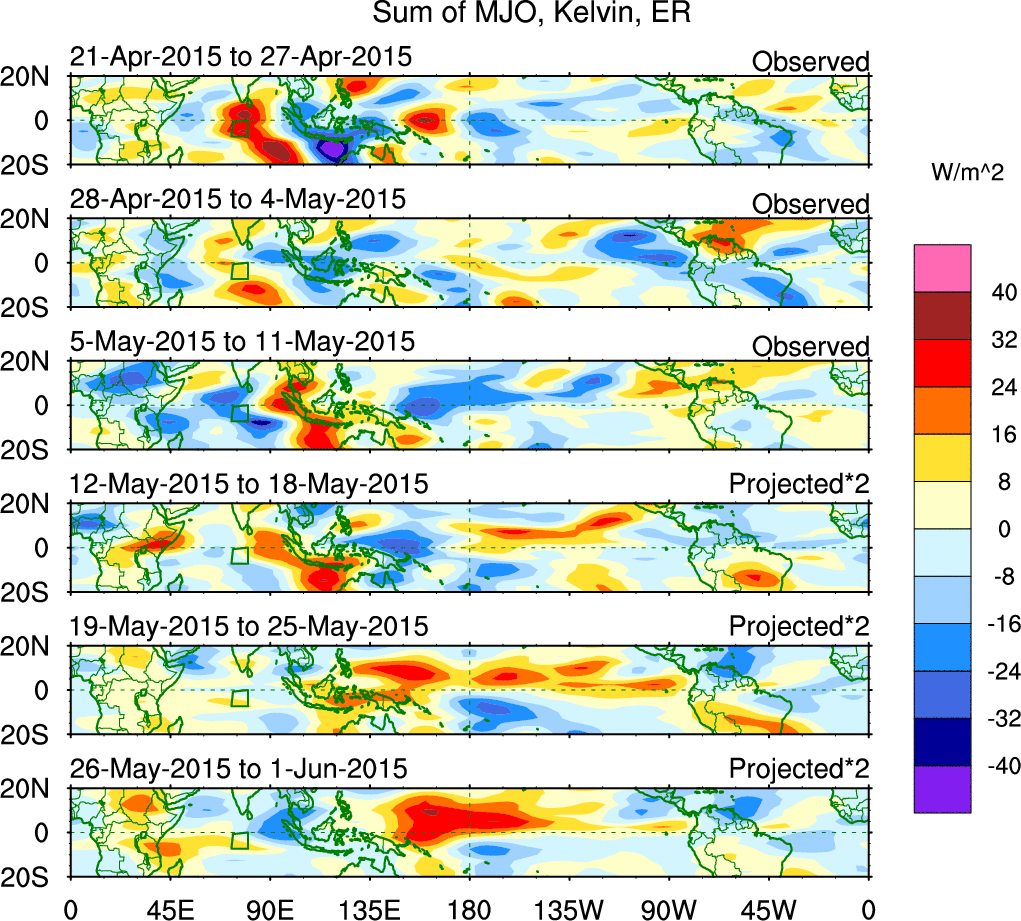 To identify tropical waves in near real-time, the OLR and UTWV data are filtered following Wheeler & Weickmann (2001 MWR). The daily anomalies are calculated using the first 3 harmonics of the seasonal cycle for 1979–2009. Missing values are then filled using linear interpolation in space and time. The most recent 365 days of anomalies are padded with 659 days of zeroes, and the result is filtered for each wave type.