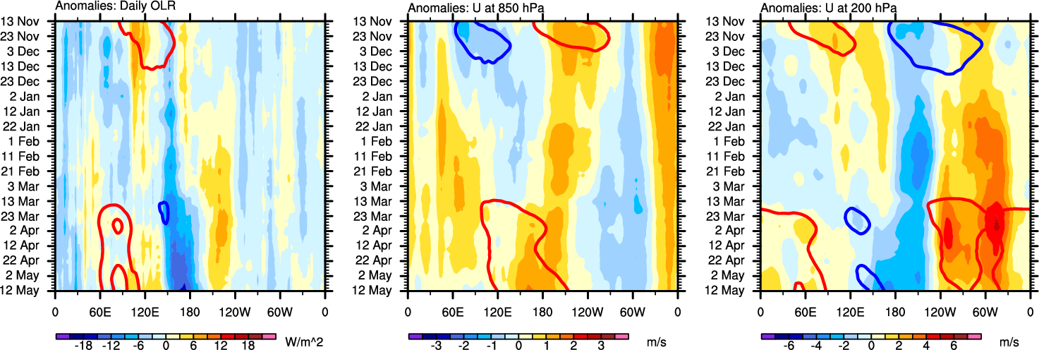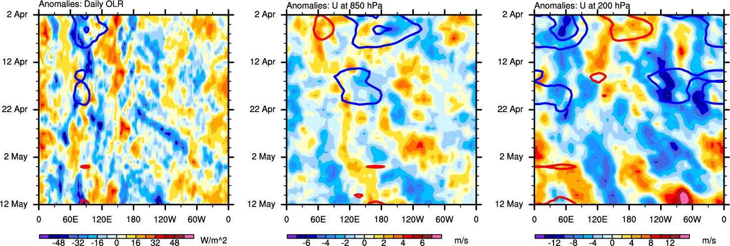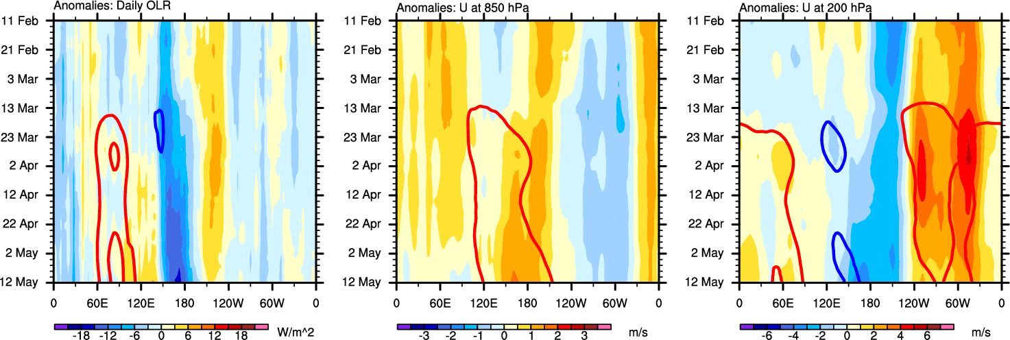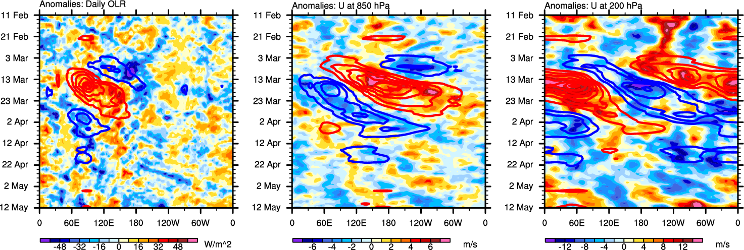 The Hovmöllers show longitude-time plots for OLR, U-850, and U-200. The shading indicates the observed anomalies, while the contours are the projection of those anomalies onto the RMM EOFs.