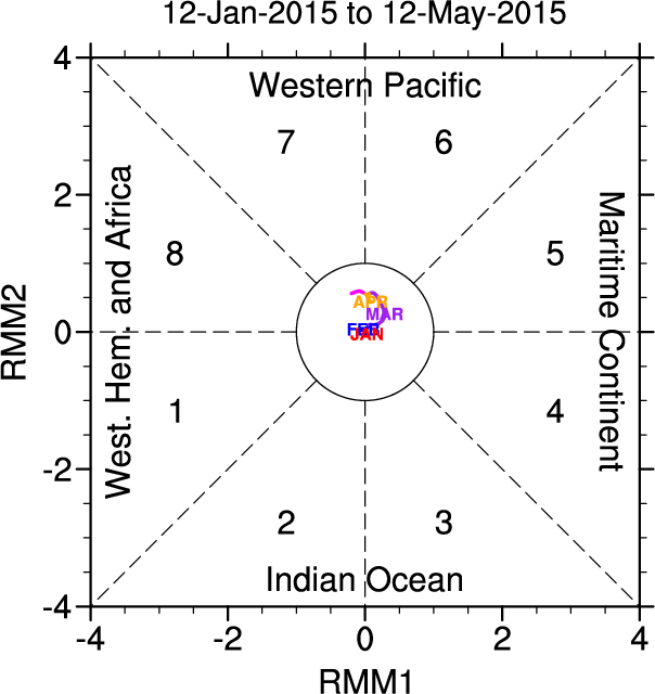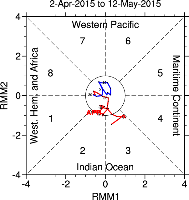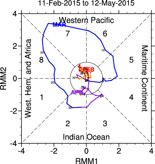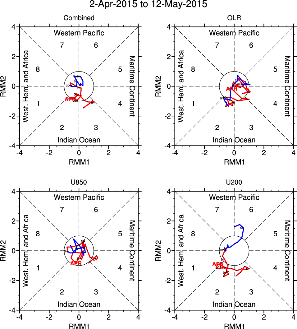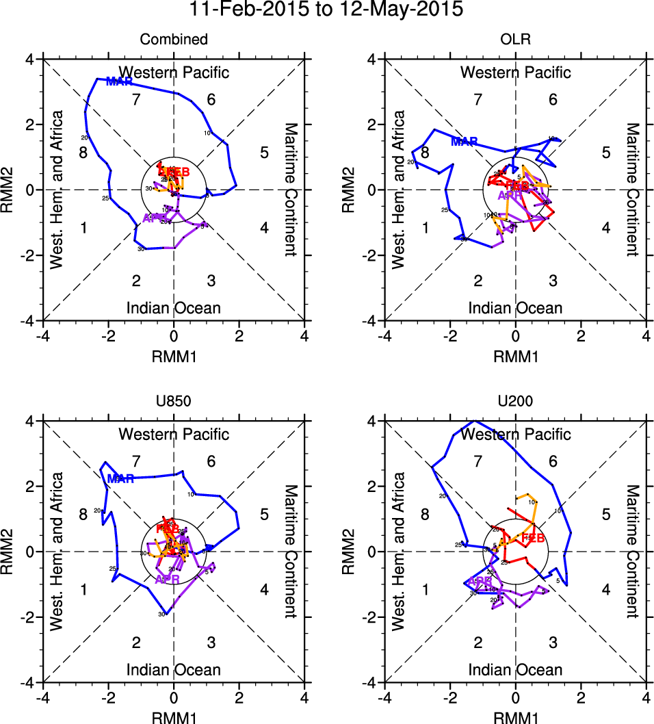 Wheeler and Hendon (2004) constructed the RMM index for monitoring the MJO. This index consists of the first two principal components (PCs) of OLR, 850-hPa zonal wind, and 200-hPa zonal wind averaged 15S-15N.
