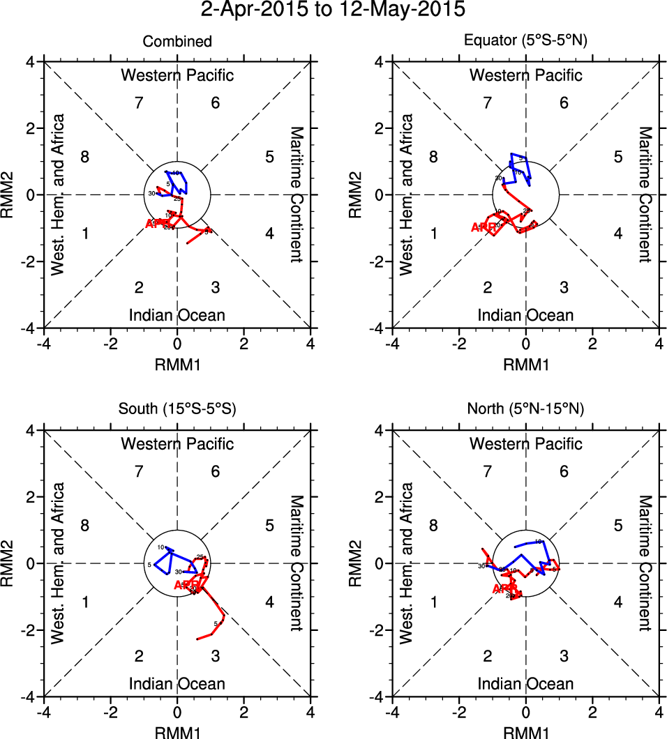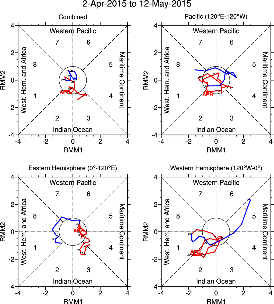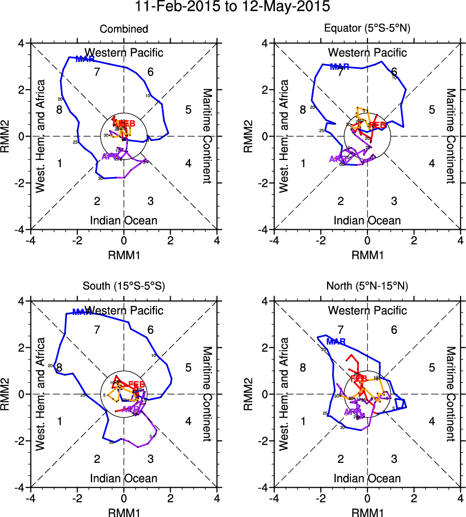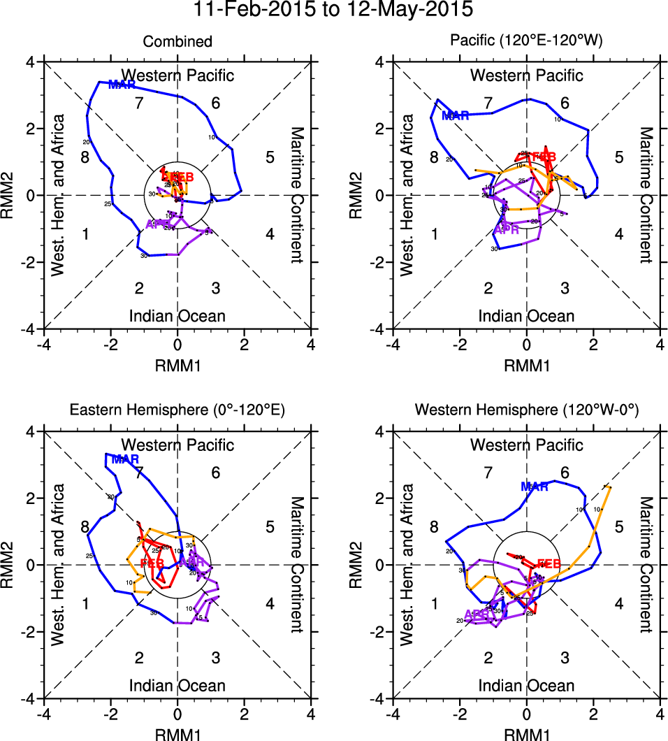 Wheeler and Hendon (2004) constructed the RMM index for monitoring the MJO. This index consists of the first two principal components (PCs) of OLR, 850-hPa zonal wind, and 200-hPa zonal wind averaged 15S-15N.