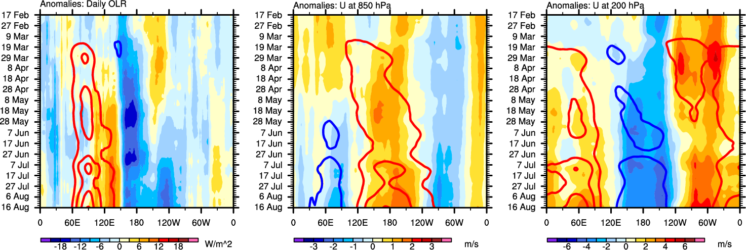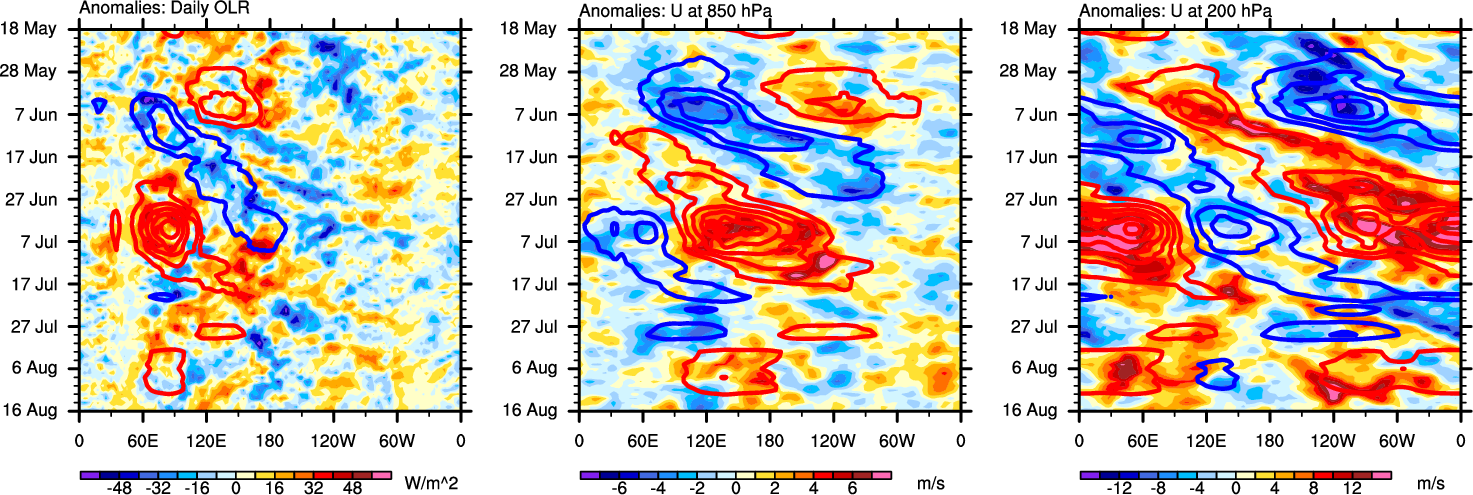 The Hovmöllers show longitude-time plots for OLR, U-850, and U-200. The shading indicates the observed anomalies, while the contours are the projection of those anomalies onto the RMM EOFs.