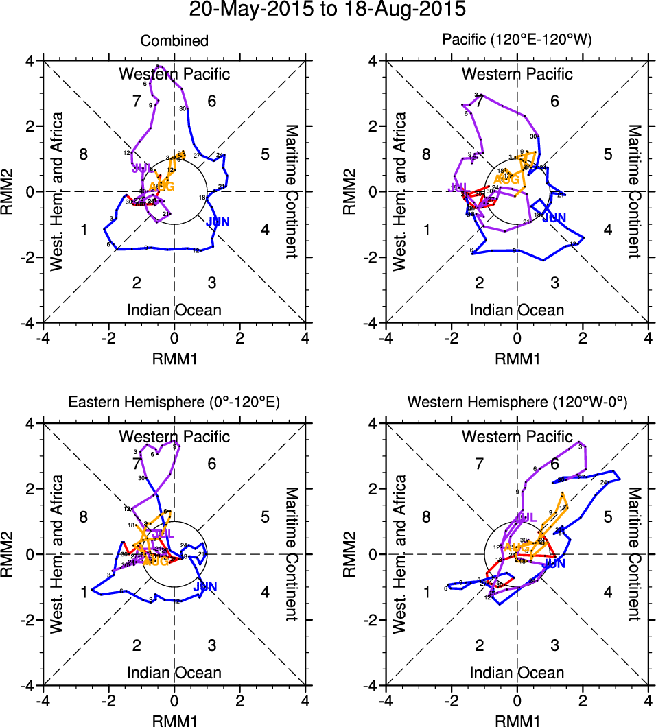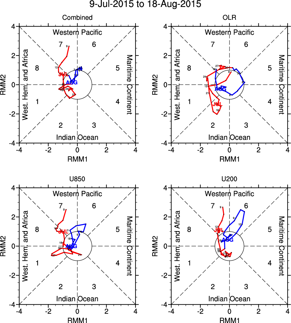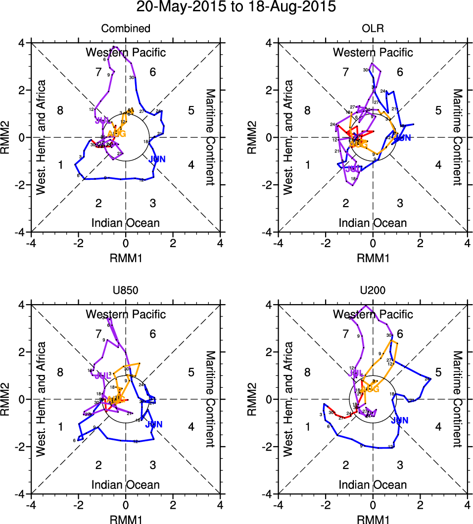 Wheeler and Hendon (2004) constructed the RMM index for monitoring the MJO. This index consists of the first two principal components (PCs) of OLR, 850-hPa zonal wind, and 200-hPa zonal wind averaged 15S-15N.