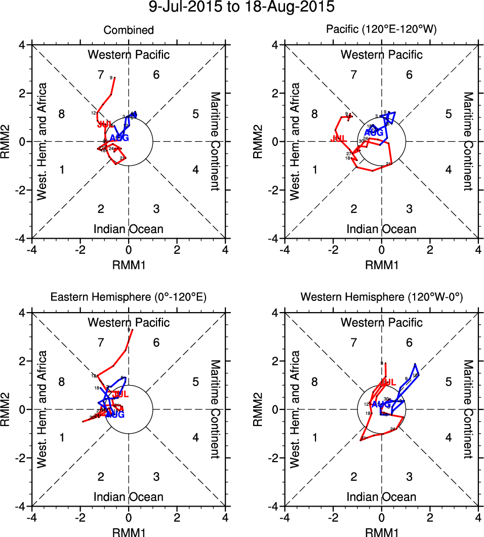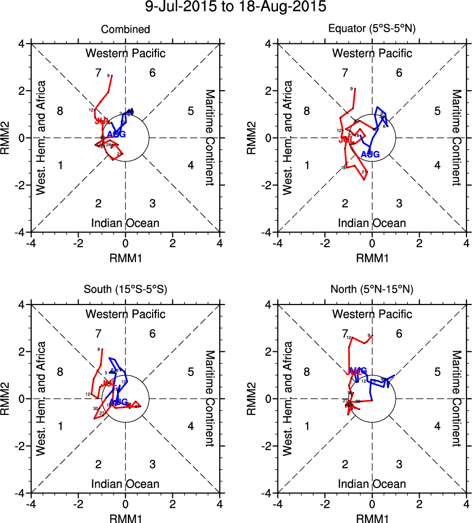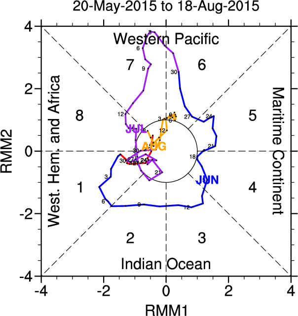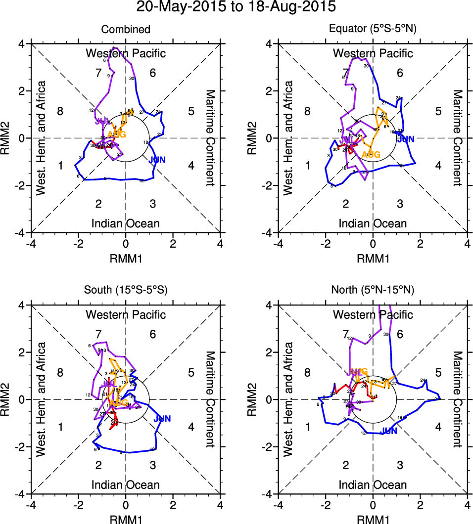 Wheeler and Hendon (2004) constructed the RMM index for monitoring the MJO. This index consists of the first two principal components (PCs) of OLR, 850-hPa zonal wind, and 200-hPa zonal wind averaged 15S-15N.