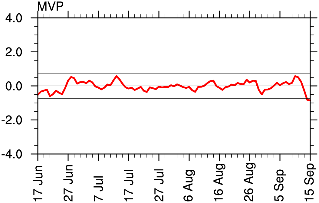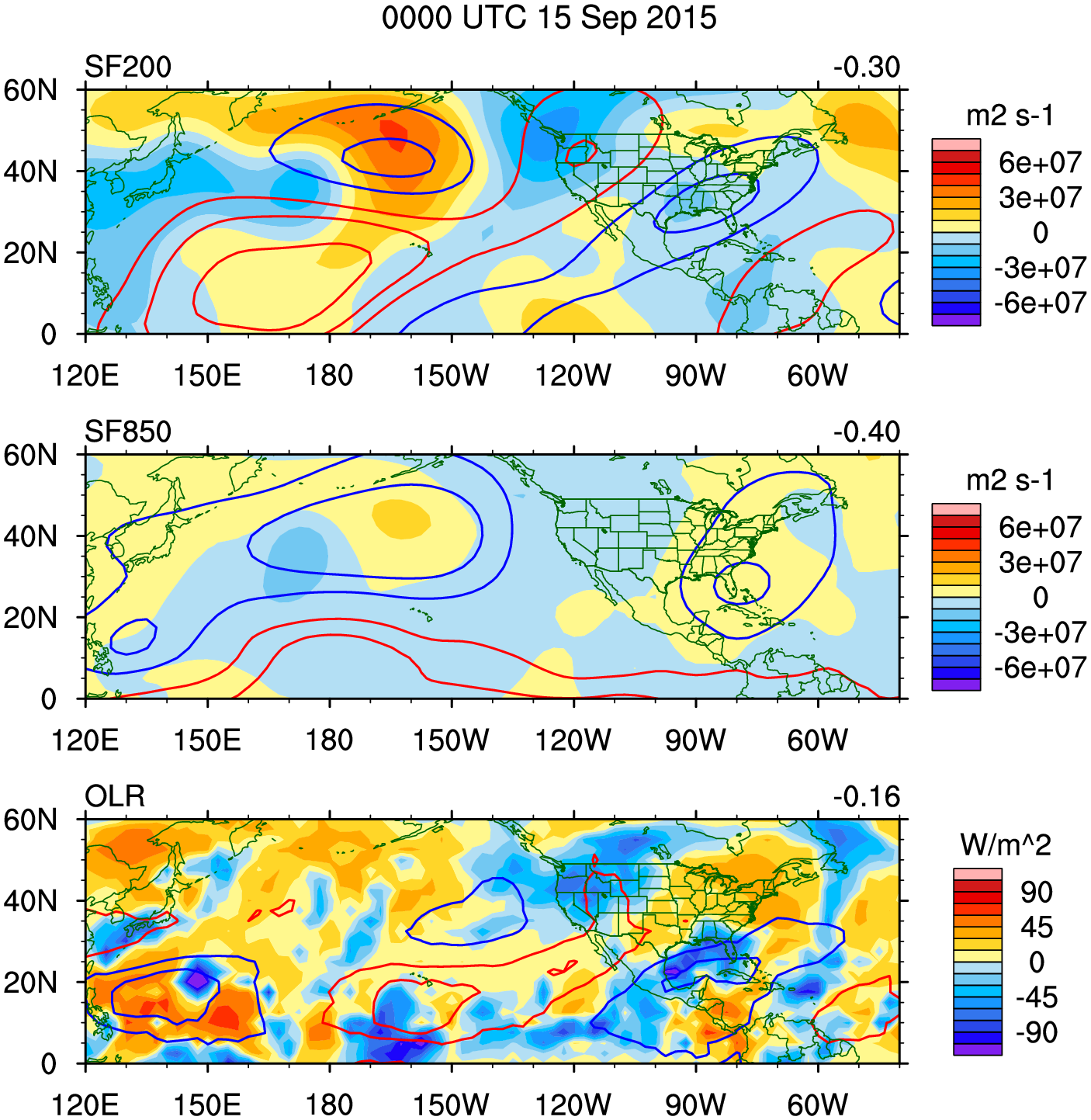 Map of the Multivariate PNA (MVP): Contours identify the EOF loading pattern for OLR and streamfunction while the shading shows the observed anomalies.