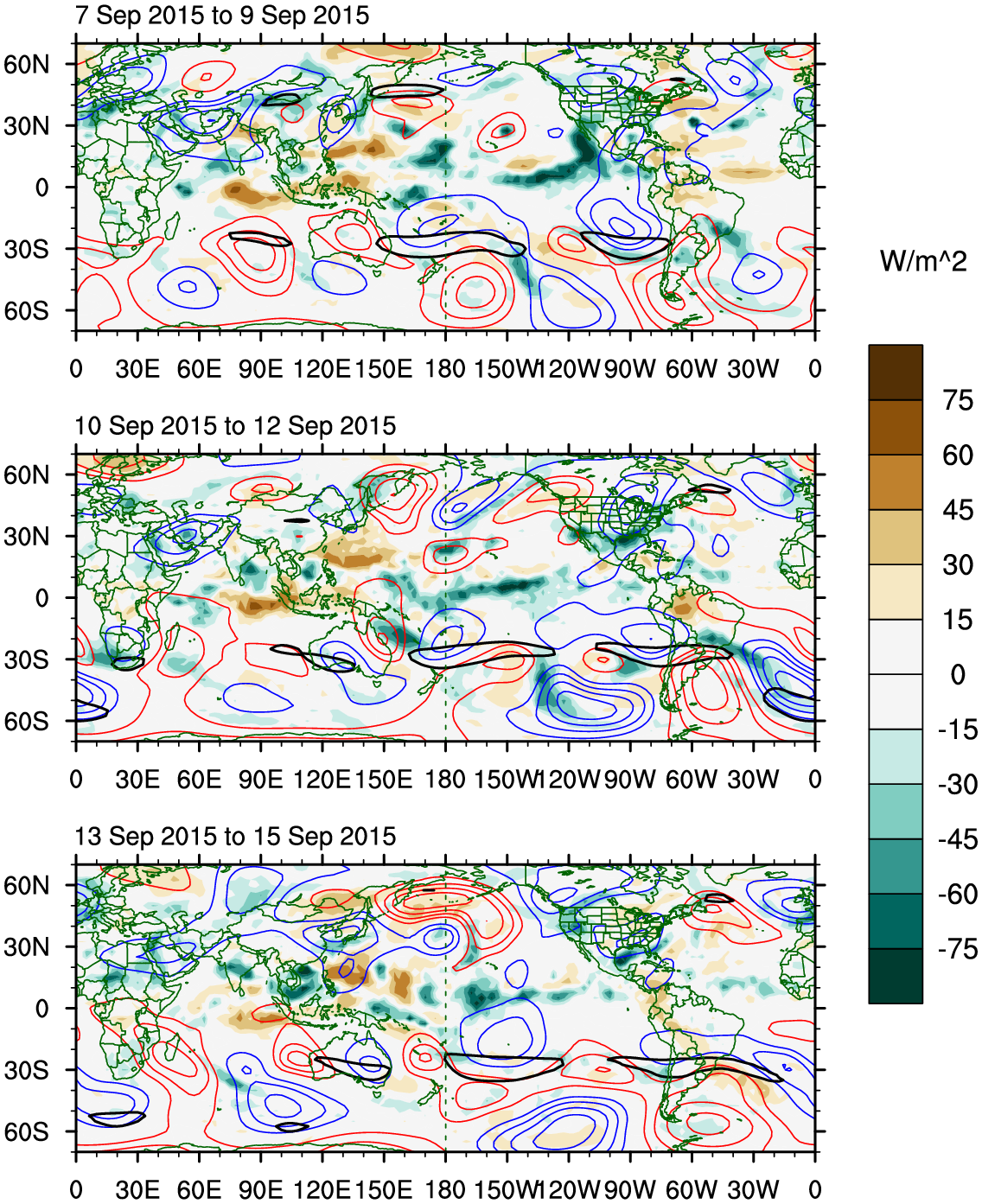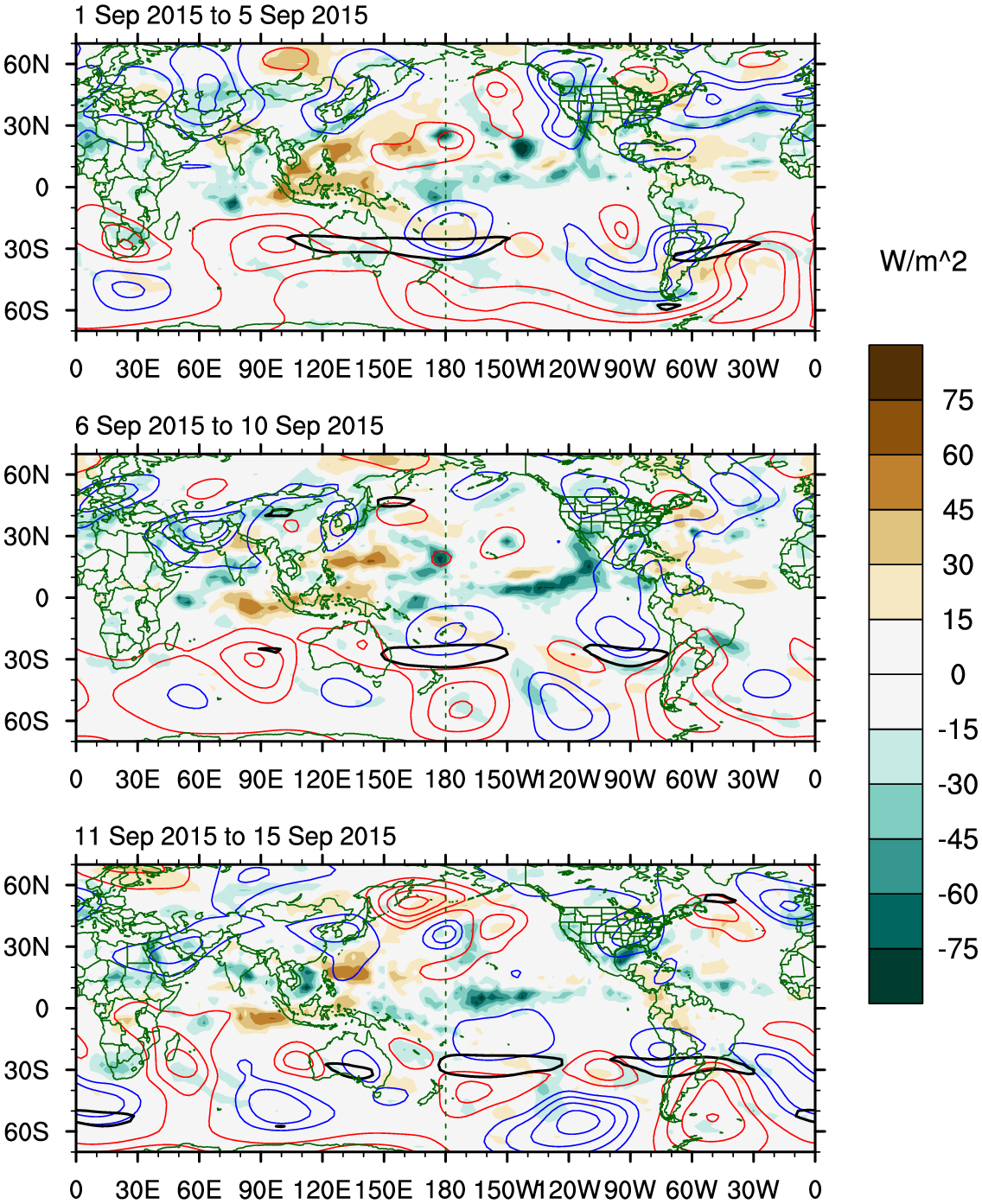 Maps of recent OLR anomalies (shaded), 200-hPa streamfunction anomalies (contours), and 200-hPa total zonal wind (black contour at 50 m/s)