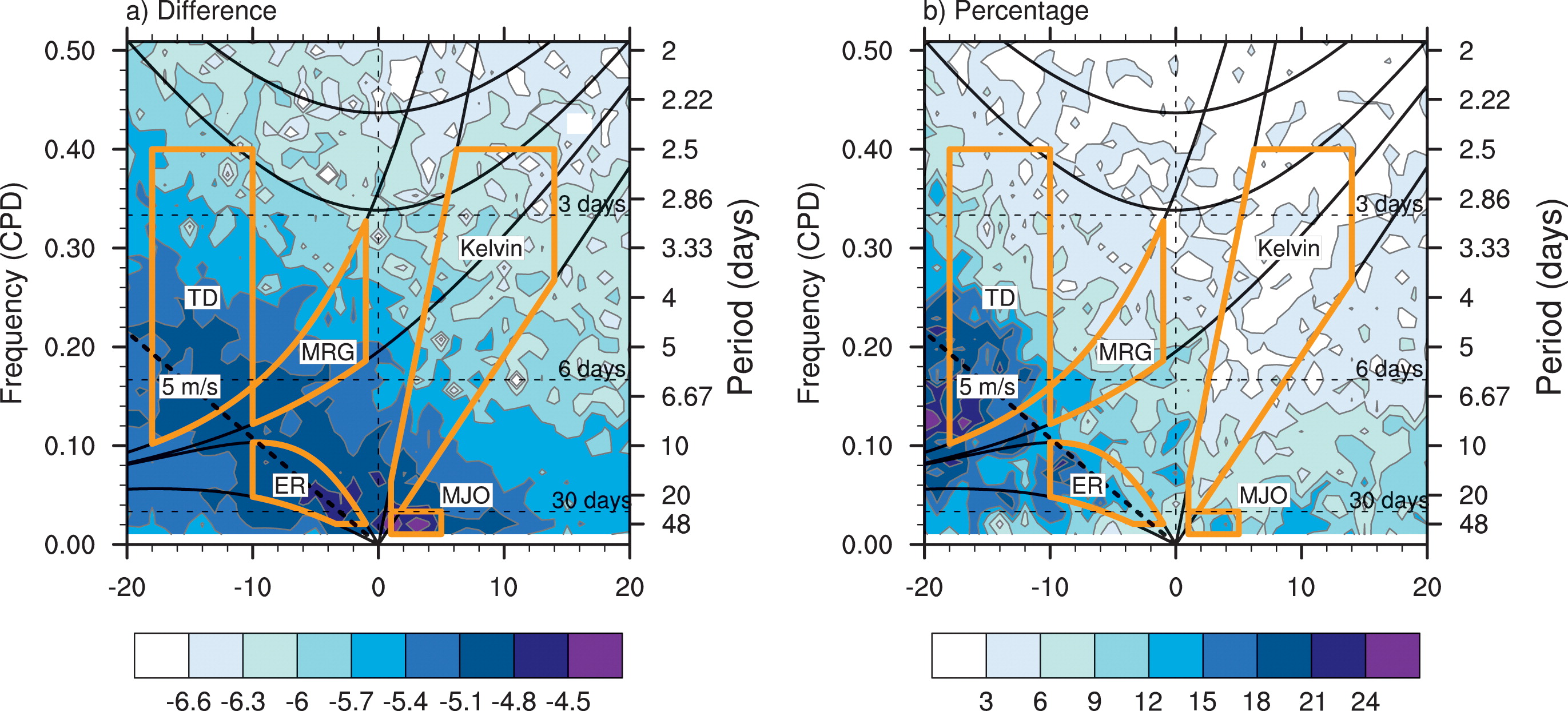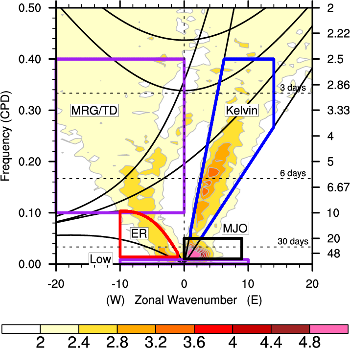 Wheeler and Weickmann (2001) developed a method for filtering OLR in real-time to identify, track, and predict the MJO and equatorial waves. This webpage expands on their methodology and applies it to other variables. The filter bands used can be seen on this wavenumber—frequency spectrum.